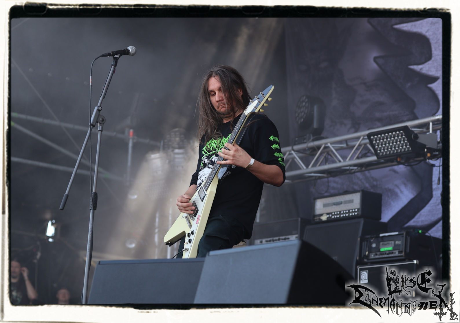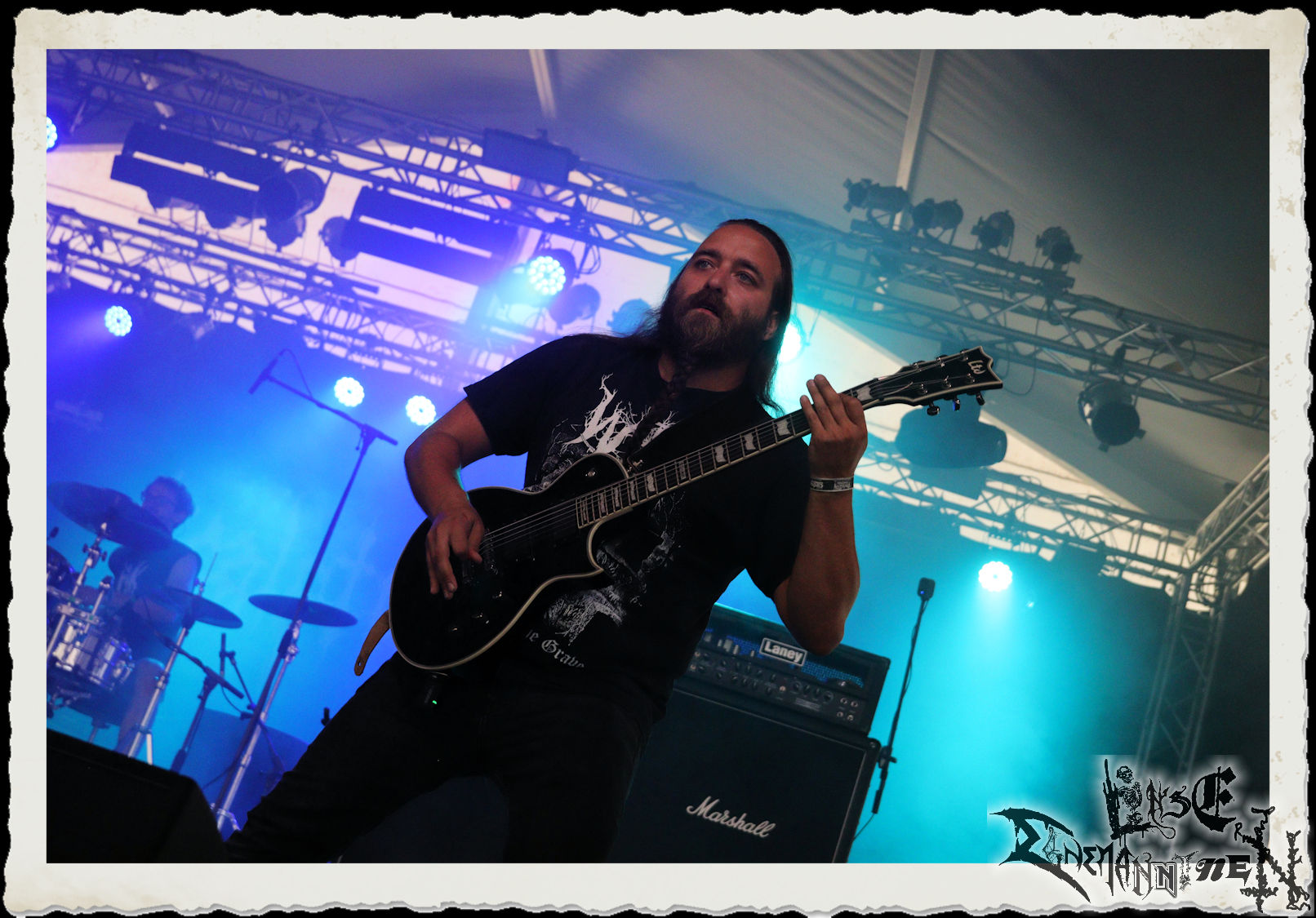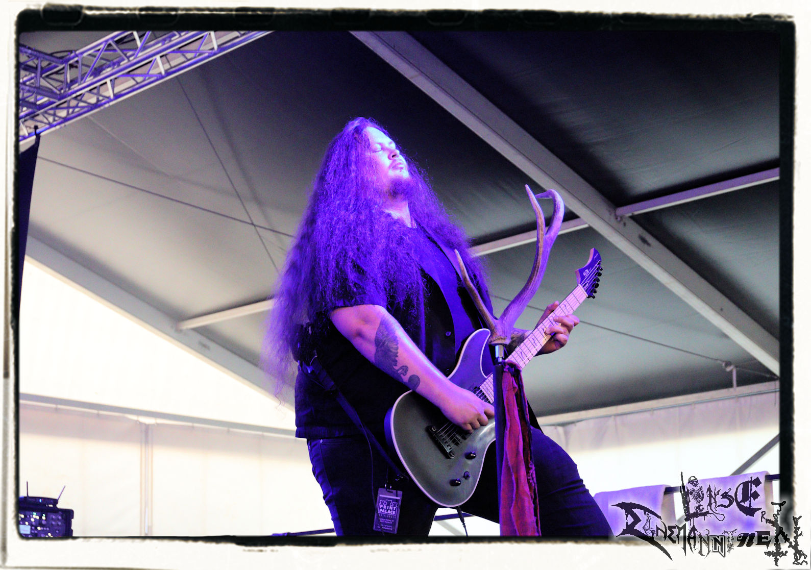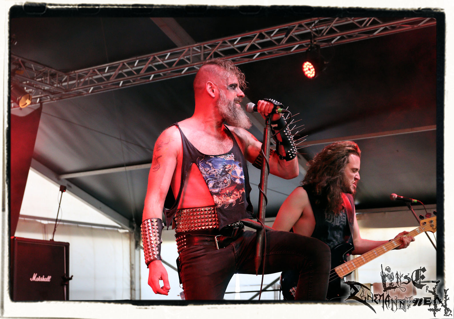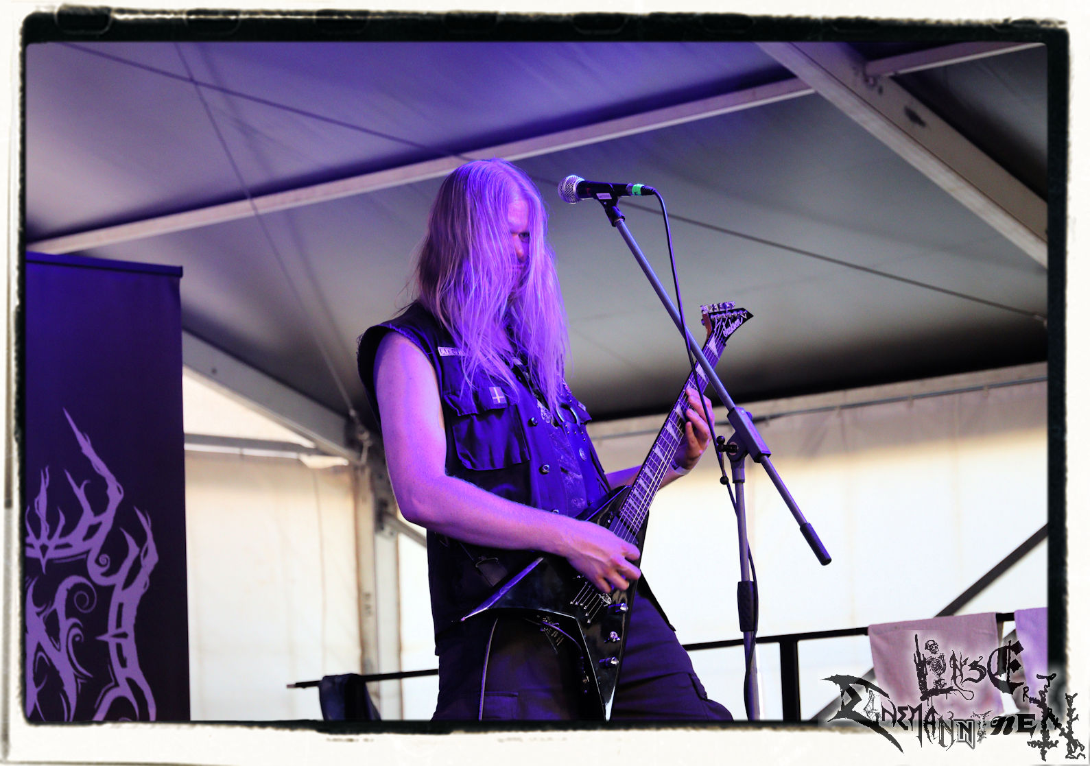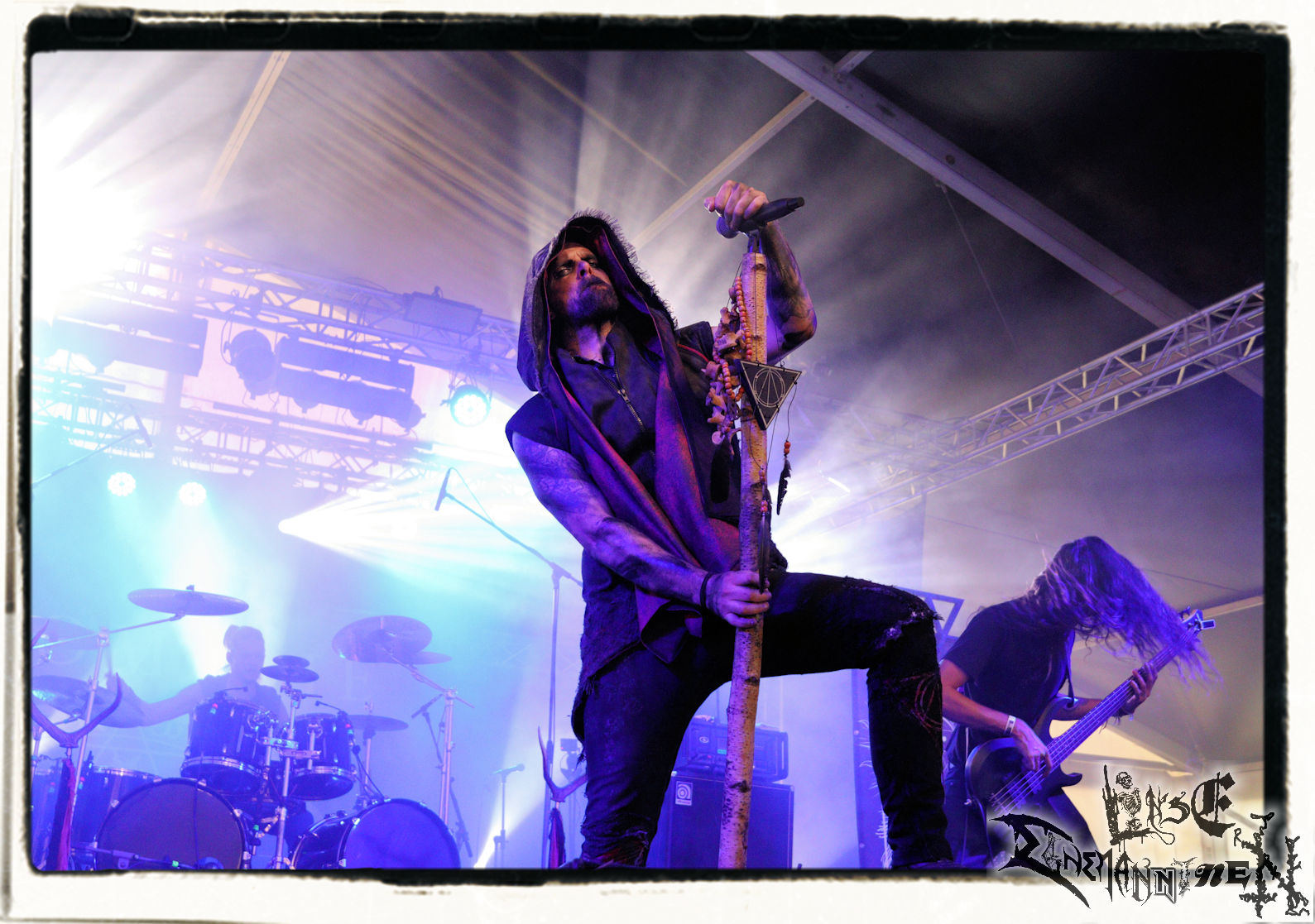 Mit EIS wird der Abend eingeläutet. Die Band aus dem Lupus Lounge – Stall ist wie geschaffen für das Zelt auf dem PARTY.SAN METAL OPEN AIR und beweist eindrucksvoll, wie man Atmosphäre mit mitreißenden Black Metal – Songs kombiniert. Bandkopf Alboin ist gleichzeitig Fan und Vollblutmusiker, der mit den Schwarzmetall-Größen der Neunziger aufgewachsen ist, wobei seine Musik sowohl von diesen, als auch von seiner Bewunderung gegenüber prägenden heimischen Acts wie Helrunar oder auch dem Wirken von Schwadorf mit Sun Of The Sleepless beeinflusst ist. Auch macht er keinen Hehl daraus, dass ihm die Einladung nach Schlotheim mit seiner Band als "Spätberufenem" sehr viel bedeutet. Und diese Haltung schwingt in diesem Konzert mit. Egal, ob Songs vom 2005er-Album "Galeere" ("Durch lichtlose Tiefen", seinerzeit noch unter dem Bandvorgänger Geist veröffentlicht (aus namensrechtlichen Gründen musste man sich danach in Eis umbenennen), vom bisher jüngsten Album "Bannstein" oder vom Klassiker "Wetterkreuz" (2012), der heuer auch schon zehn Jahre auf dem Buckel hat, gespielt werden. Eis zünden ein kleines Highlight, das mir noch lange in Erinnerung bleiben und mich animiert, mir die Scheiben mal wieder zu Gemüte zu führen. Danke!(JD)