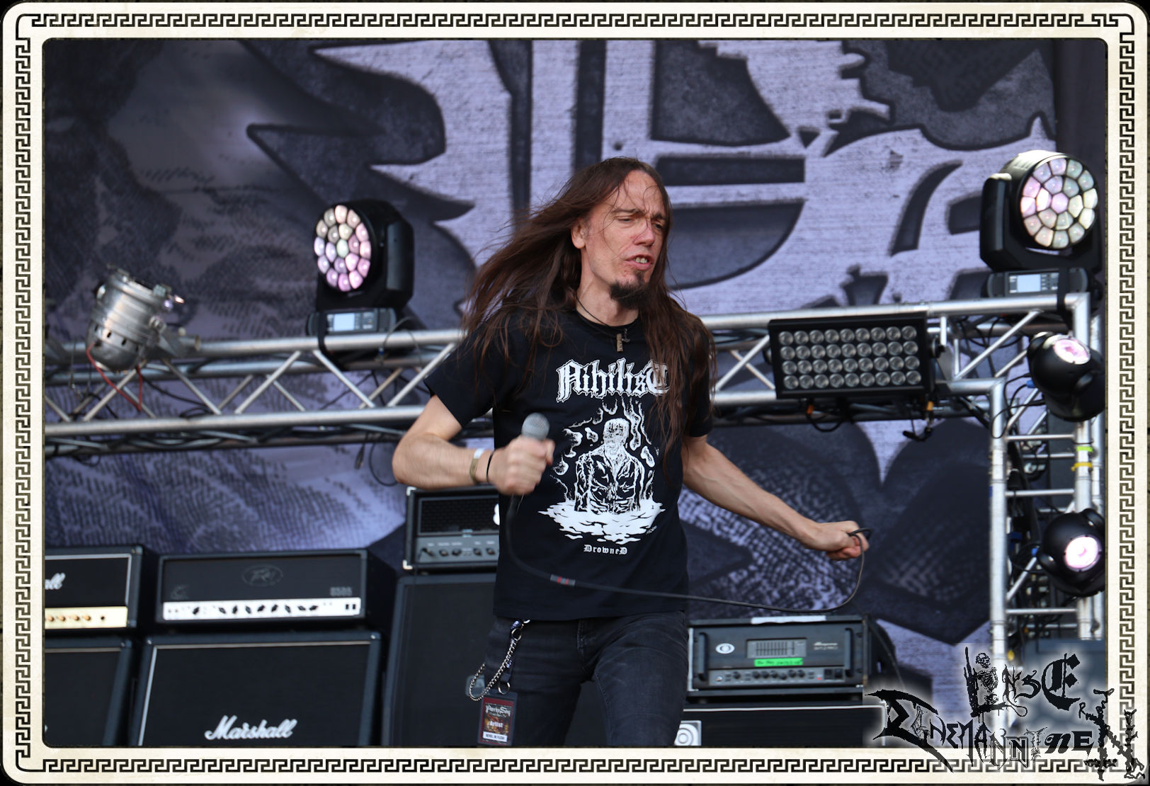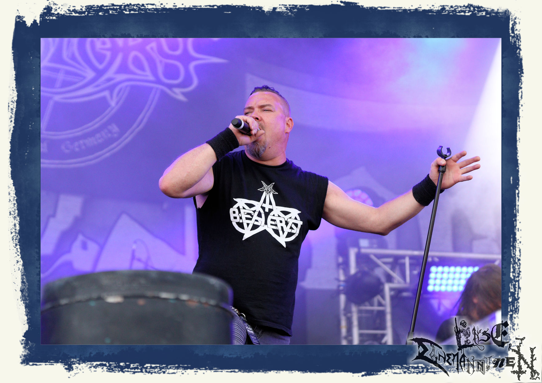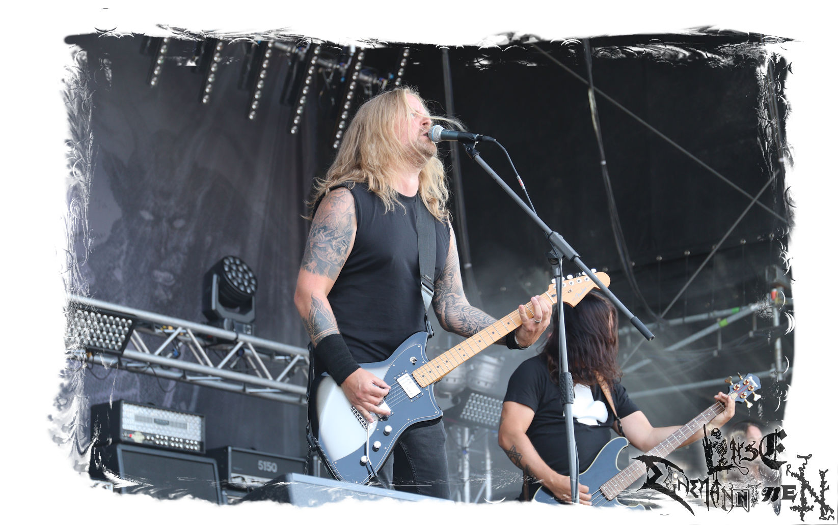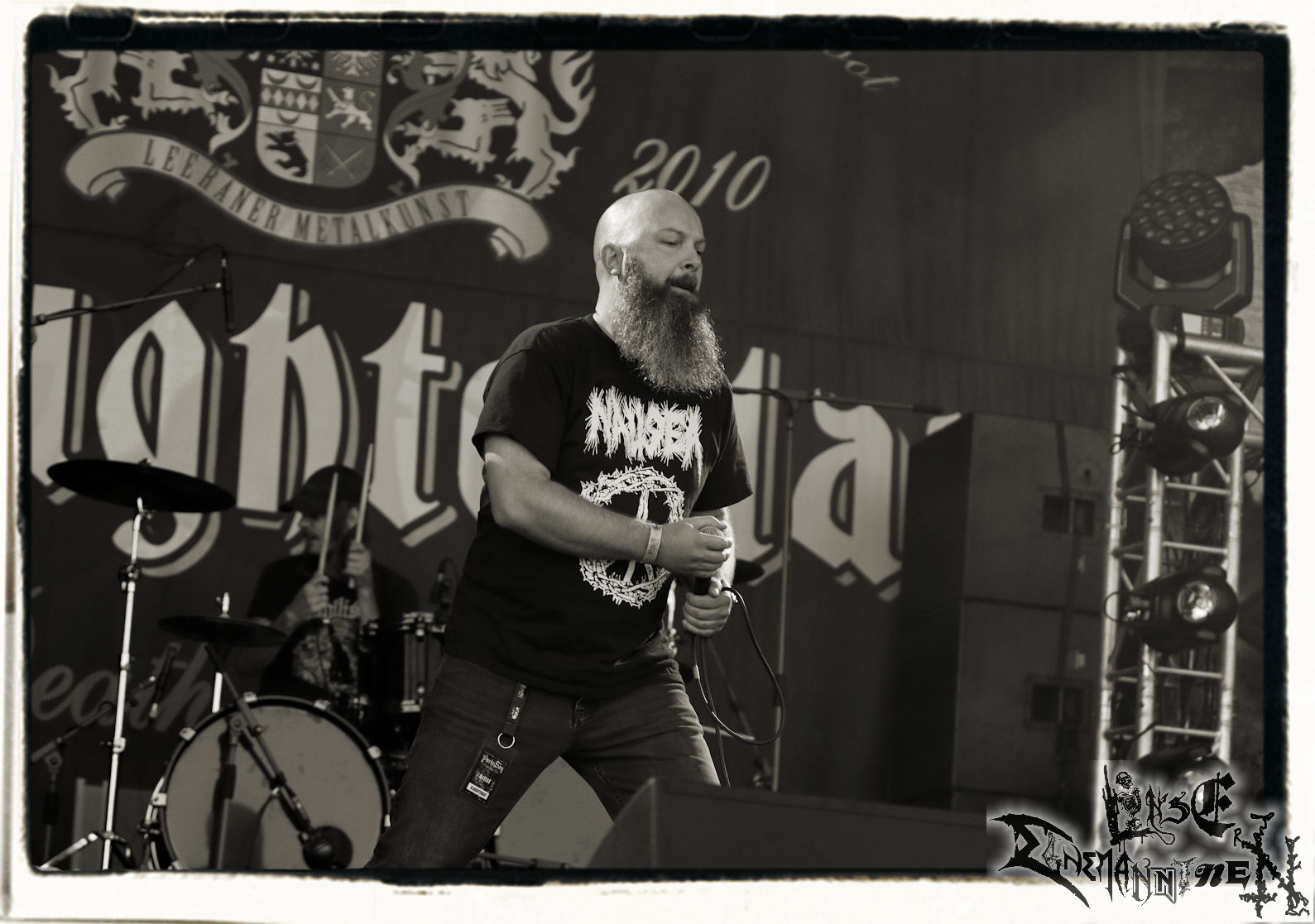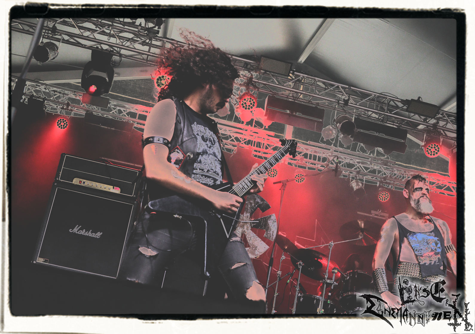 Mit EIS wird der Abend eingeläutet. Die Band aus dem Lupus Lounge – Stall ist wie geschaffen für das Zelt auf dem PARTY.SAN METAL OPEN AIR und beweist eindrucksvoll, wie man Atmosphäre mit mitreißenden Black Metal – Songs kombiniert. Bandkopf Alboin ist gleichzeitig Fan und Vollblutmusiker, der mit den Schwarzmetall-Größen der Neunziger aufgewachsen ist, wobei seine Musik sowohl von diesen, als auch von seiner Bewunderung gegenüber prägenden heimischen Acts wie Helrunar oder auch dem Wirken von Schwadorf mit Sun Of The Sleepless beeinflusst ist. Auch macht er keinen Hehl daraus, dass ihm die Einladung nach Schlotheim mit seiner Band als "Spätberufenem" sehr viel bedeutet. Und diese Haltung schwingt in diesem Konzert mit. Egal, ob Songs vom 2005er-Album "Galeere" ("Durch lichtlose Tiefen", seinerzeit noch unter dem Bandvorgänger Geist veröffentlicht (aus namensrechtlichen Gründen musste man sich danach in Eis umbenennen), vom bisher jüngsten Album "Bannstein" oder vom Klassiker "Wetterkreuz" (2012), der heuer auch schon zehn Jahre auf dem Buckel hat, gespielt werden. Eis zünden ein kleines Highlight, das mir noch lange in Erinnerung bleiben und mich animiert, mir die Scheiben mal wieder zu Gemüte zu führen. Danke!(JD)