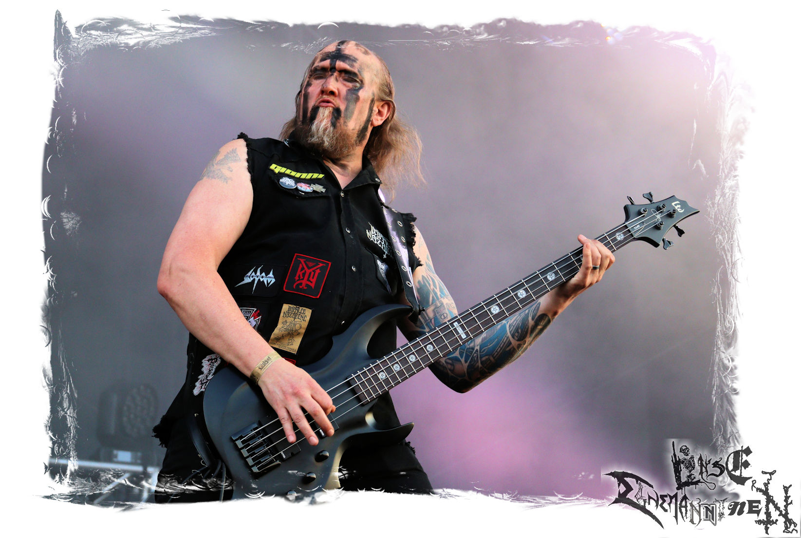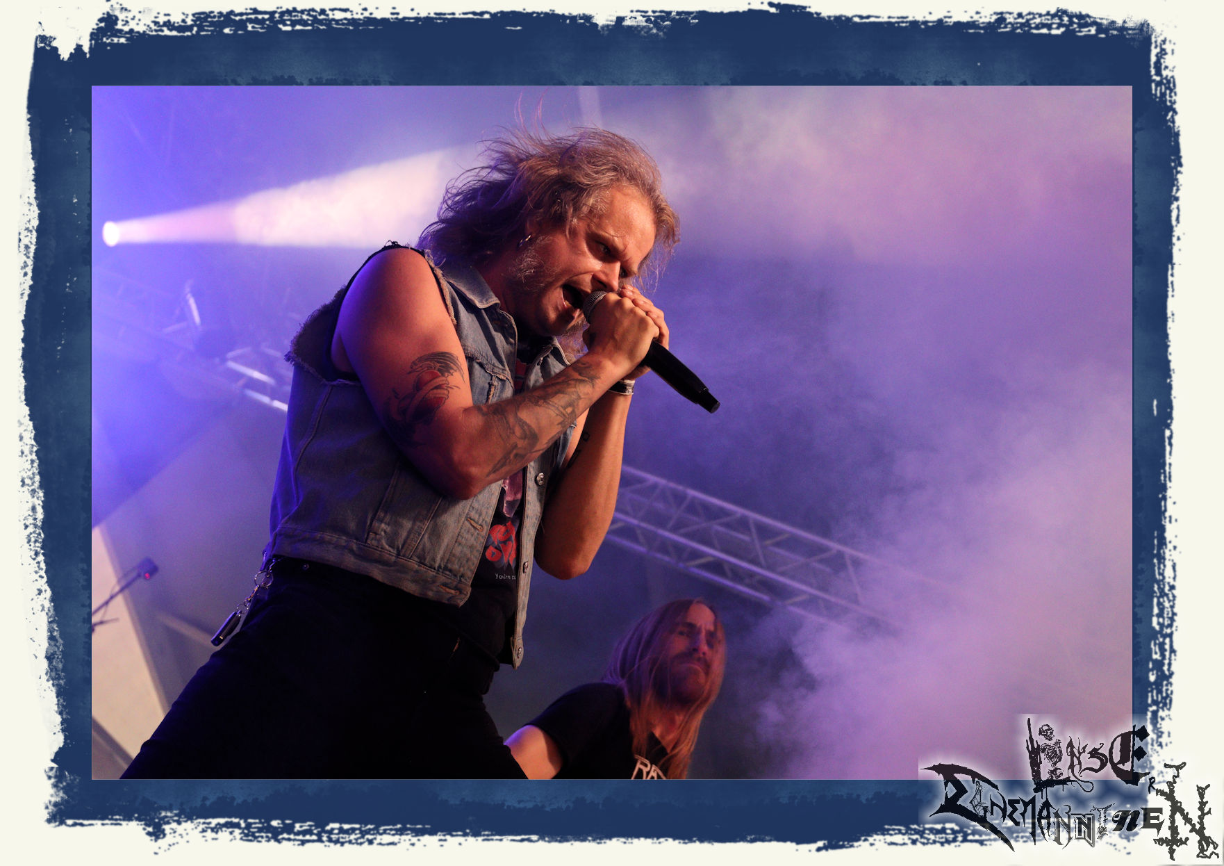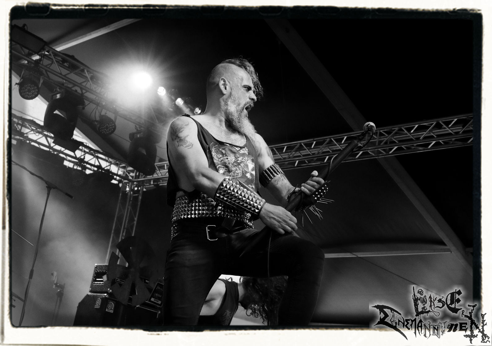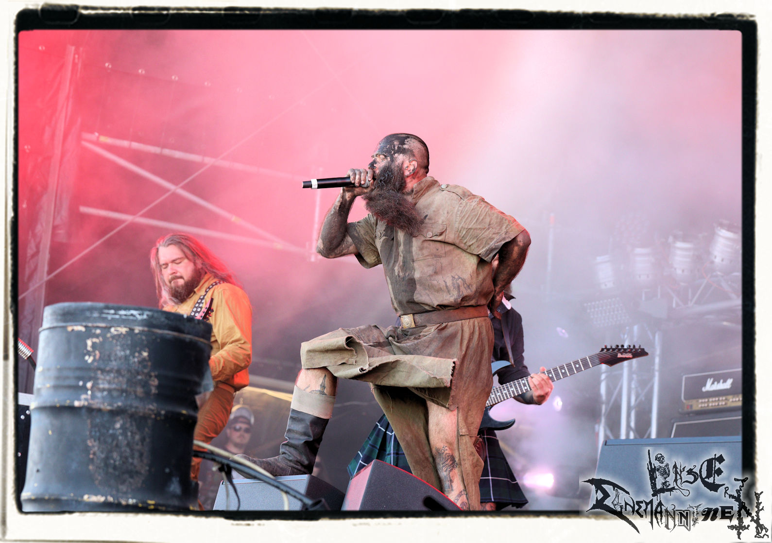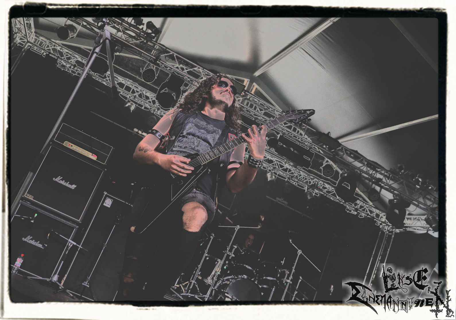 Mit EIS wird der Abend eingeläutet. Die Band aus dem Lupus Lounge – Stall ist wie geschaffen für das Zelt auf dem PARTY.SAN METAL OPEN AIR und beweist eindrucksvoll, wie man Atmosphäre mit mitreißenden Black Metal – Songs kombiniert. Bandkopf Alboin ist gleichzeitig Fan und Vollblutmusiker, der mit den Schwarzmetall-Größen der Neunziger aufgewachsen ist, wobei seine Musik sowohl von diesen, als auch von seiner Bewunderung gegenüber prägenden heimischen Acts wie Helrunar oder auch dem Wirken von Schwadorf mit Sun Of The Sleepless beeinflusst ist. Auch macht er keinen Hehl daraus, dass ihm die Einladung nach Schlotheim mit seiner Band als "Spätberufenem" sehr viel bedeutet. Und diese Haltung schwingt in diesem Konzert mit. Egal, ob Songs vom 2005er-Album "Galeere" ("Durch lichtlose Tiefen", seinerzeit noch unter dem Bandvorgänger Geist veröffentlicht (aus namensrechtlichen Gründen musste man sich danach in Eis umbenennen), vom bisher jüngsten Album "Bannstein" oder vom Klassiker "Wetterkreuz" (2012), der heuer auch schon zehn Jahre auf dem Buckel hat, gespielt werden. Eis zünden ein kleines Highlight, das mir noch lange in Erinnerung bleiben und mich animiert, mir die Scheiben mal wieder zu Gemüte zu führen. Danke!(JD)