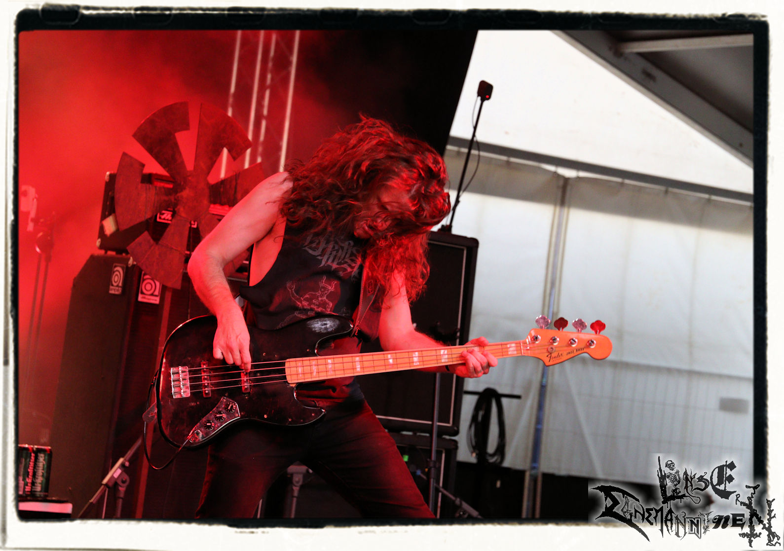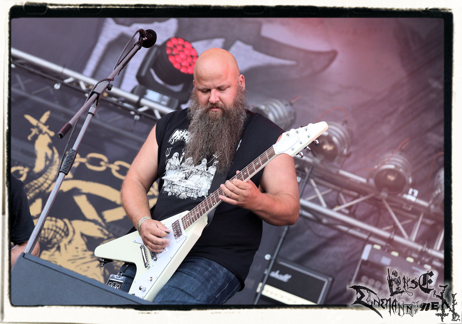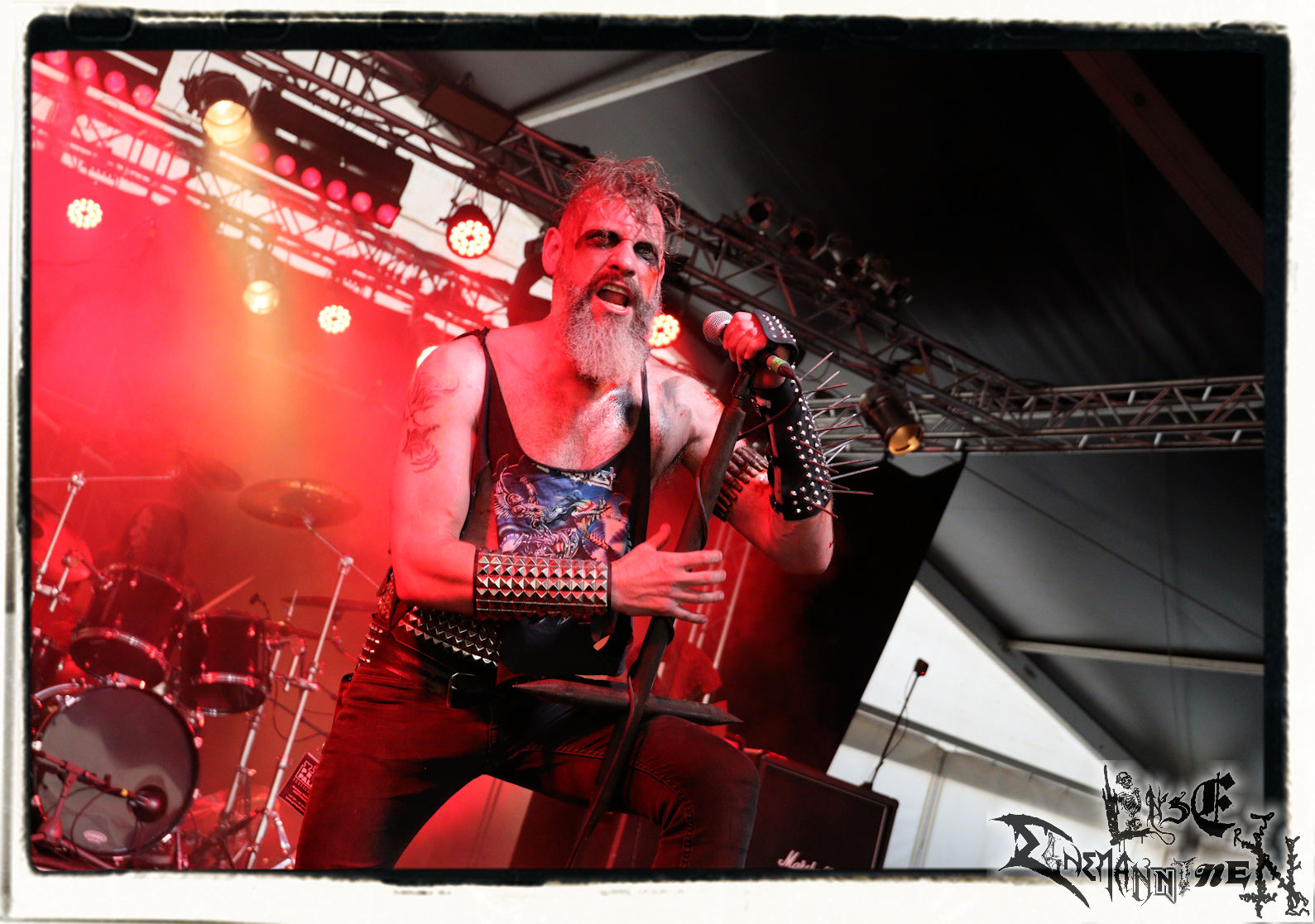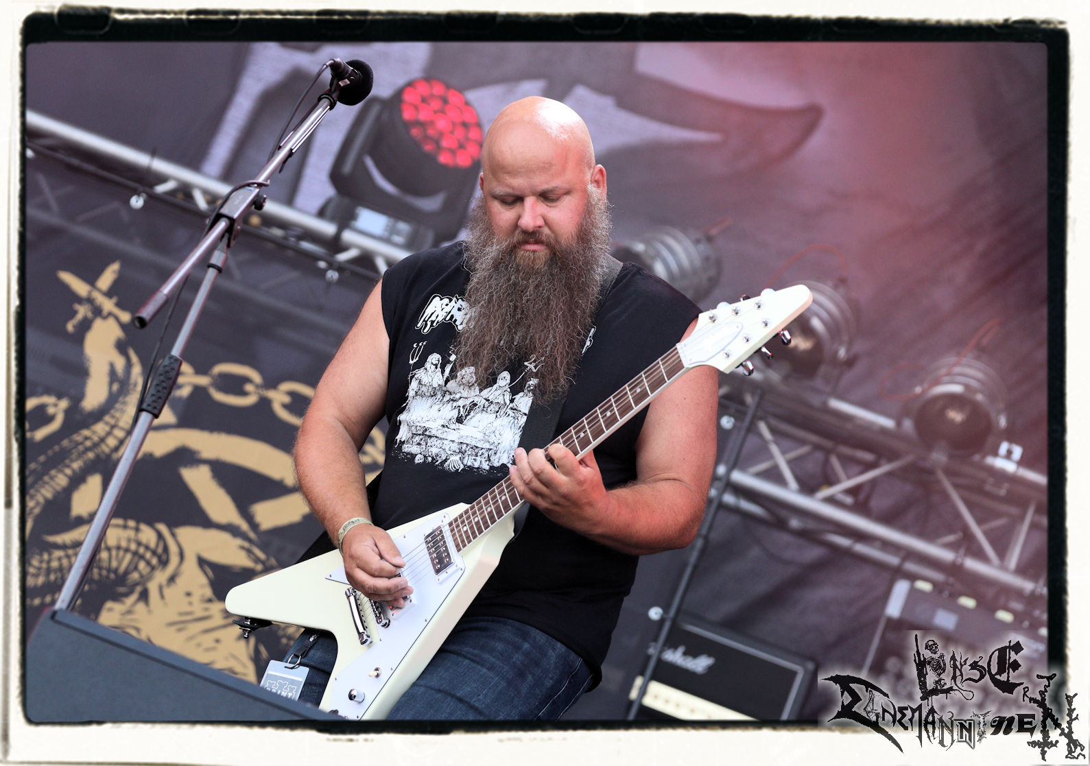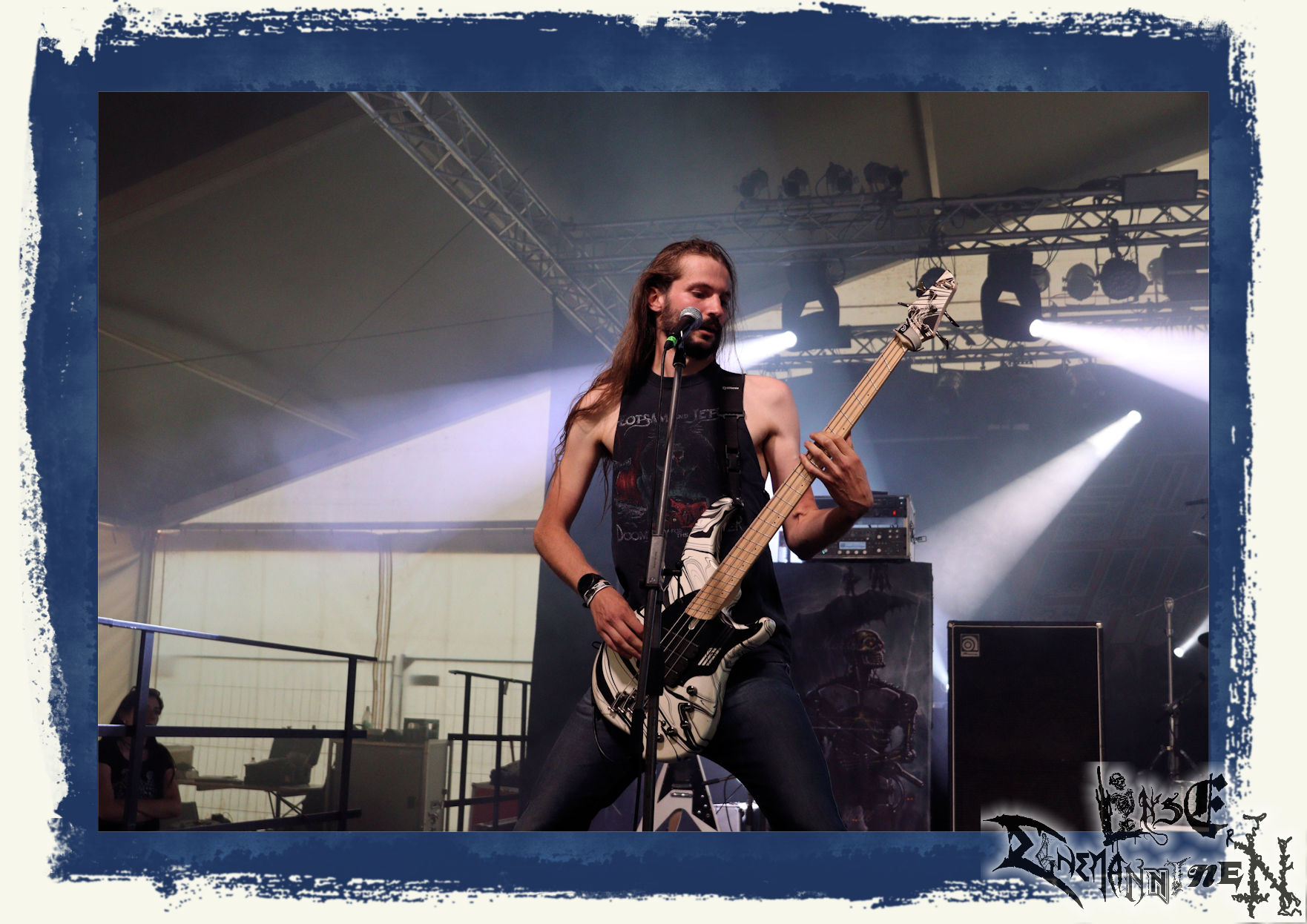 Mit EIS wird der Abend eingeläutet. Die Band aus dem Lupus Lounge – Stall ist wie geschaffen für das Zelt auf dem PARTY.SAN METAL OPEN AIR und beweist eindrucksvoll, wie man Atmosphäre mit mitreißenden Black Metal – Songs kombiniert. Bandkopf Alboin ist gleichzeitig Fan und Vollblutmusiker, der mit den Schwarzmetall-Größen der Neunziger aufgewachsen ist, wobei seine Musik sowohl von diesen, als auch von seiner Bewunderung gegenüber prägenden heimischen Acts wie Helrunar oder auch dem Wirken von Schwadorf mit Sun Of The Sleepless beeinflusst ist. Auch macht er keinen Hehl daraus, dass ihm die Einladung nach Schlotheim mit seiner Band als "Spätberufenem" sehr viel bedeutet. Und diese Haltung schwingt in diesem Konzert mit. Egal, ob Songs vom 2005er-Album "Galeere" ("Durch lichtlose Tiefen", seinerzeit noch unter dem Bandvorgänger Geist veröffentlicht (aus namensrechtlichen Gründen musste man sich danach in Eis umbenennen), vom bisher jüngsten Album "Bannstein" oder vom Klassiker "Wetterkreuz" (2012), der heuer auch schon zehn Jahre auf dem Buckel hat, gespielt werden. Eis zünden ein kleines Highlight, das mir noch lange in Erinnerung bleiben und mich animiert, mir die Scheiben mal wieder zu Gemüte zu führen. Danke!(JD)