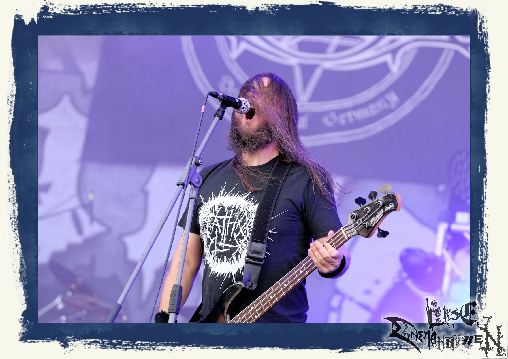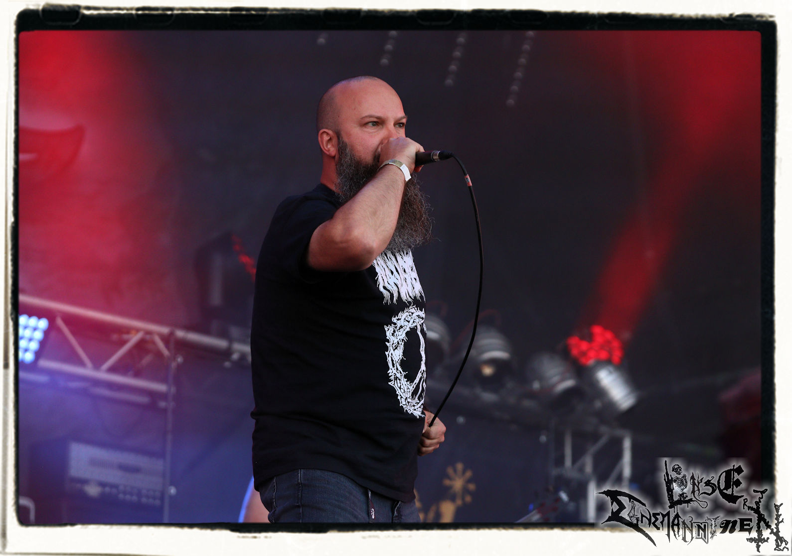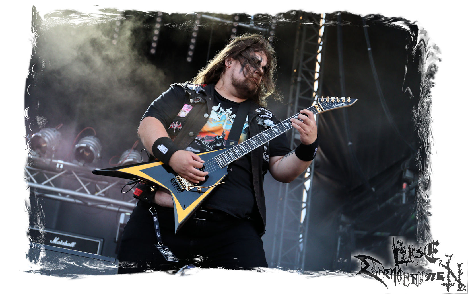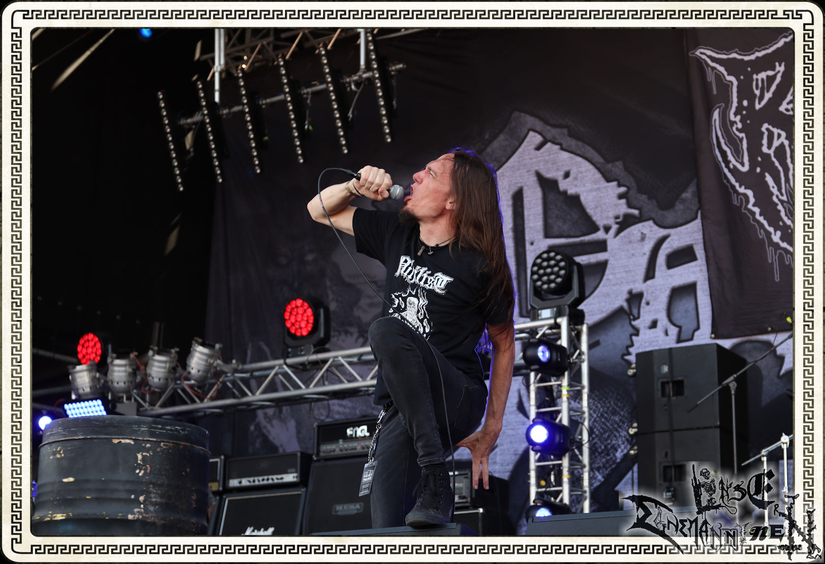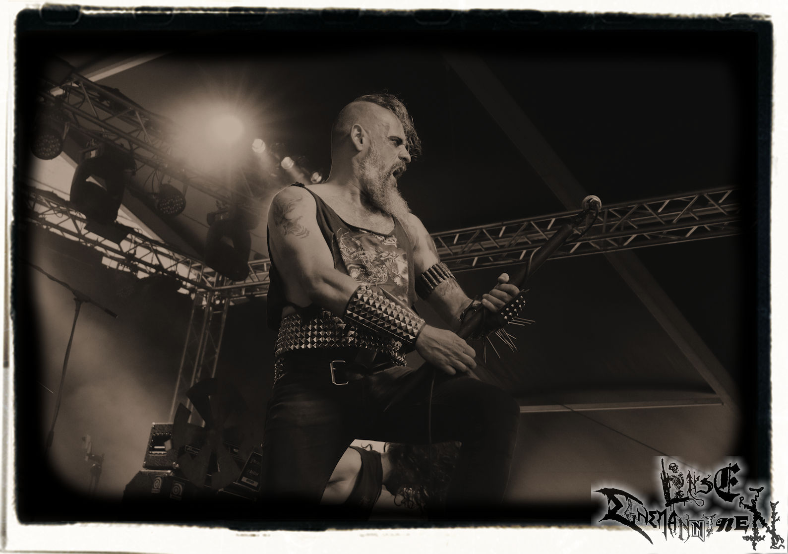 Mit EIS wird der Abend eingeläutet. Die Band aus dem Lupus Lounge – Stall ist wie geschaffen für das Zelt auf dem PARTY.SAN METAL OPEN AIR und beweist eindrucksvoll, wie man Atmosphäre mit mitreißenden Black Metal – Songs kombiniert. Bandkopf Alboin ist gleichzeitig Fan und Vollblutmusiker, der mit den Schwarzmetall-Größen der Neunziger aufgewachsen ist, wobei seine Musik sowohl von diesen, als auch von seiner Bewunderung gegenüber prägenden heimischen Acts wie Helrunar oder auch dem Wirken von Schwadorf mit Sun Of The Sleepless beeinflusst ist. Auch macht er keinen Hehl daraus, dass ihm die Einladung nach Schlotheim mit seiner Band als "Spätberufenem" sehr viel bedeutet. Und diese Haltung schwingt in diesem Konzert mit. Egal, ob Songs vom 2005er-Album "Galeere" ("Durch lichtlose Tiefen", seinerzeit noch unter dem Bandvorgänger Geist veröffentlicht (aus namensrechtlichen Gründen musste man sich danach in Eis umbenennen), vom bisher jüngsten Album "Bannstein" oder vom Klassiker "Wetterkreuz" (2012), der heuer auch schon zehn Jahre auf dem Buckel hat, gespielt werden. Eis zünden ein kleines Highlight, das mir noch lange in Erinnerung bleiben und mich animiert, mir die Scheiben mal wieder zu Gemüte zu führen. Danke!(JD)