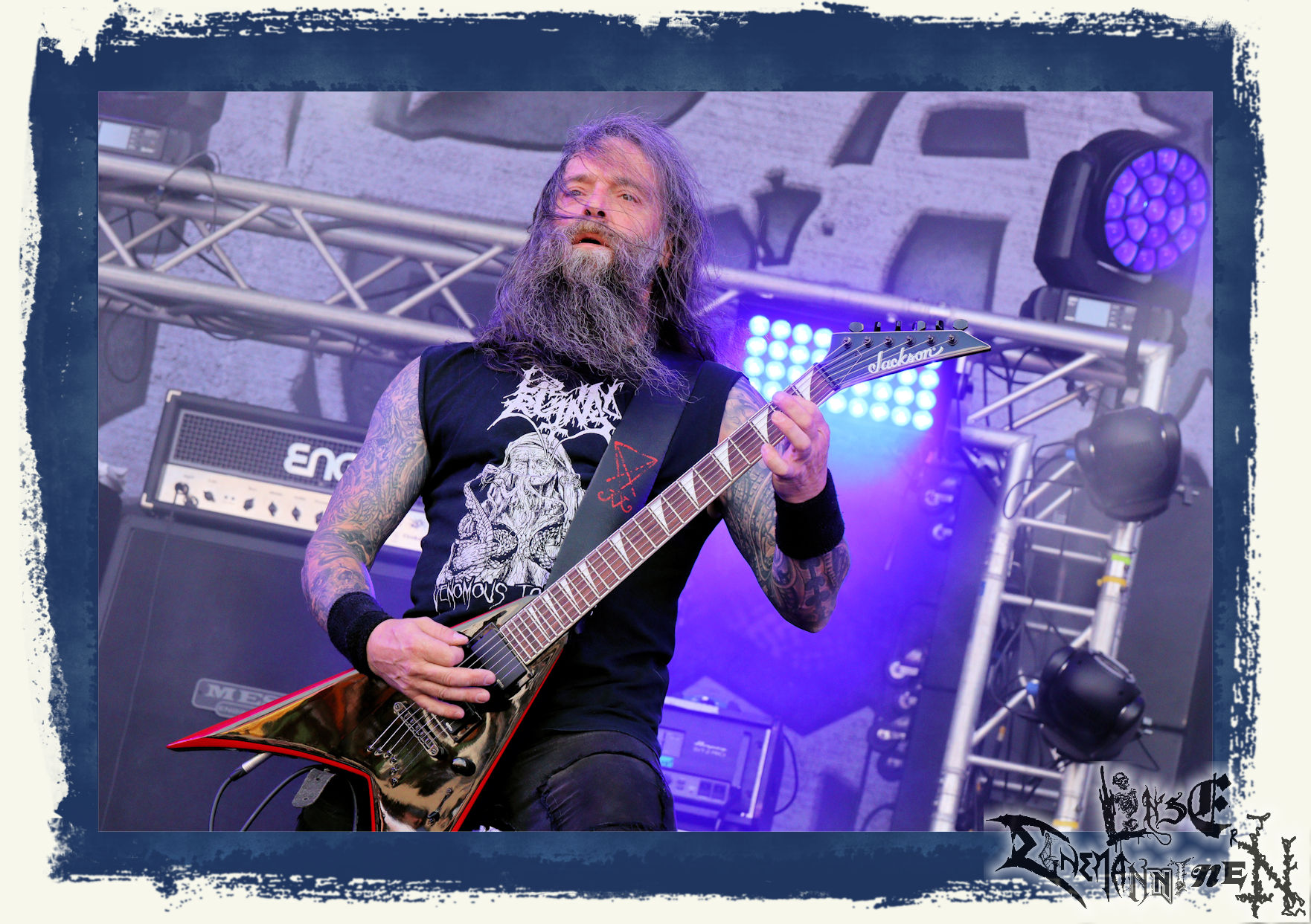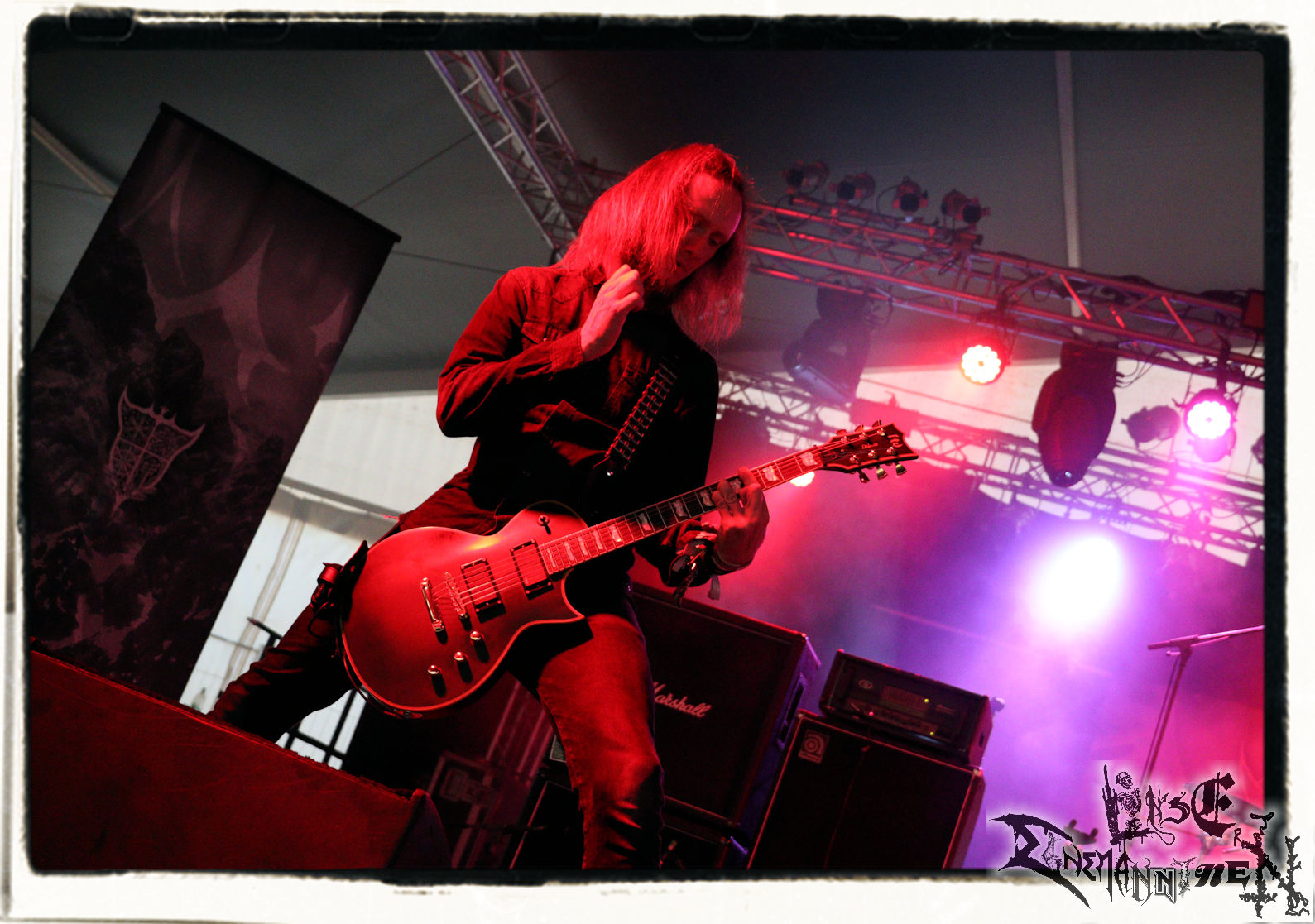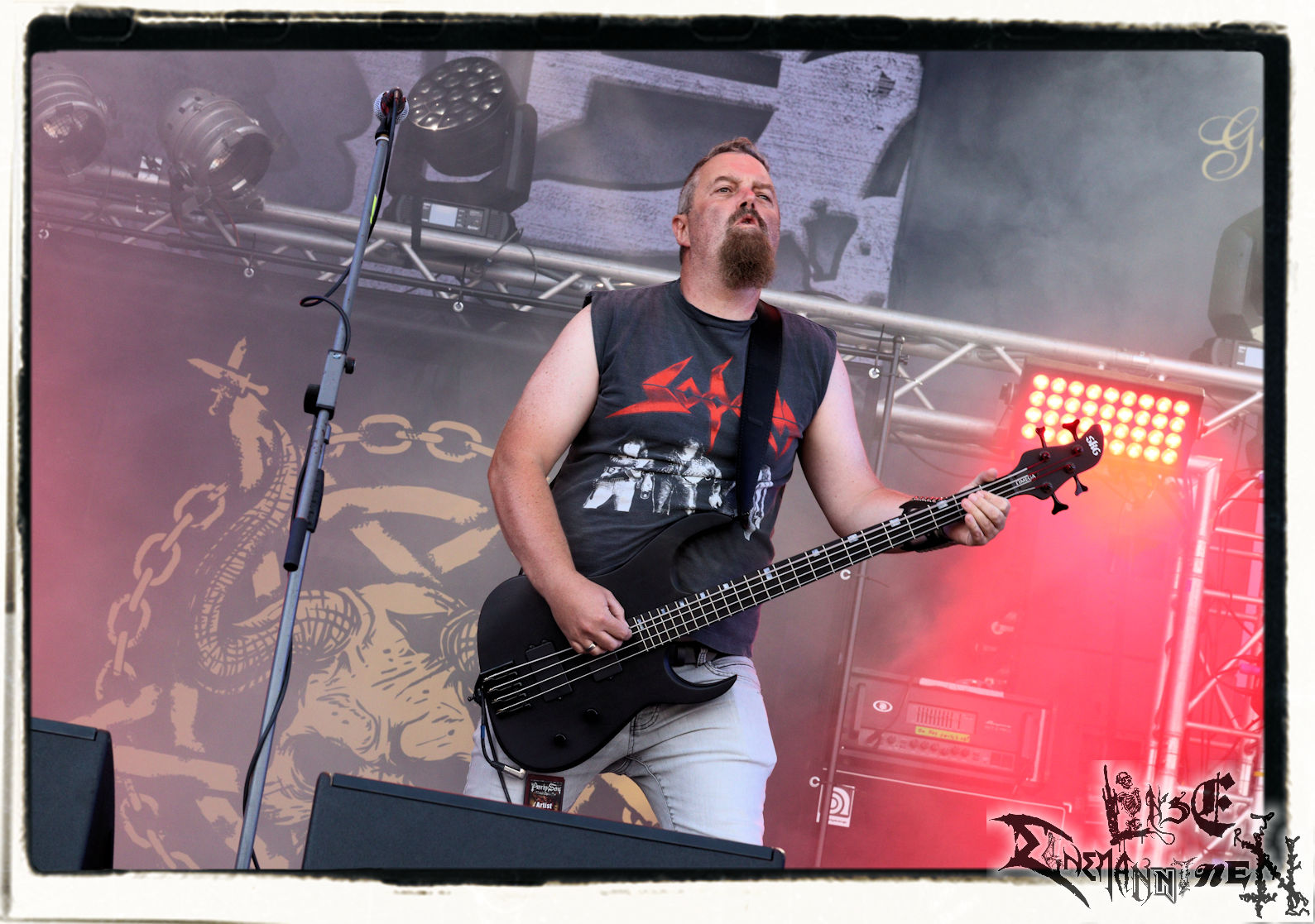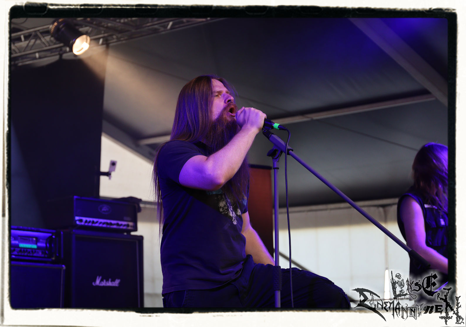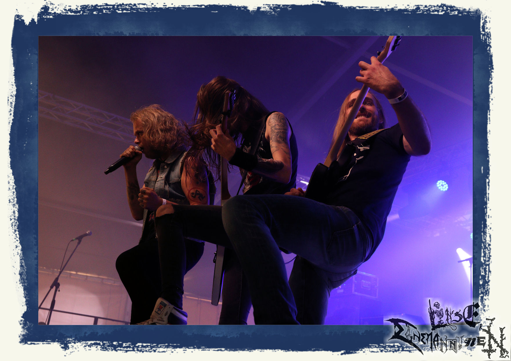 Mit EIS wird der Abend eingeläutet. Die Band aus dem Lupus Lounge – Stall ist wie geschaffen für das Zelt auf dem PARTY.SAN METAL OPEN AIR und beweist eindrucksvoll, wie man Atmosphäre mit mitreißenden Black Metal – Songs kombiniert. Bandkopf Alboin ist gleichzeitig Fan und Vollblutmusiker, der mit den Schwarzmetall-Größen der Neunziger aufgewachsen ist, wobei seine Musik sowohl von diesen, als auch von seiner Bewunderung gegenüber prägenden heimischen Acts wie Helrunar oder auch dem Wirken von Schwadorf mit Sun Of The Sleepless beeinflusst ist. Auch macht er keinen Hehl daraus, dass ihm die Einladung nach Schlotheim mit seiner Band als "Spätberufenem" sehr viel bedeutet. Und diese Haltung schwingt in diesem Konzert mit. Egal, ob Songs vom 2005er-Album "Galeere" ("Durch lichtlose Tiefen", seinerzeit noch unter dem Bandvorgänger Geist veröffentlicht (aus namensrechtlichen Gründen musste man sich danach in Eis umbenennen), vom bisher jüngsten Album "Bannstein" oder vom Klassiker "Wetterkreuz" (2012), der heuer auch schon zehn Jahre auf dem Buckel hat, gespielt werden. Eis zünden ein kleines Highlight, das mir noch lange in Erinnerung bleiben und mich animiert, mir die Scheiben mal wieder zu Gemüte zu führen. Danke!(JD)