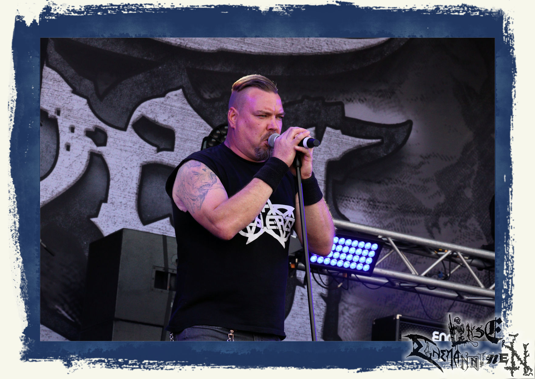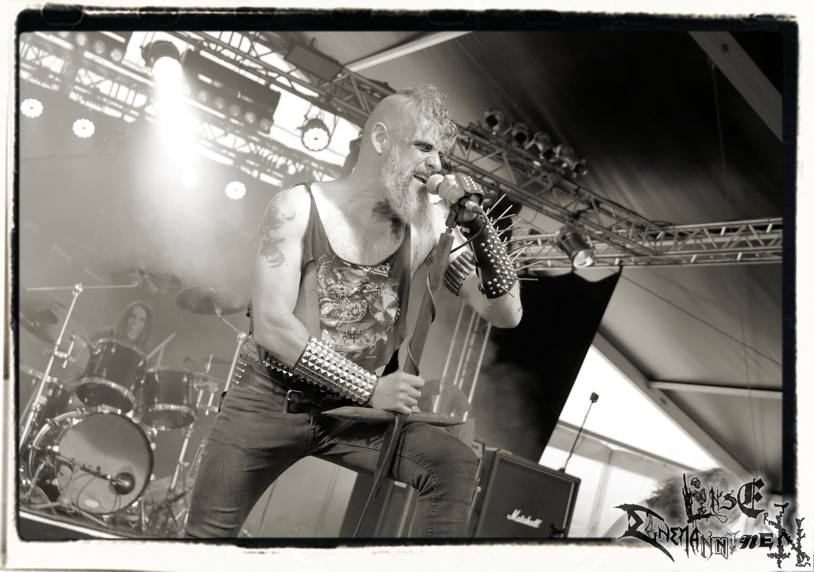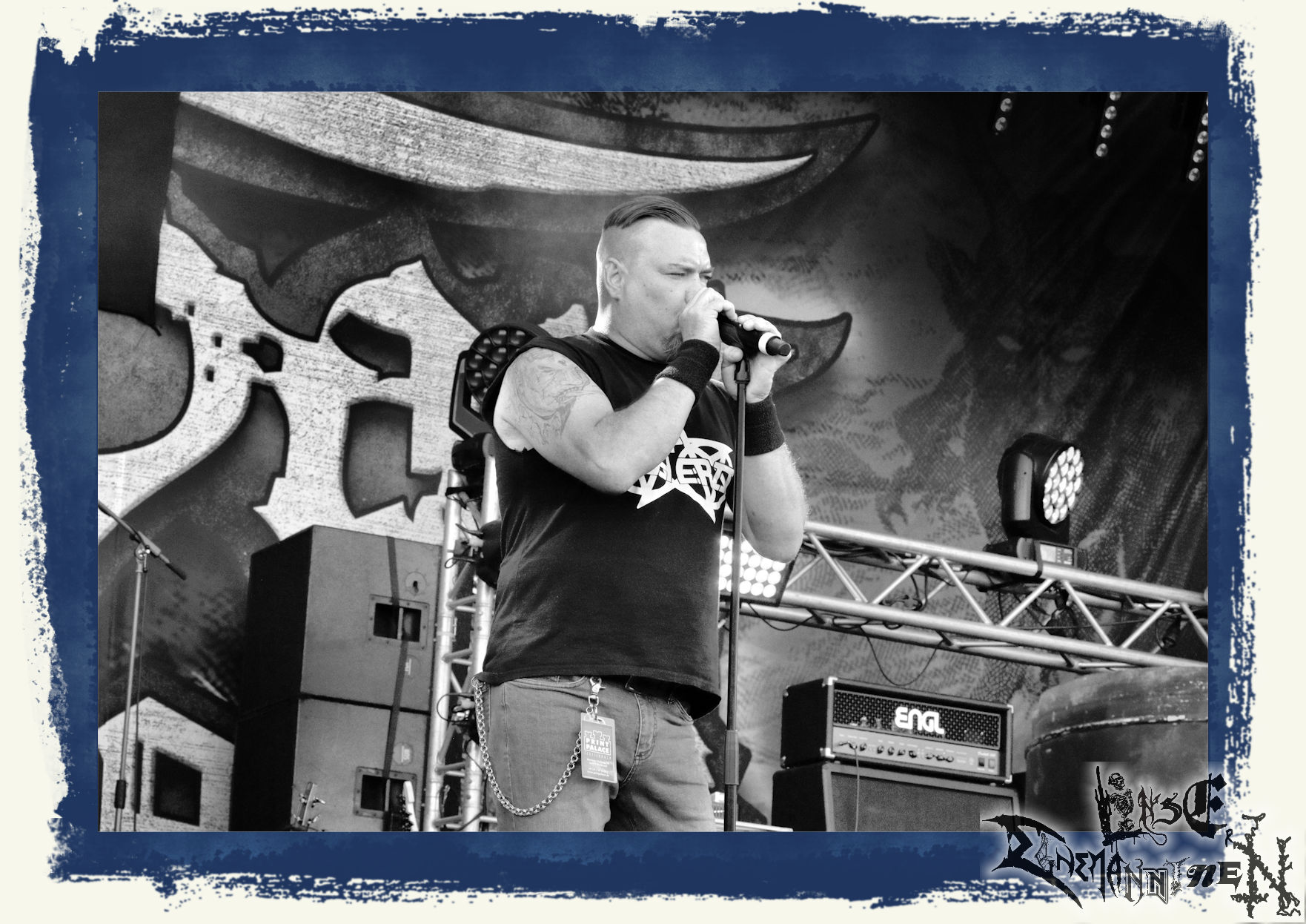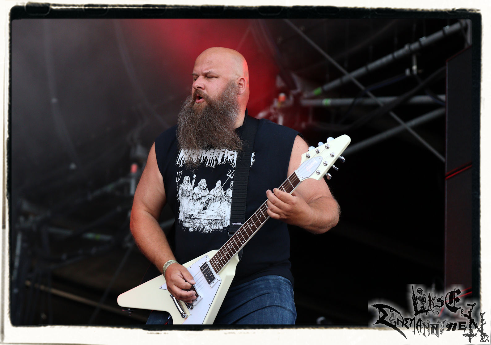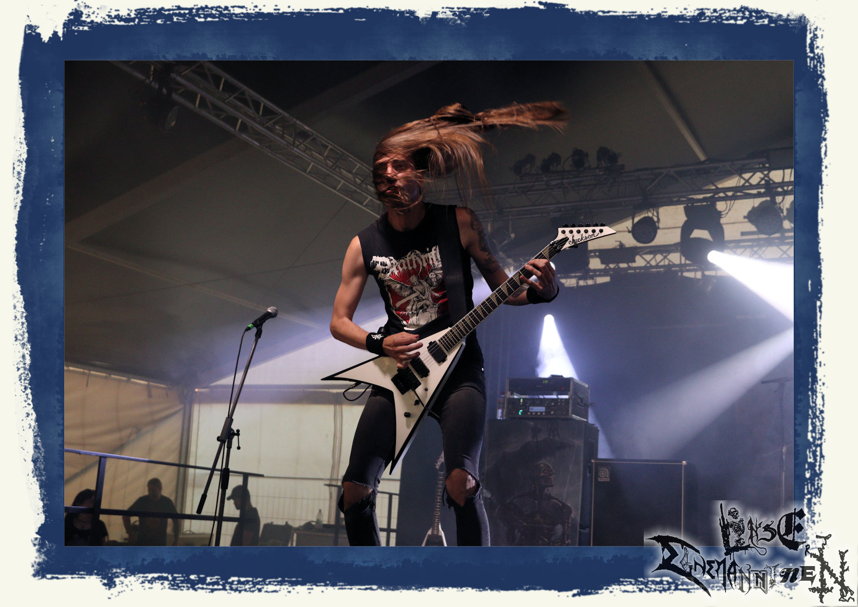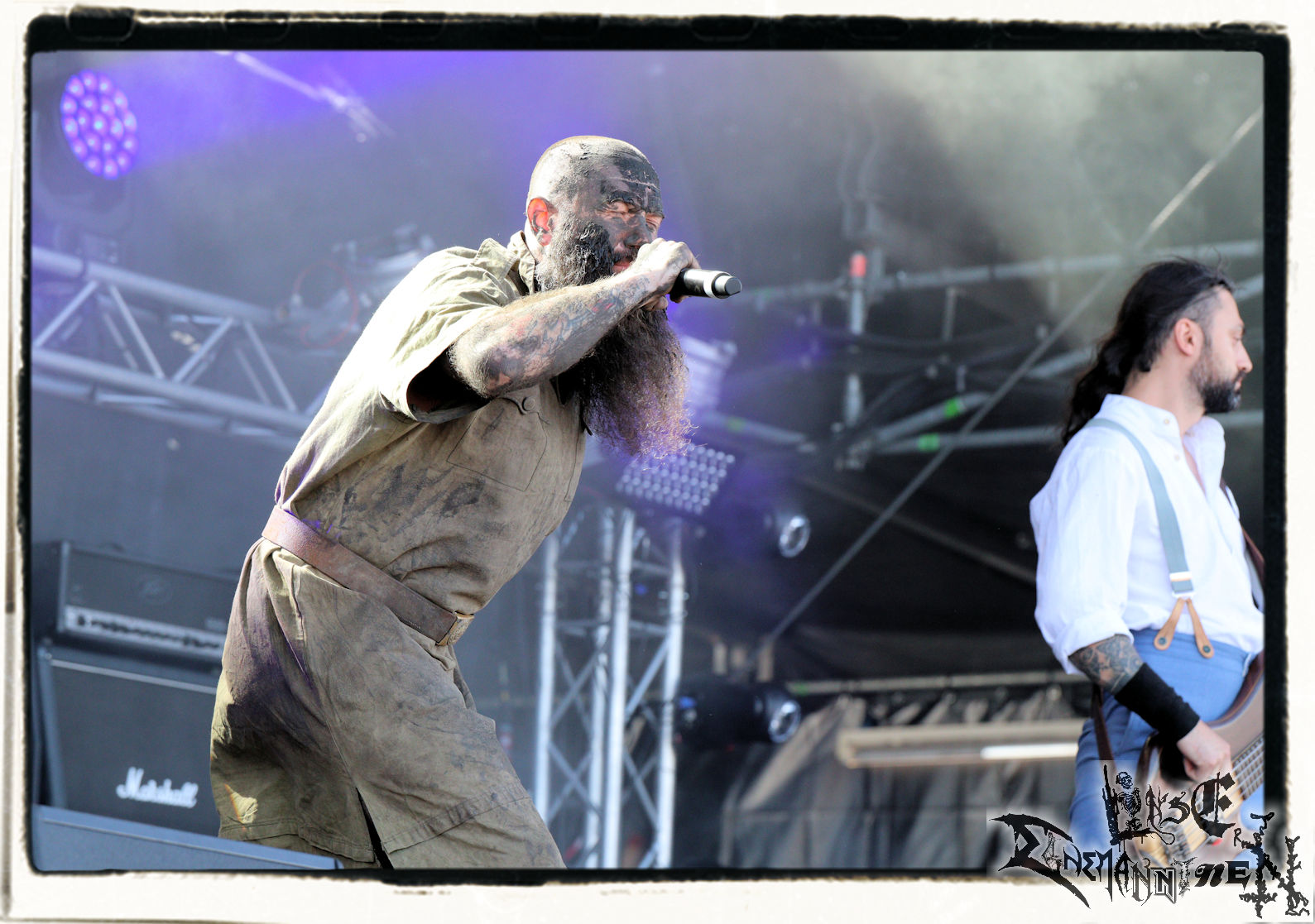 Mit EIS wird der Abend eingeläutet. Die Band aus dem Lupus Lounge – Stall ist wie geschaffen für das Zelt auf dem PARTY.SAN METAL OPEN AIR und beweist eindrucksvoll, wie man Atmosphäre mit mitreißenden Black Metal – Songs kombiniert. Bandkopf Alboin ist gleichzeitig Fan und Vollblutmusiker, der mit den Schwarzmetall-Größen der Neunziger aufgewachsen ist, wobei seine Musik sowohl von diesen, als auch von seiner Bewunderung gegenüber prägenden heimischen Acts wie Helrunar oder auch dem Wirken von Schwadorf mit Sun Of The Sleepless beeinflusst ist. Auch macht er keinen Hehl daraus, dass ihm die Einladung nach Schlotheim mit seiner Band als "Spätberufenem" sehr viel bedeutet. Und diese Haltung schwingt in diesem Konzert mit. Egal, ob Songs vom 2005er-Album "Galeere" ("Durch lichtlose Tiefen", seinerzeit noch unter dem Bandvorgänger Geist veröffentlicht (aus namensrechtlichen Gründen musste man sich danach in Eis umbenennen), vom bisher jüngsten Album "Bannstein" oder vom Klassiker "Wetterkreuz" (2012), der heuer auch schon zehn Jahre auf dem Buckel hat, gespielt werden. Eis zünden ein kleines Highlight, das mir noch lange in Erinnerung bleiben und mich animiert, mir die Scheiben mal wieder zu Gemüte zu führen. Danke!(JD)