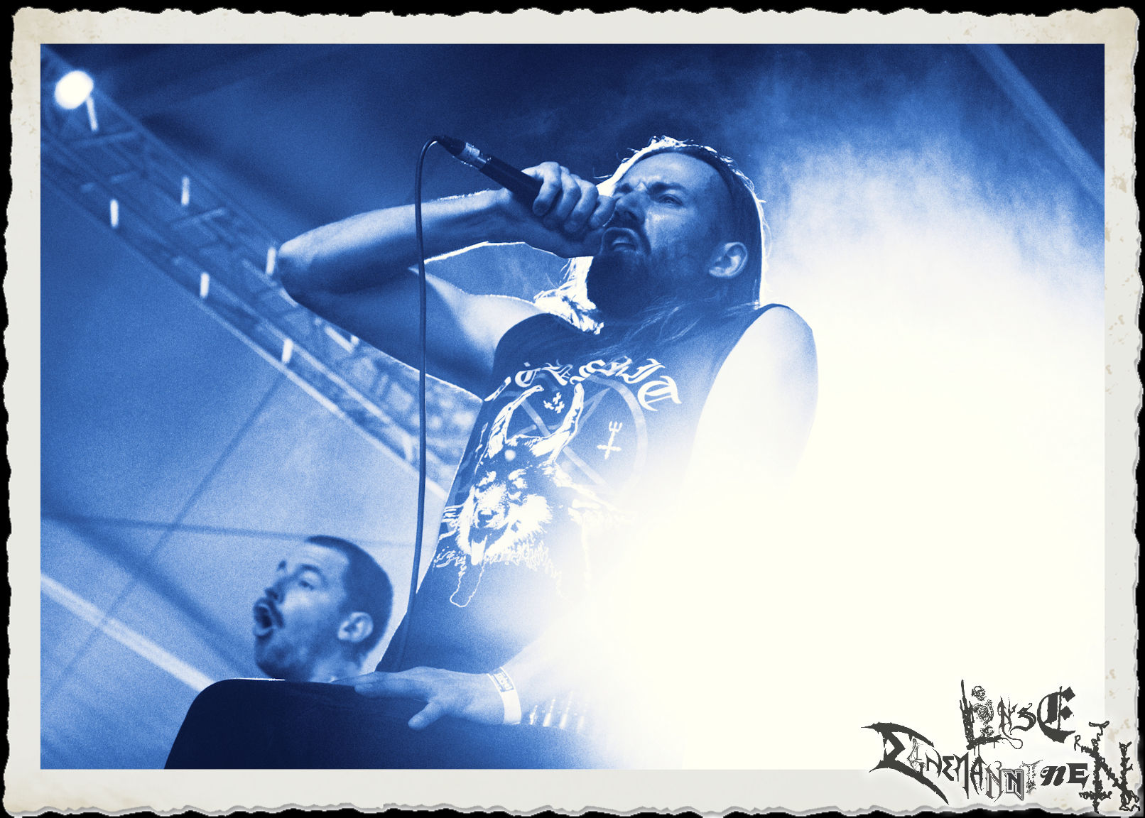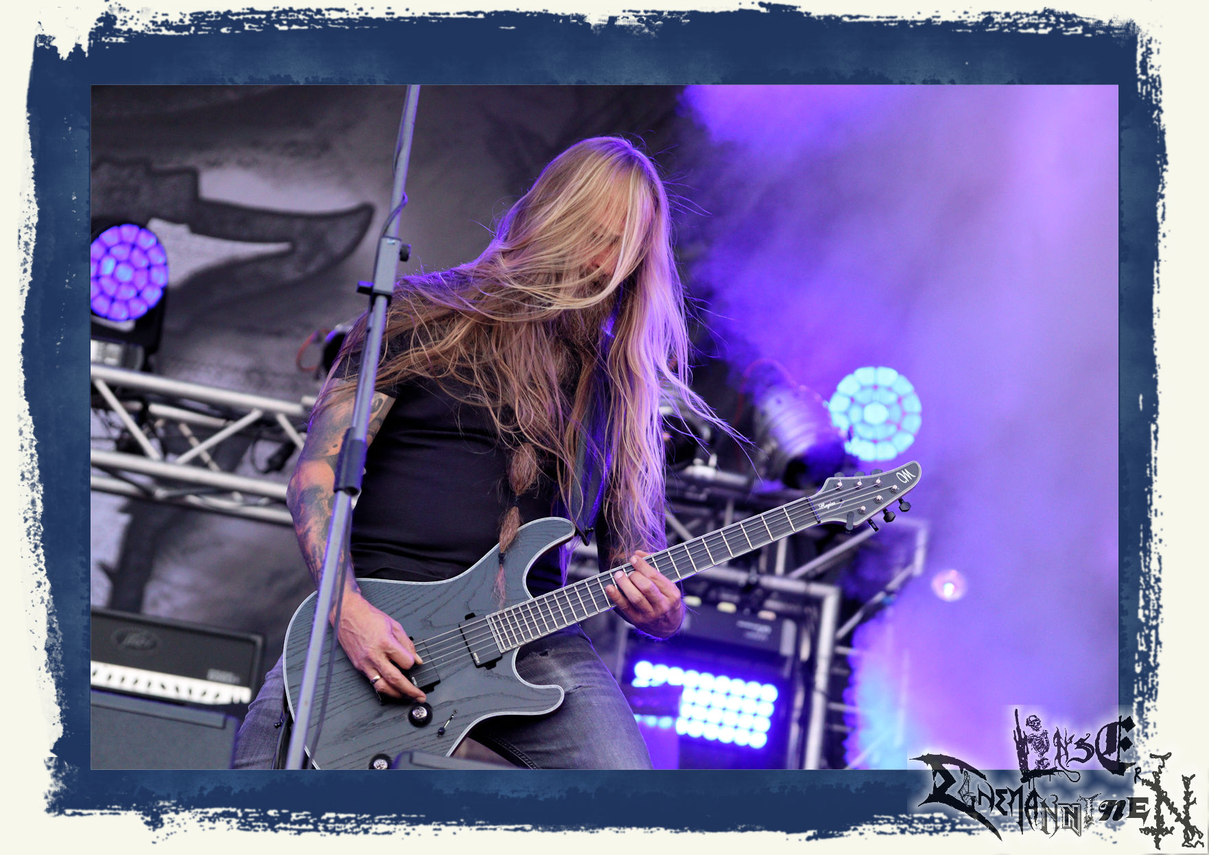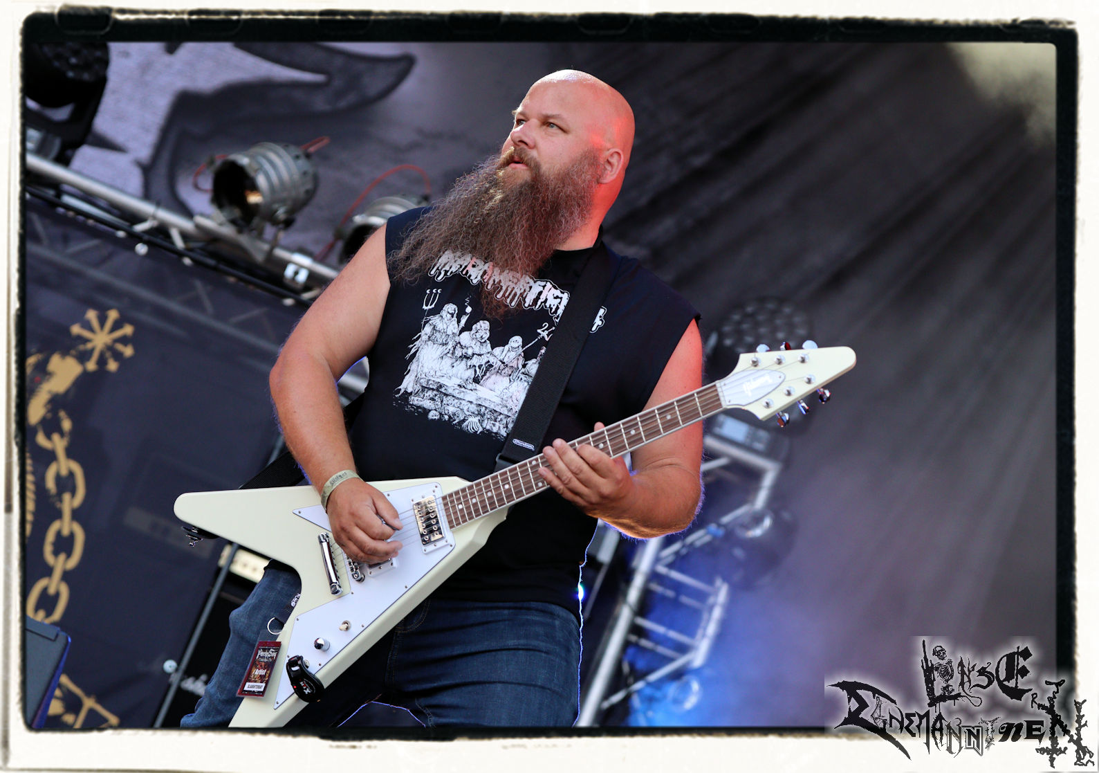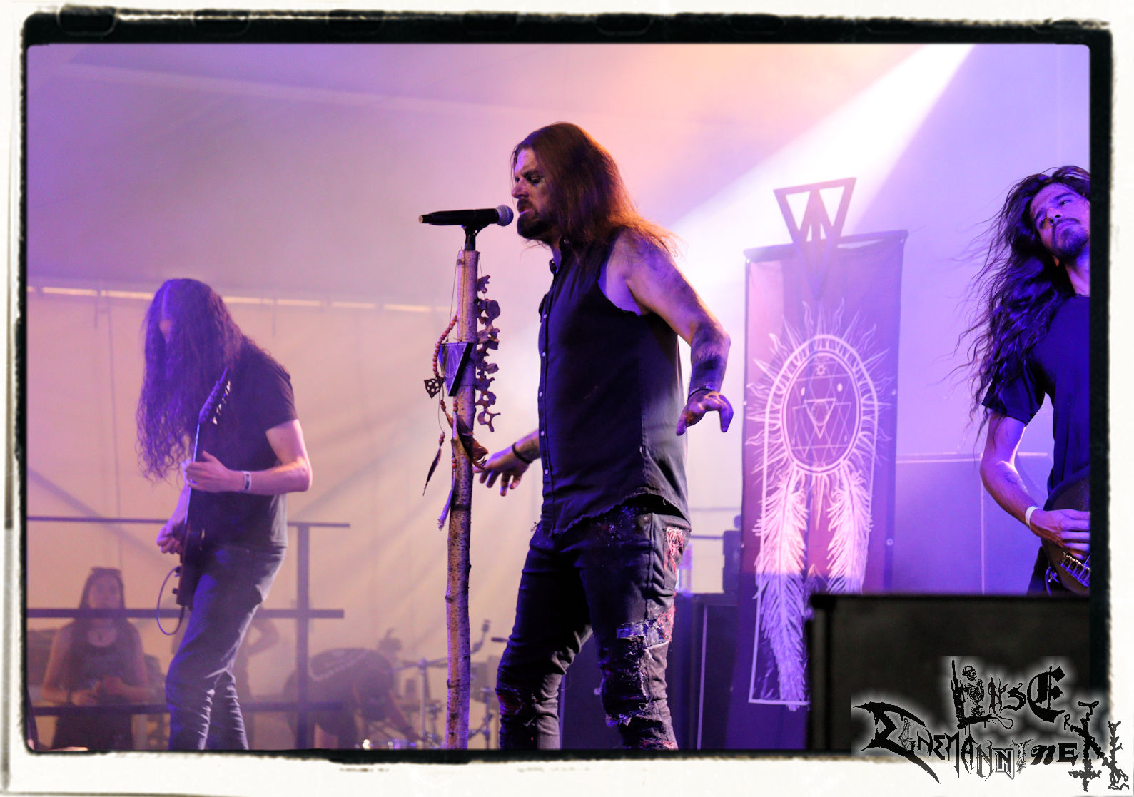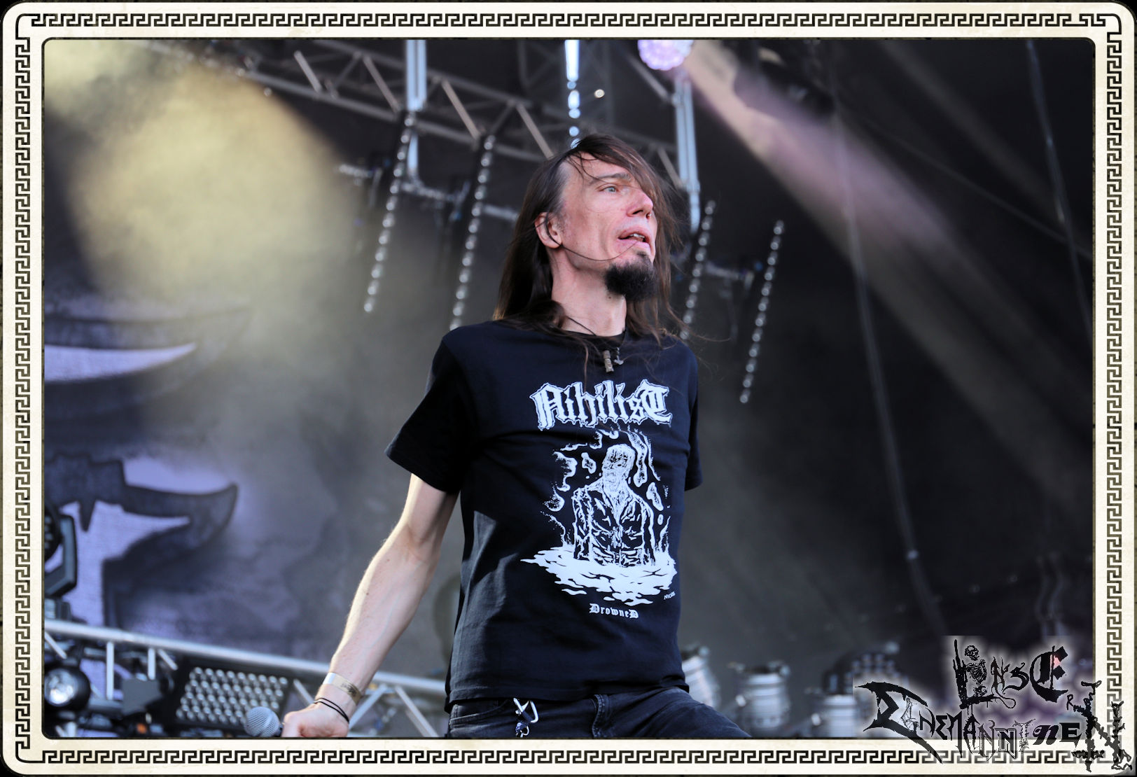 Mit EIS wird der Abend eingeläutet. Die Band aus dem Lupus Lounge – Stall ist wie geschaffen für das Zelt auf dem PARTY.SAN METAL OPEN AIR und beweist eindrucksvoll, wie man Atmosphäre mit mitreißenden Black Metal – Songs kombiniert. Bandkopf Alboin ist gleichzeitig Fan und Vollblutmusiker, der mit den Schwarzmetall-Größen der Neunziger aufgewachsen ist, wobei seine Musik sowohl von diesen, als auch von seiner Bewunderung gegenüber prägenden heimischen Acts wie Helrunar oder auch dem Wirken von Schwadorf mit Sun Of The Sleepless beeinflusst ist. Auch macht er keinen Hehl daraus, dass ihm die Einladung nach Schlotheim mit seiner Band als "Spätberufenem" sehr viel bedeutet. Und diese Haltung schwingt in diesem Konzert mit. Egal, ob Songs vom 2005er-Album "Galeere" ("Durch lichtlose Tiefen", seinerzeit noch unter dem Bandvorgänger Geist veröffentlicht (aus namensrechtlichen Gründen musste man sich danach in Eis umbenennen), vom bisher jüngsten Album "Bannstein" oder vom Klassiker "Wetterkreuz" (2012), der heuer auch schon zehn Jahre auf dem Buckel hat, gespielt werden. Eis zünden ein kleines Highlight, das mir noch lange in Erinnerung bleiben und mich animiert, mir die Scheiben mal wieder zu Gemüte zu führen. Danke!(JD)