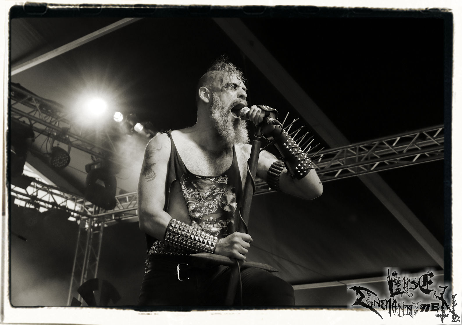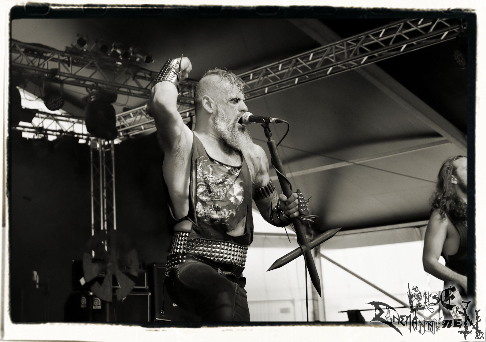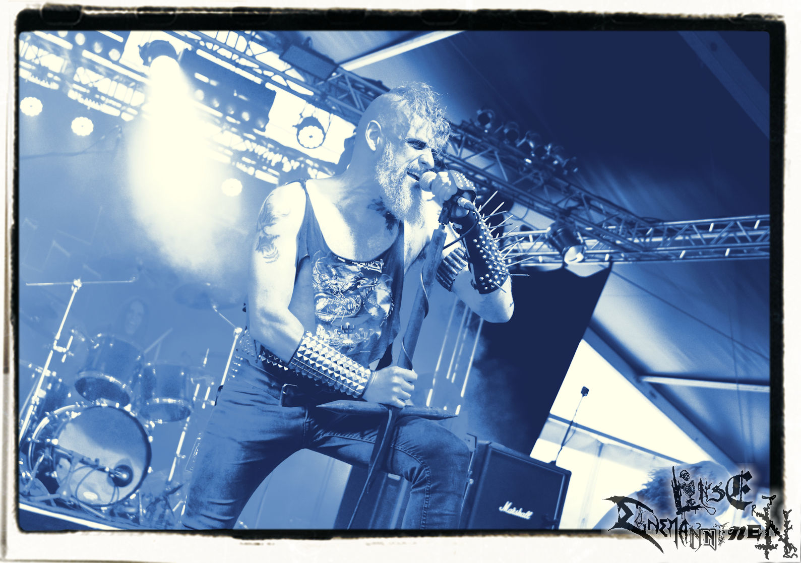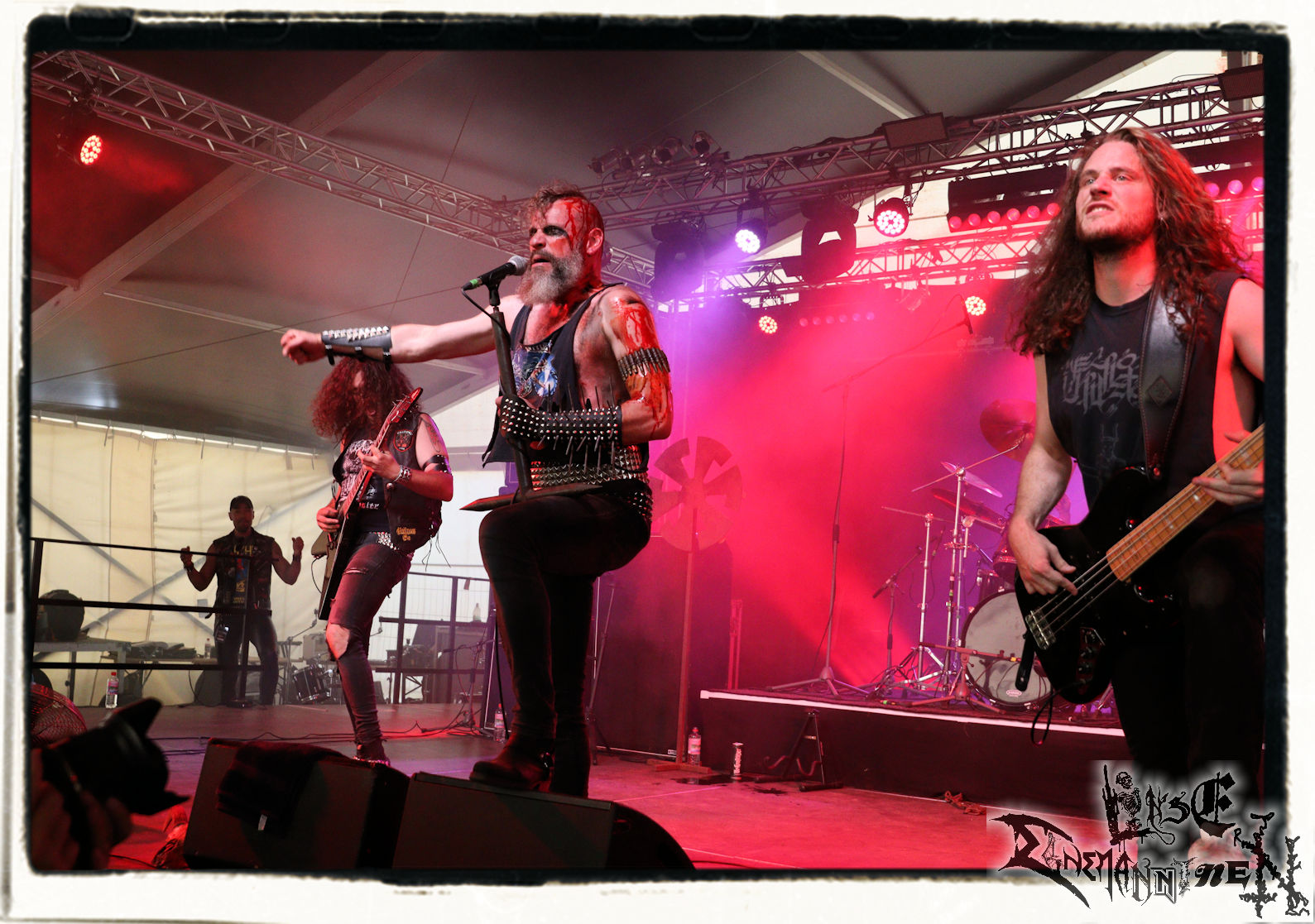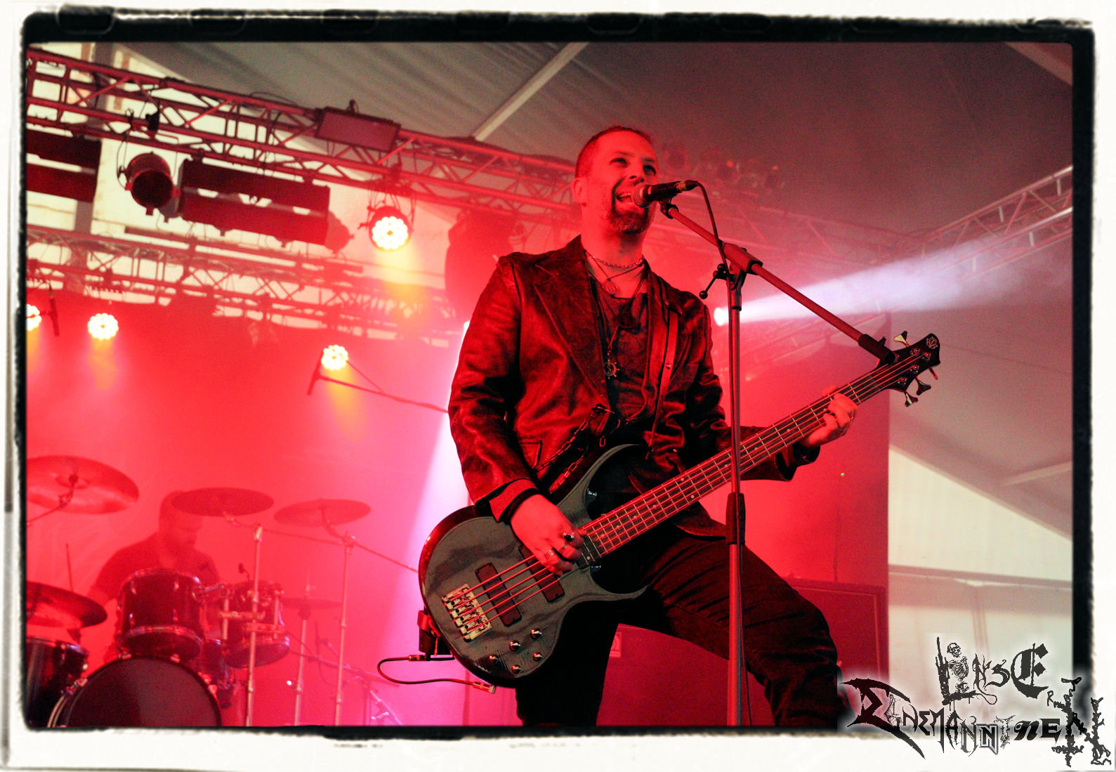 Mit EIS wird der Abend eingeläutet. Die Band aus dem Lupus Lounge – Stall ist wie geschaffen für das Zelt auf dem PARTY.SAN METAL OPEN AIR und beweist eindrucksvoll, wie man Atmosphäre mit mitreißenden Black Metal – Songs kombiniert. Bandkopf Alboin ist gleichzeitig Fan und Vollblutmusiker, der mit den Schwarzmetall-Größen der Neunziger aufgewachsen ist, wobei seine Musik sowohl von diesen, als auch von seiner Bewunderung gegenüber prägenden heimischen Acts wie Helrunar oder auch dem Wirken von Schwadorf mit Sun Of The Sleepless beeinflusst ist. Auch macht er keinen Hehl daraus, dass ihm die Einladung nach Schlotheim mit seiner Band als "Spätberufenem" sehr viel bedeutet. Und diese Haltung schwingt in diesem Konzert mit. Egal, ob Songs vom 2005er-Album "Galeere" ("Durch lichtlose Tiefen", seinerzeit noch unter dem Bandvorgänger Geist veröffentlicht (aus namensrechtlichen Gründen musste man sich danach in Eis umbenennen), vom bisher jüngsten Album "Bannstein" oder vom Klassiker "Wetterkreuz" (2012), der heuer auch schon zehn Jahre auf dem Buckel hat, gespielt werden. Eis zünden ein kleines Highlight, das mir noch lange in Erinnerung bleiben und mich animiert, mir die Scheiben mal wieder zu Gemüte zu führen. Danke!(JD)