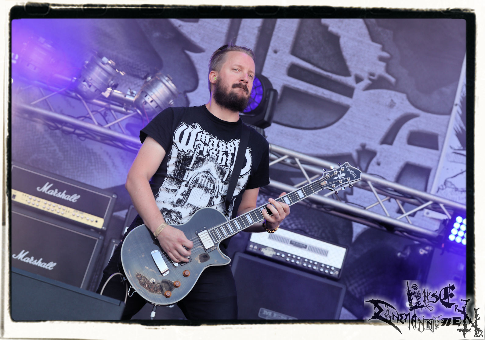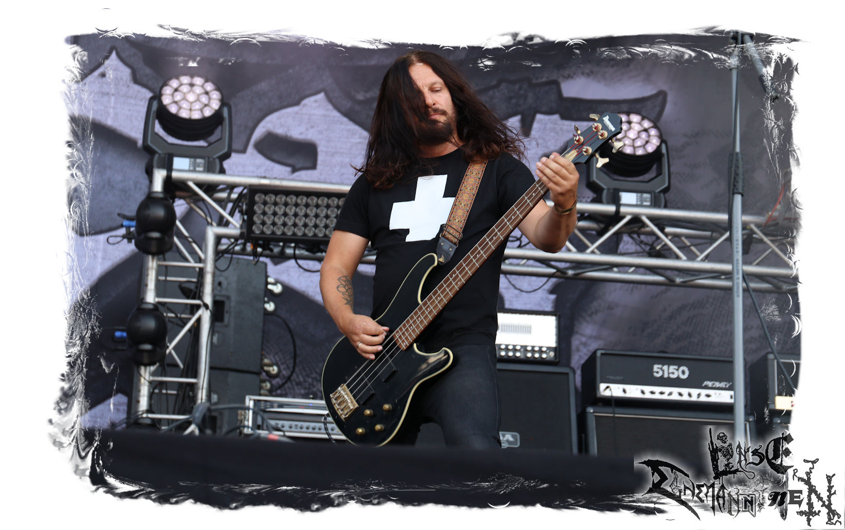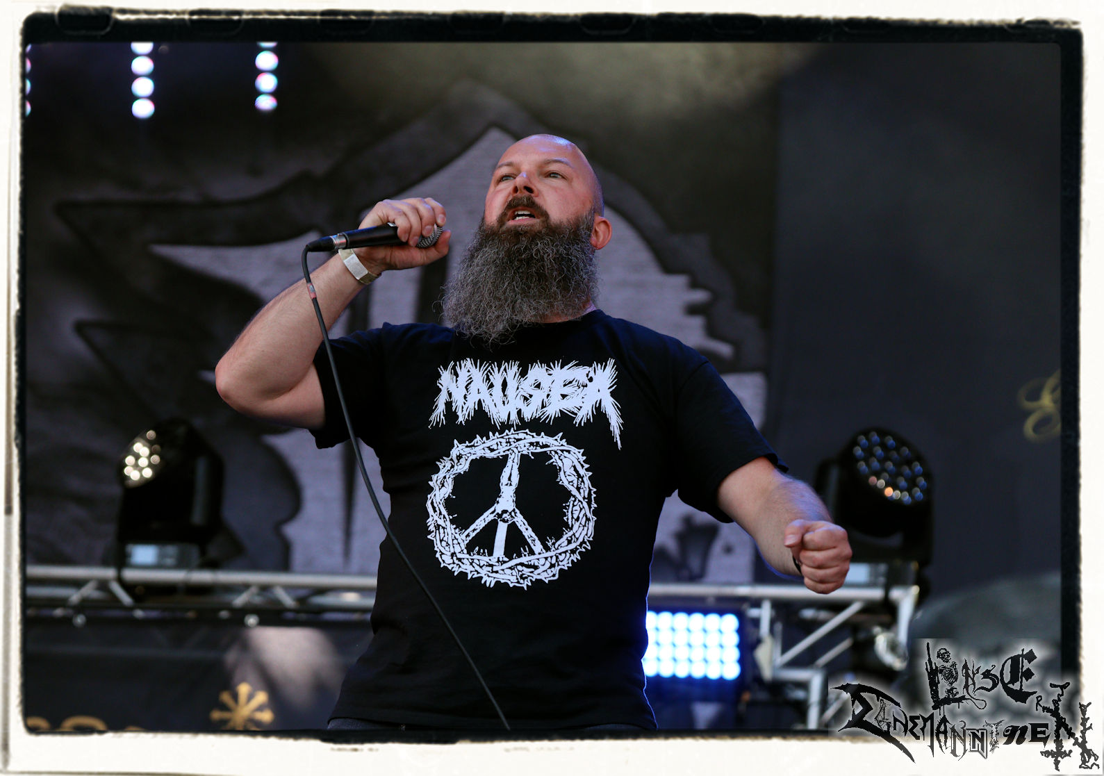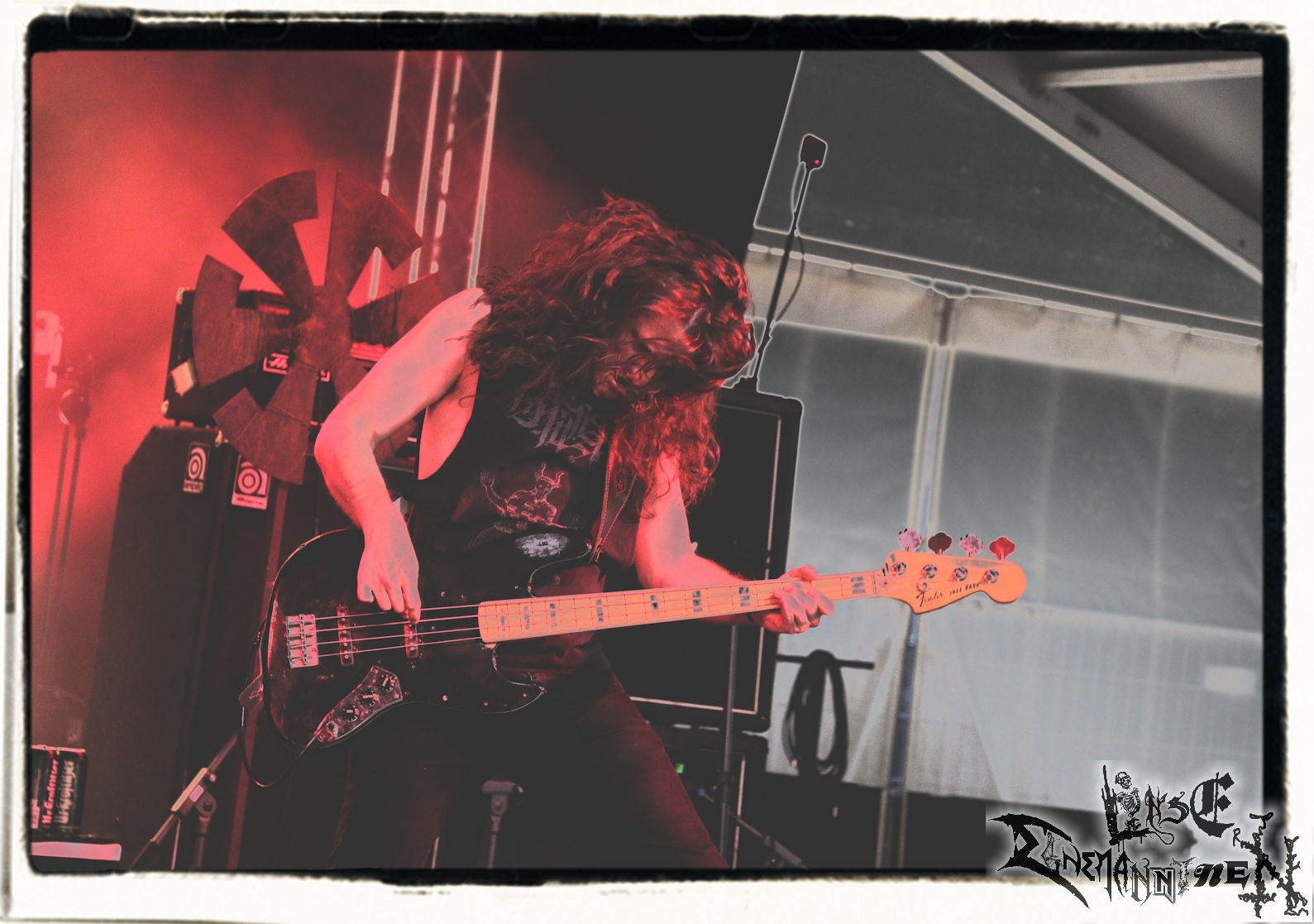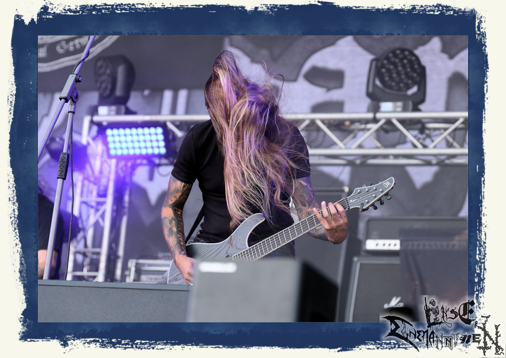 Mit EIS wird der Abend eingeläutet. Die Band aus dem Lupus Lounge – Stall ist wie geschaffen für das Zelt auf dem PARTY.SAN METAL OPEN AIR und beweist eindrucksvoll, wie man Atmosphäre mit mitreißenden Black Metal – Songs kombiniert. Bandkopf Alboin ist gleichzeitig Fan und Vollblutmusiker, der mit den Schwarzmetall-Größen der Neunziger aufgewachsen ist, wobei seine Musik sowohl von diesen, als auch von seiner Bewunderung gegenüber prägenden heimischen Acts wie Helrunar oder auch dem Wirken von Schwadorf mit Sun Of The Sleepless beeinflusst ist. Auch macht er keinen Hehl daraus, dass ihm die Einladung nach Schlotheim mit seiner Band als "Spätberufenem" sehr viel bedeutet. Und diese Haltung schwingt in diesem Konzert mit. Egal, ob Songs vom 2005er-Album "Galeere" ("Durch lichtlose Tiefen", seinerzeit noch unter dem Bandvorgänger Geist veröffentlicht (aus namensrechtlichen Gründen musste man sich danach in Eis umbenennen), vom bisher jüngsten Album "Bannstein" oder vom Klassiker "Wetterkreuz" (2012), der heuer auch schon zehn Jahre auf dem Buckel hat, gespielt werden. Eis zünden ein kleines Highlight, das mir noch lange in Erinnerung bleiben und mich animiert, mir die Scheiben mal wieder zu Gemüte zu führen. Danke!(JD)