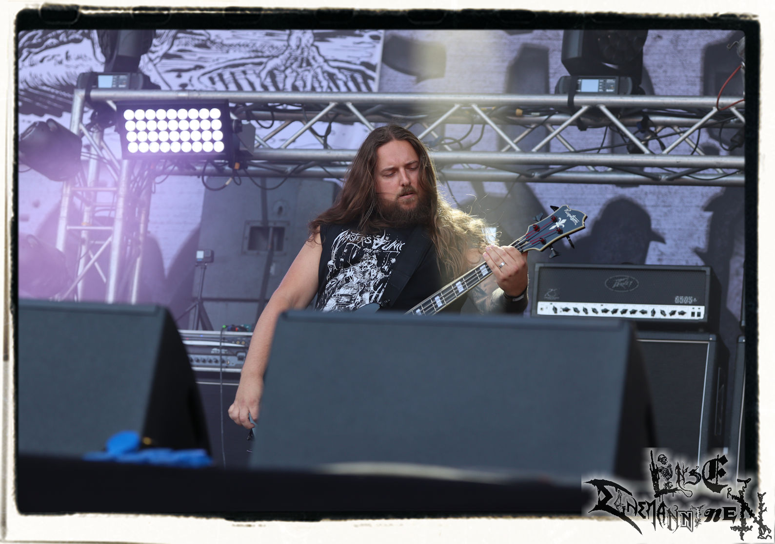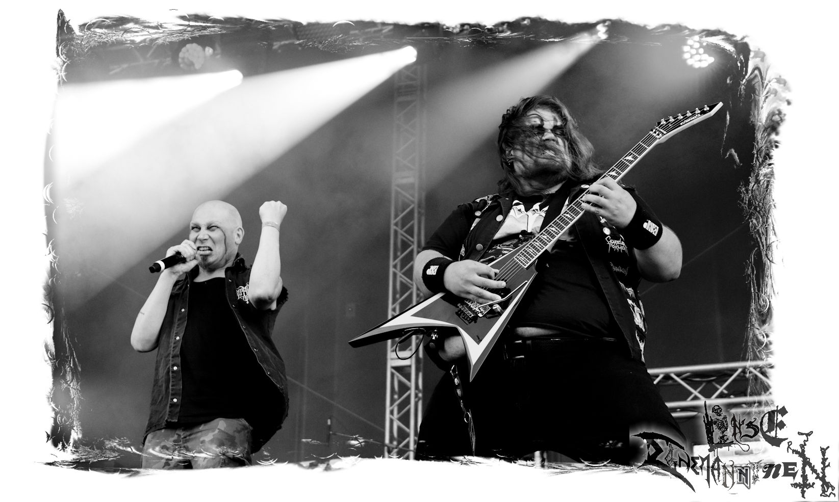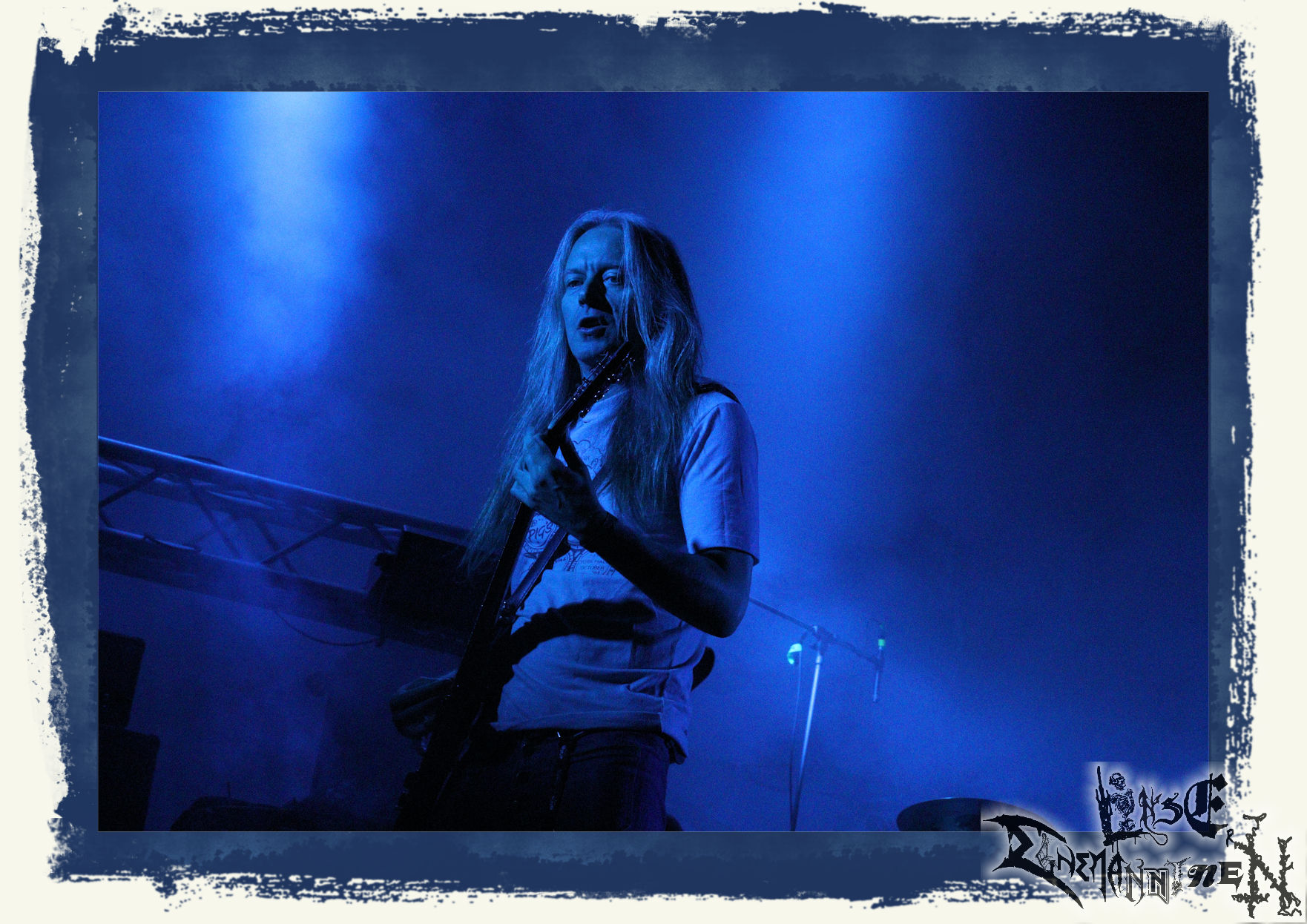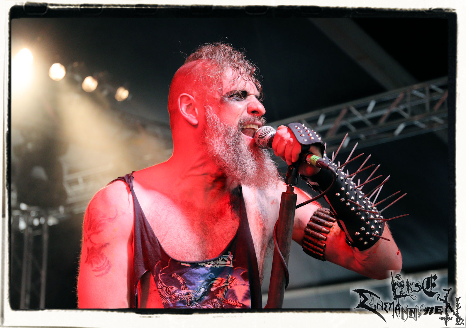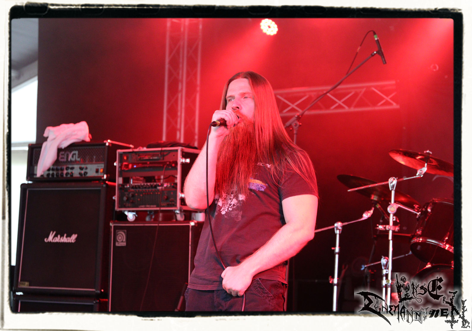 Mit EIS wird der Abend eingeläutet. Die Band aus dem Lupus Lounge – Stall ist wie geschaffen für das Zelt auf dem PARTY.SAN METAL OPEN AIR und beweist eindrucksvoll, wie man Atmosphäre mit mitreißenden Black Metal – Songs kombiniert. Bandkopf Alboin ist gleichzeitig Fan und Vollblutmusiker, der mit den Schwarzmetall-Größen der Neunziger aufgewachsen ist, wobei seine Musik sowohl von diesen, als auch von seiner Bewunderung gegenüber prägenden heimischen Acts wie Helrunar oder auch dem Wirken von Schwadorf mit Sun Of The Sleepless beeinflusst ist. Auch macht er keinen Hehl daraus, dass ihm die Einladung nach Schlotheim mit seiner Band als "Spätberufenem" sehr viel bedeutet. Und diese Haltung schwingt in diesem Konzert mit. Egal, ob Songs vom 2005er-Album "Galeere" ("Durch lichtlose Tiefen", seinerzeit noch unter dem Bandvorgänger Geist veröffentlicht (aus namensrechtlichen Gründen musste man sich danach in Eis umbenennen), vom bisher jüngsten Album "Bannstein" oder vom Klassiker "Wetterkreuz" (2012), der heuer auch schon zehn Jahre auf dem Buckel hat, gespielt werden. Eis zünden ein kleines Highlight, das mir noch lange in Erinnerung bleiben und mich animiert, mir die Scheiben mal wieder zu Gemüte zu führen. Danke!(JD)