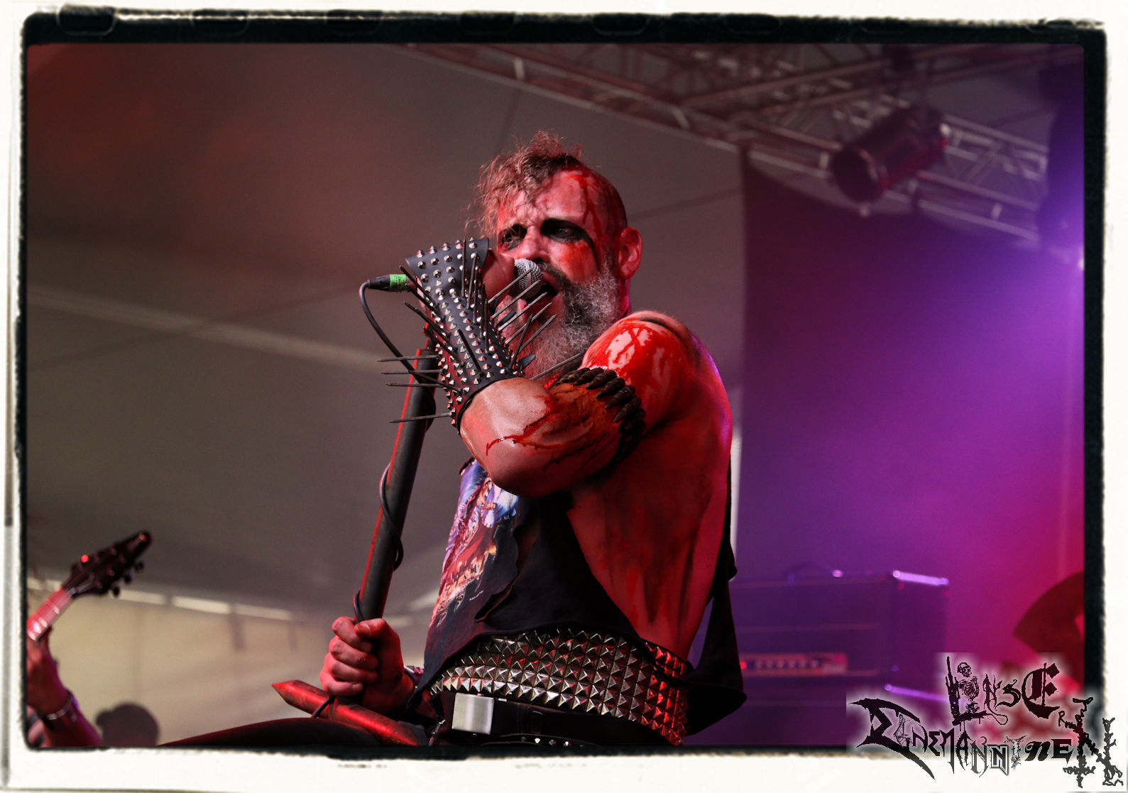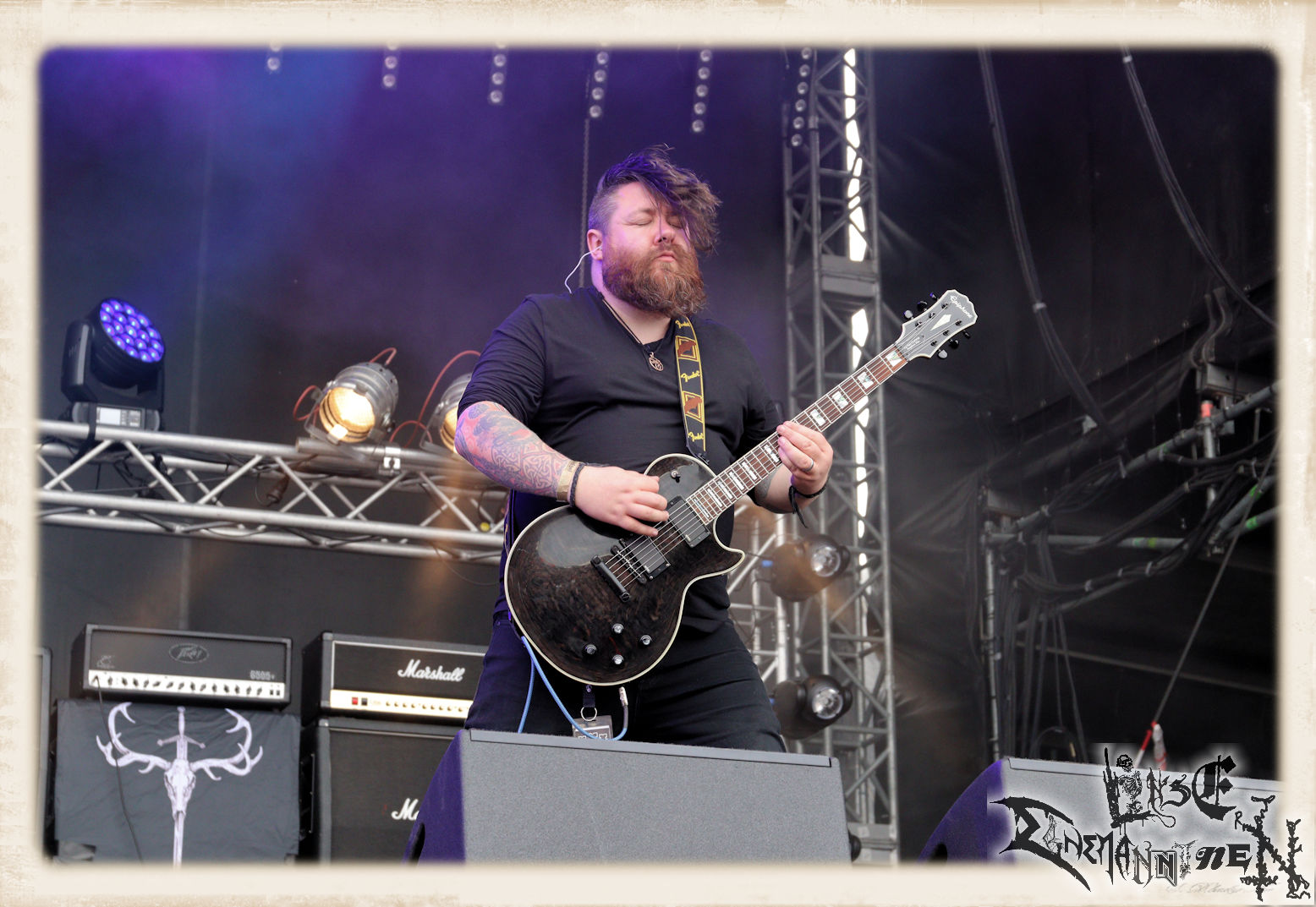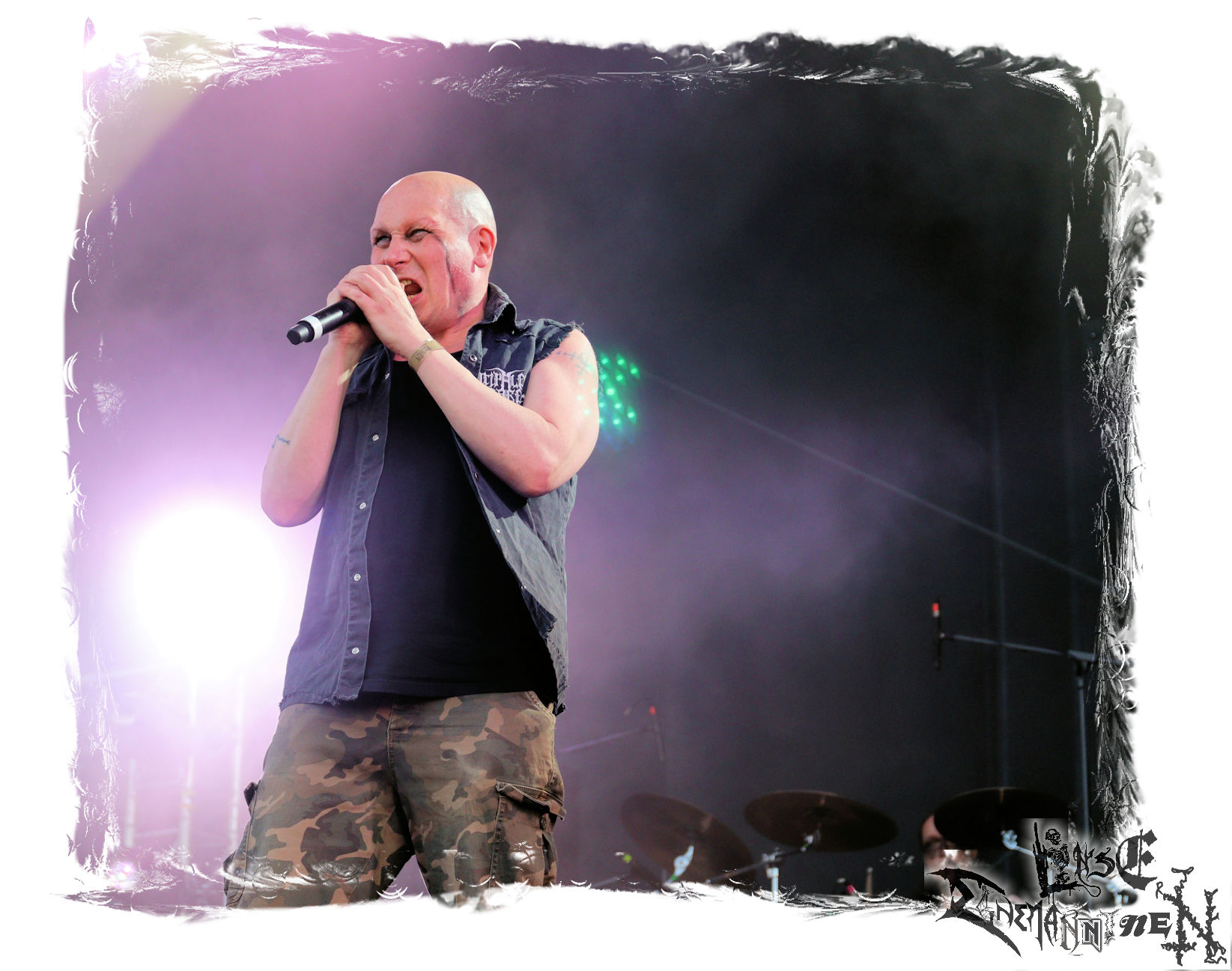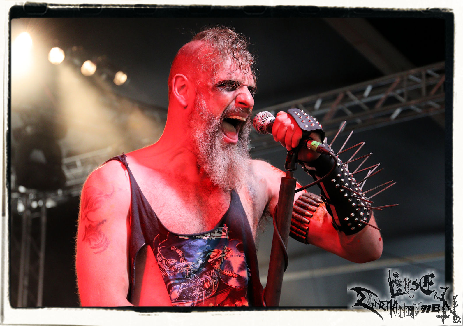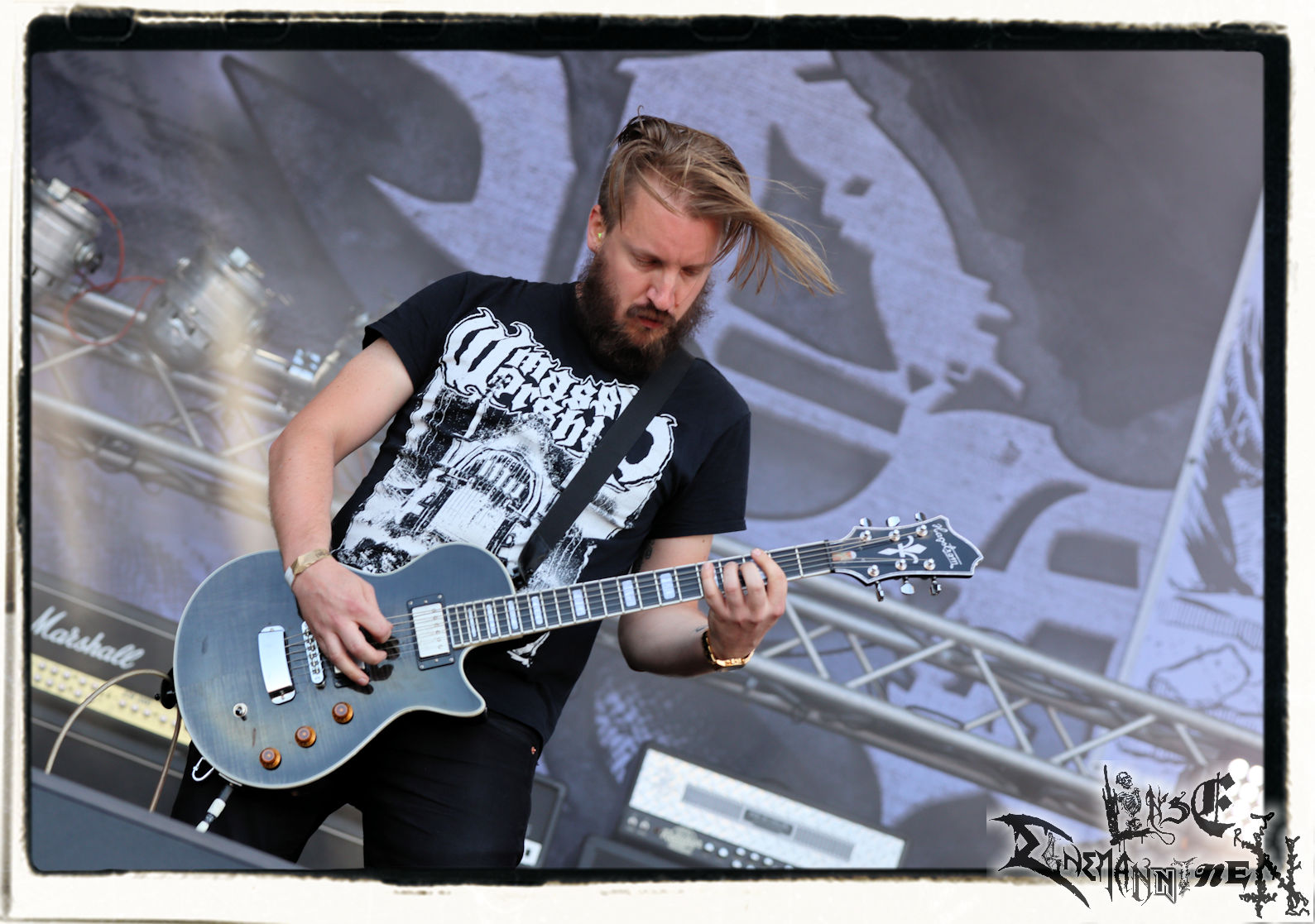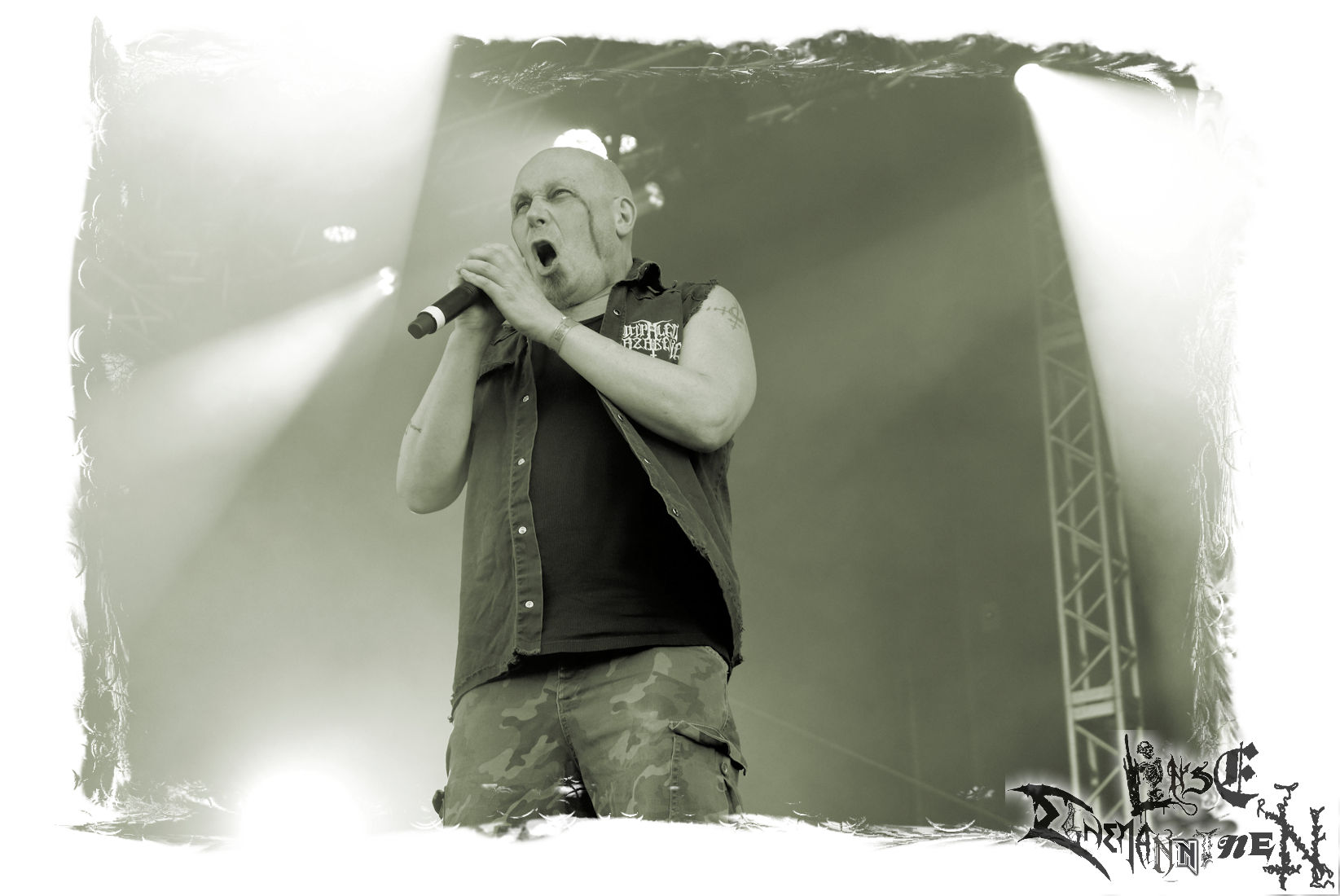 Mit EIS wird der Abend eingeläutet. Die Band aus dem Lupus Lounge – Stall ist wie geschaffen für das Zelt auf dem PARTY.SAN METAL OPEN AIR und beweist eindrucksvoll, wie man Atmosphäre mit mitreißenden Black Metal – Songs kombiniert. Bandkopf Alboin ist gleichzeitig Fan und Vollblutmusiker, der mit den Schwarzmetall-Größen der Neunziger aufgewachsen ist, wobei seine Musik sowohl von diesen, als auch von seiner Bewunderung gegenüber prägenden heimischen Acts wie Helrunar oder auch dem Wirken von Schwadorf mit Sun Of The Sleepless beeinflusst ist. Auch macht er keinen Hehl daraus, dass ihm die Einladung nach Schlotheim mit seiner Band als "Spätberufenem" sehr viel bedeutet. Und diese Haltung schwingt in diesem Konzert mit. Egal, ob Songs vom 2005er-Album "Galeere" ("Durch lichtlose Tiefen", seinerzeit noch unter dem Bandvorgänger Geist veröffentlicht (aus namensrechtlichen Gründen musste man sich danach in Eis umbenennen), vom bisher jüngsten Album "Bannstein" oder vom Klassiker "Wetterkreuz" (2012), der heuer auch schon zehn Jahre auf dem Buckel hat, gespielt werden. Eis zünden ein kleines Highlight, das mir noch lange in Erinnerung bleiben und mich animiert, mir die Scheiben mal wieder zu Gemüte zu führen. Danke!(JD)