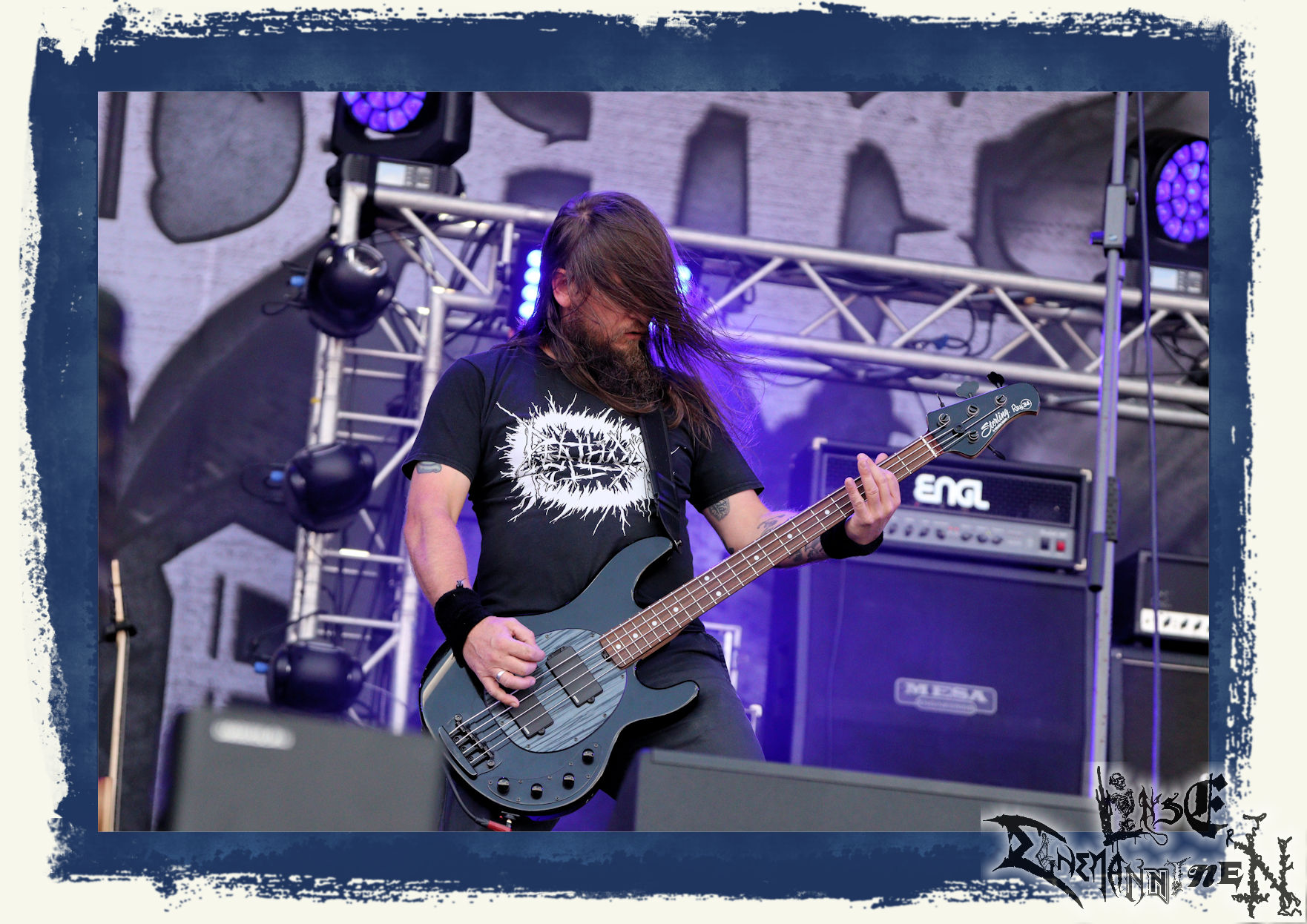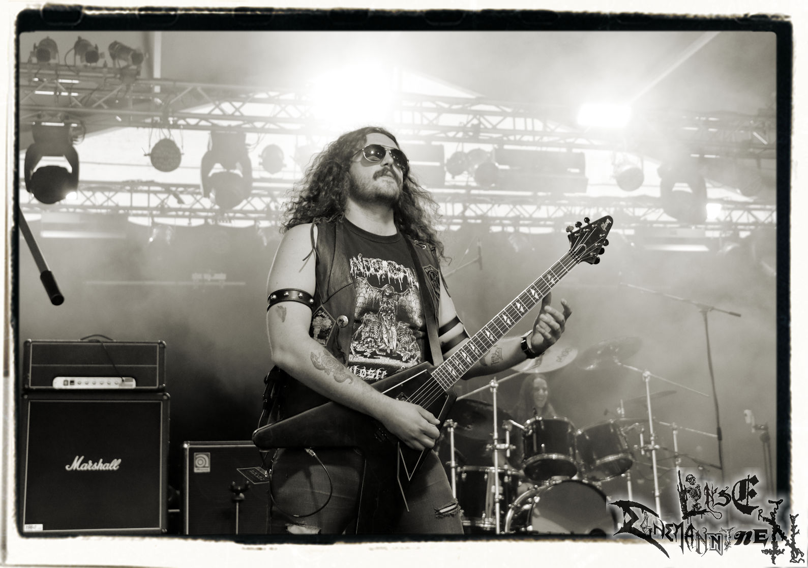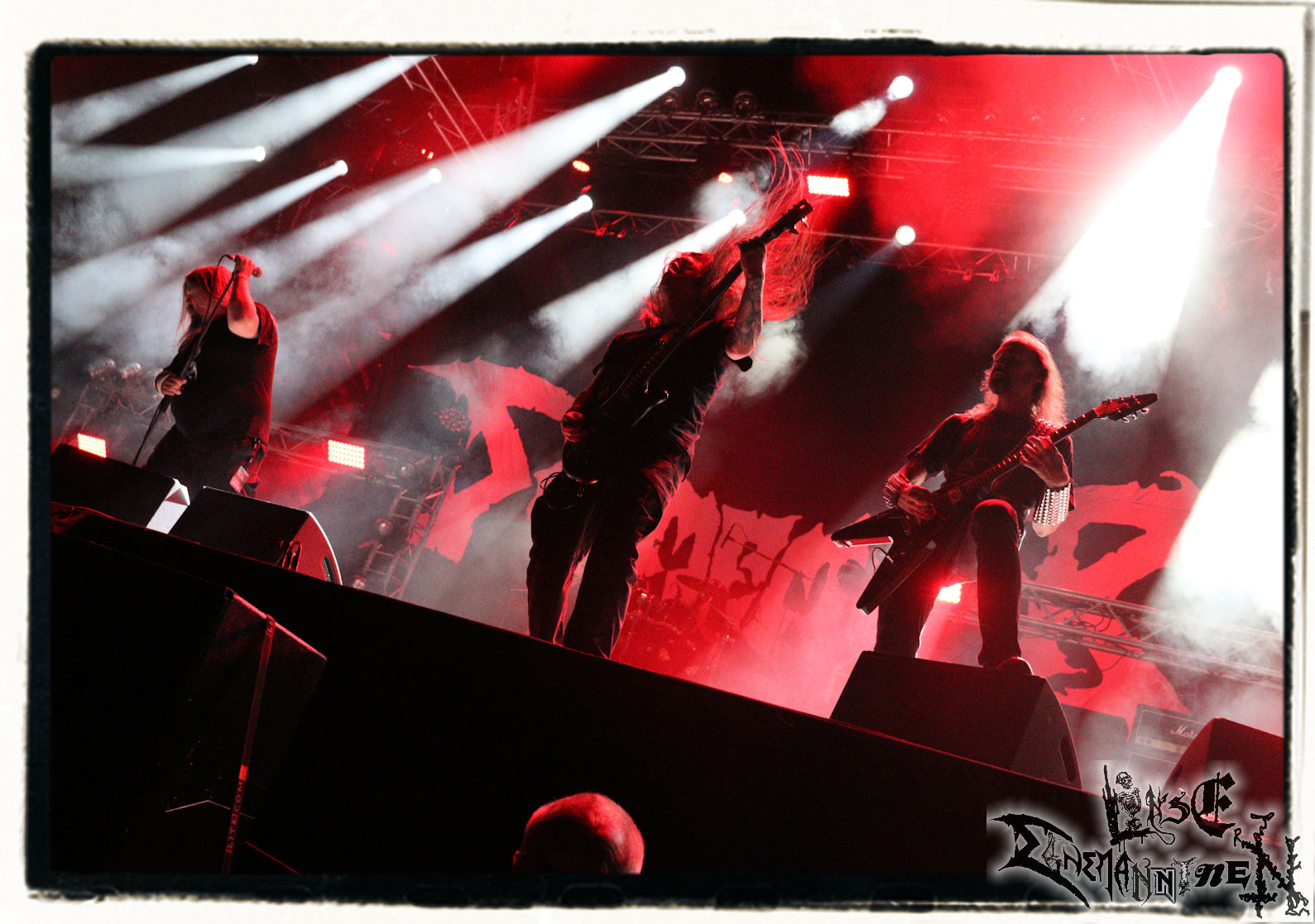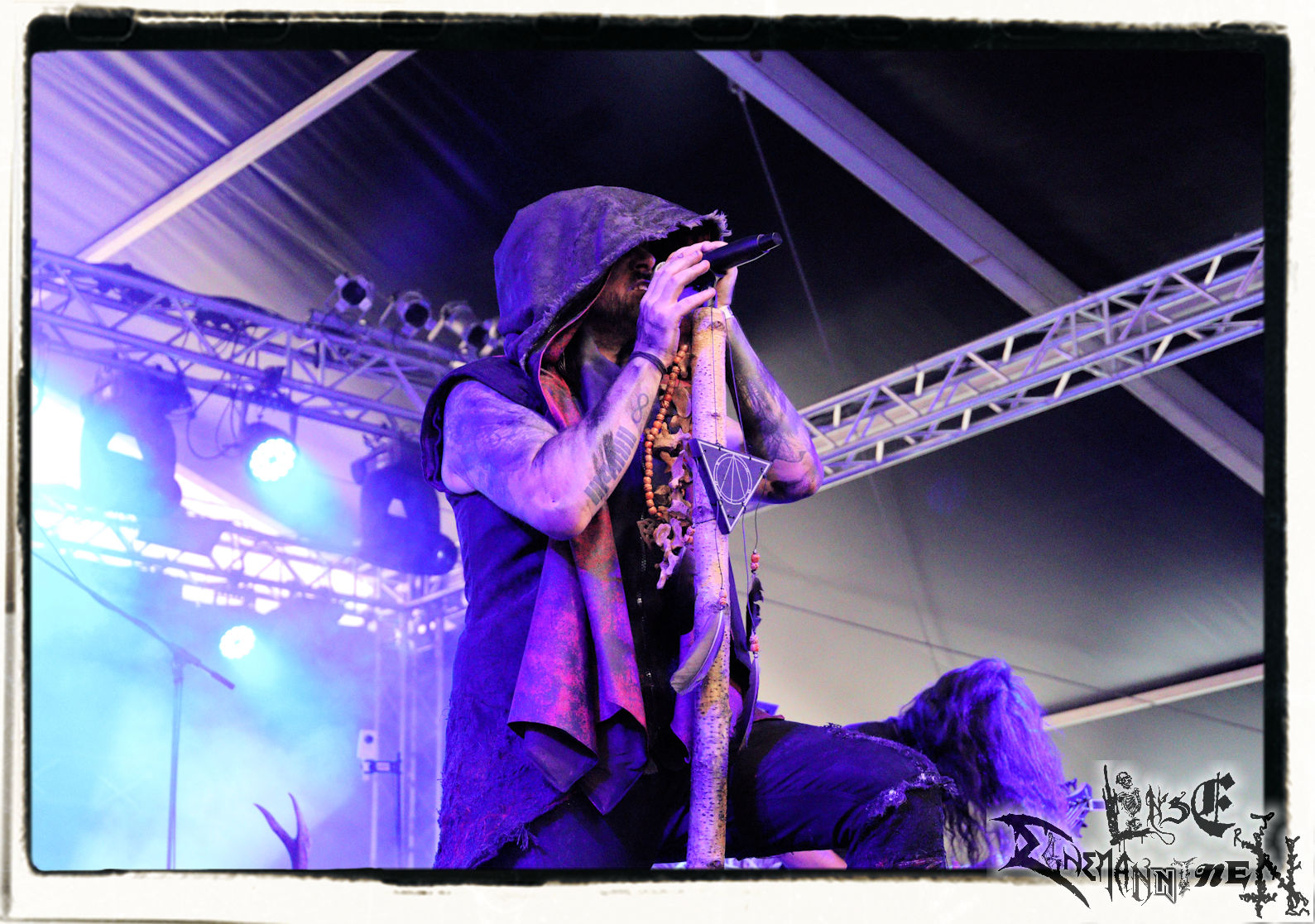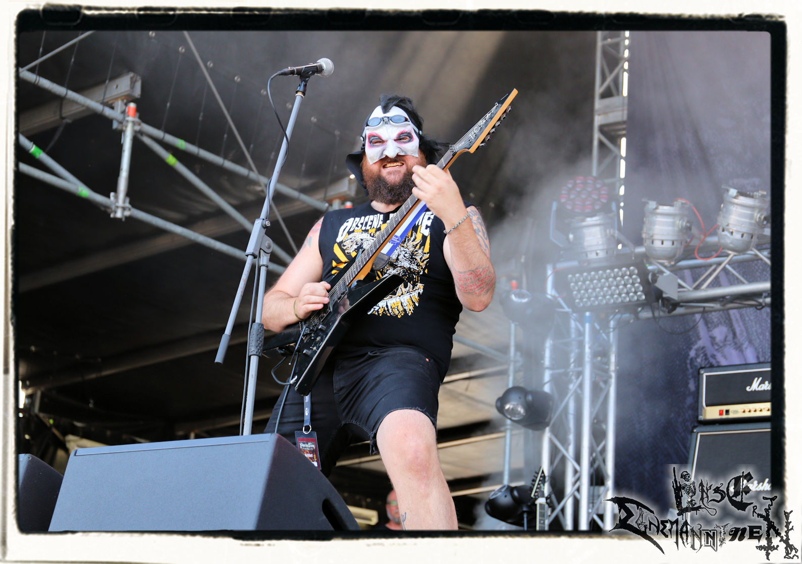 Mit EIS wird der Abend eingeläutet. Die Band aus dem Lupus Lounge – Stall ist wie geschaffen für das Zelt auf dem PARTY.SAN METAL OPEN AIR und beweist eindrucksvoll, wie man Atmosphäre mit mitreißenden Black Metal – Songs kombiniert. Bandkopf Alboin ist gleichzeitig Fan und Vollblutmusiker, der mit den Schwarzmetall-Größen der Neunziger aufgewachsen ist, wobei seine Musik sowohl von diesen, als auch von seiner Bewunderung gegenüber prägenden heimischen Acts wie Helrunar oder auch dem Wirken von Schwadorf mit Sun Of The Sleepless beeinflusst ist. Auch macht er keinen Hehl daraus, dass ihm die Einladung nach Schlotheim mit seiner Band als "Spätberufenem" sehr viel bedeutet. Und diese Haltung schwingt in diesem Konzert mit. Egal, ob Songs vom 2005er-Album "Galeere" ("Durch lichtlose Tiefen", seinerzeit noch unter dem Bandvorgänger Geist veröffentlicht (aus namensrechtlichen Gründen musste man sich danach in Eis umbenennen), vom bisher jüngsten Album "Bannstein" oder vom Klassiker "Wetterkreuz" (2012), der heuer auch schon zehn Jahre auf dem Buckel hat, gespielt werden. Eis zünden ein kleines Highlight, das mir noch lange in Erinnerung bleiben und mich animiert, mir die Scheiben mal wieder zu Gemüte zu führen. Danke!(JD)
