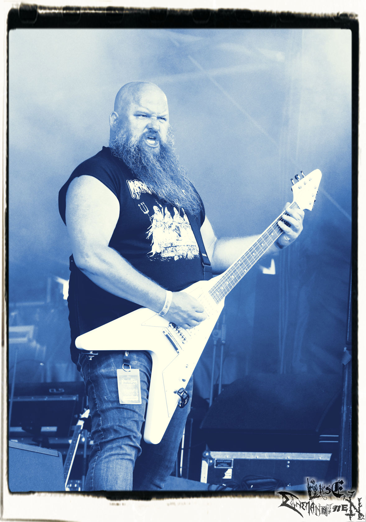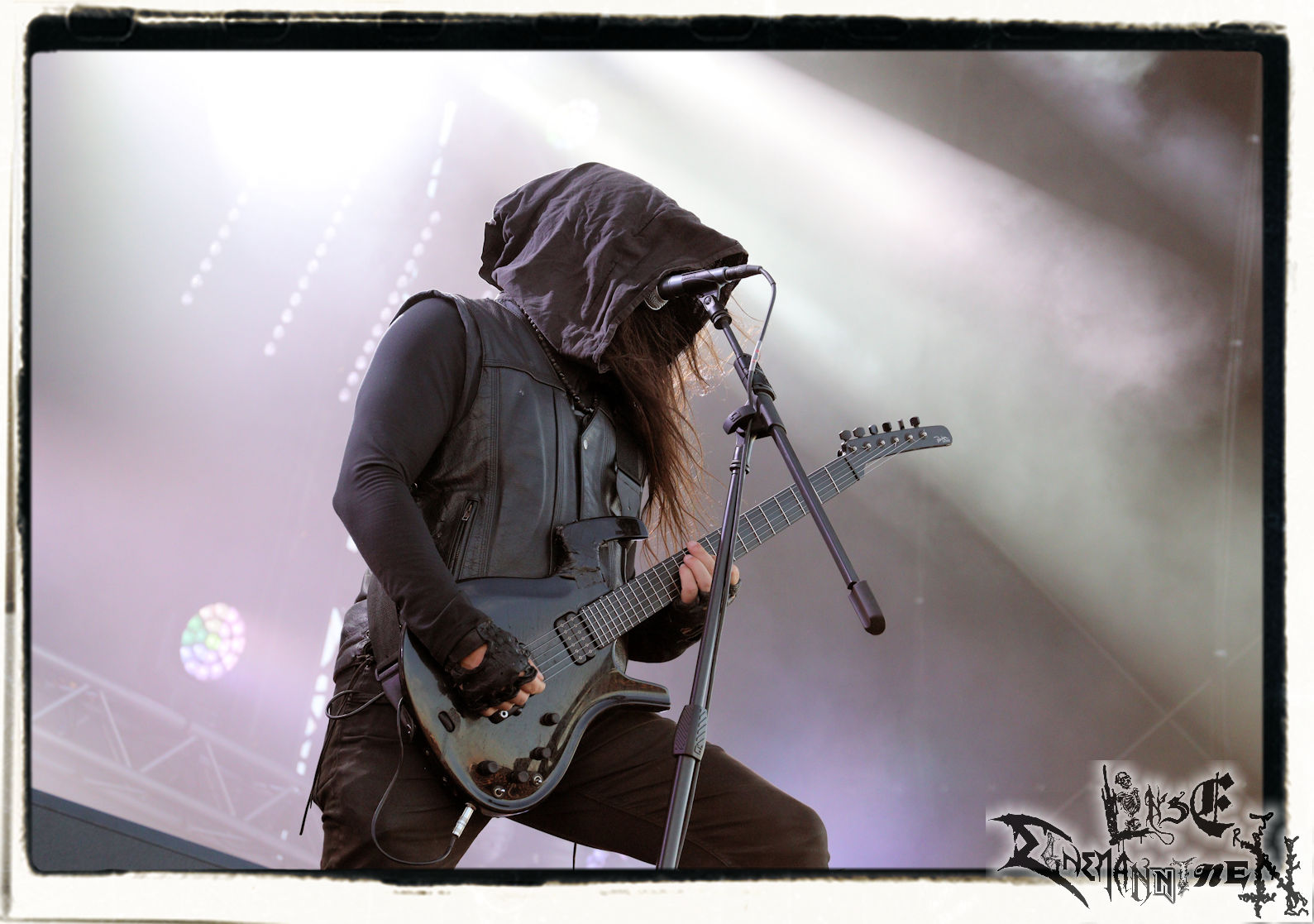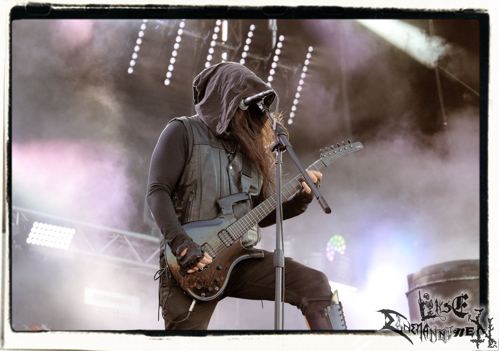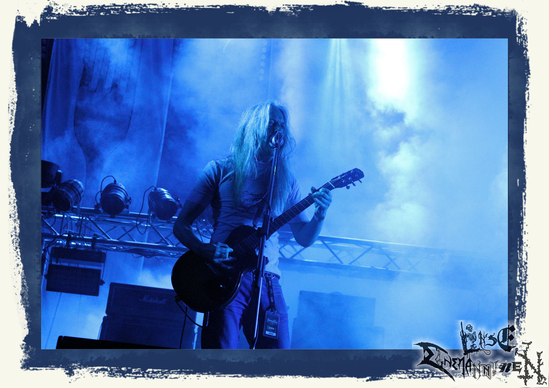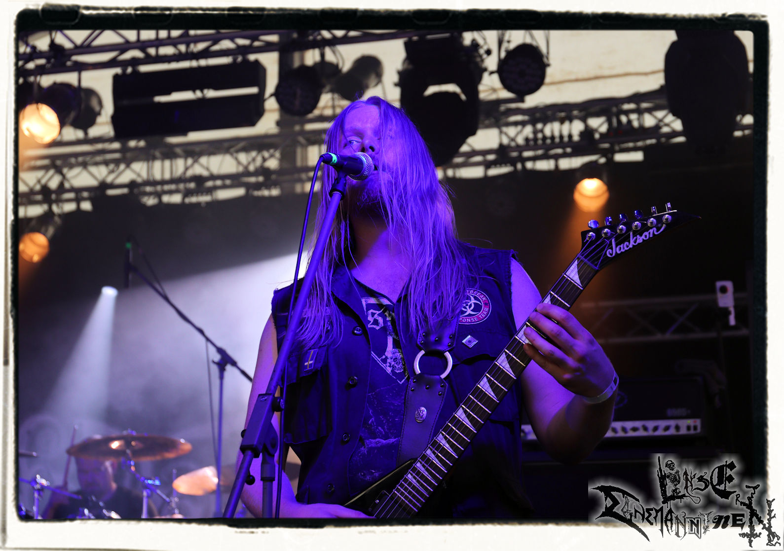 Mit EIS wird der Abend eingeläutet. Die Band aus dem Lupus Lounge – Stall ist wie geschaffen für das Zelt auf dem PARTY.SAN METAL OPEN AIR und beweist eindrucksvoll, wie man Atmosphäre mit mitreißenden Black Metal – Songs kombiniert. Bandkopf Alboin ist gleichzeitig Fan und Vollblutmusiker, der mit den Schwarzmetall-Größen der Neunziger aufgewachsen ist, wobei seine Musik sowohl von diesen, als auch von seiner Bewunderung gegenüber prägenden heimischen Acts wie Helrunar oder auch dem Wirken von Schwadorf mit Sun Of The Sleepless beeinflusst ist. Auch macht er keinen Hehl daraus, dass ihm die Einladung nach Schlotheim mit seiner Band als "Spätberufenem" sehr viel bedeutet. Und diese Haltung schwingt in diesem Konzert mit. Egal, ob Songs vom 2005er-Album "Galeere" ("Durch lichtlose Tiefen", seinerzeit noch unter dem Bandvorgänger Geist veröffentlicht (aus namensrechtlichen Gründen musste man sich danach in Eis umbenennen), vom bisher jüngsten Album "Bannstein" oder vom Klassiker "Wetterkreuz" (2012), der heuer auch schon zehn Jahre auf dem Buckel hat, gespielt werden. Eis zünden ein kleines Highlight, das mir noch lange in Erinnerung bleiben und mich animiert, mir die Scheiben mal wieder zu Gemüte zu führen. Danke!(JD)