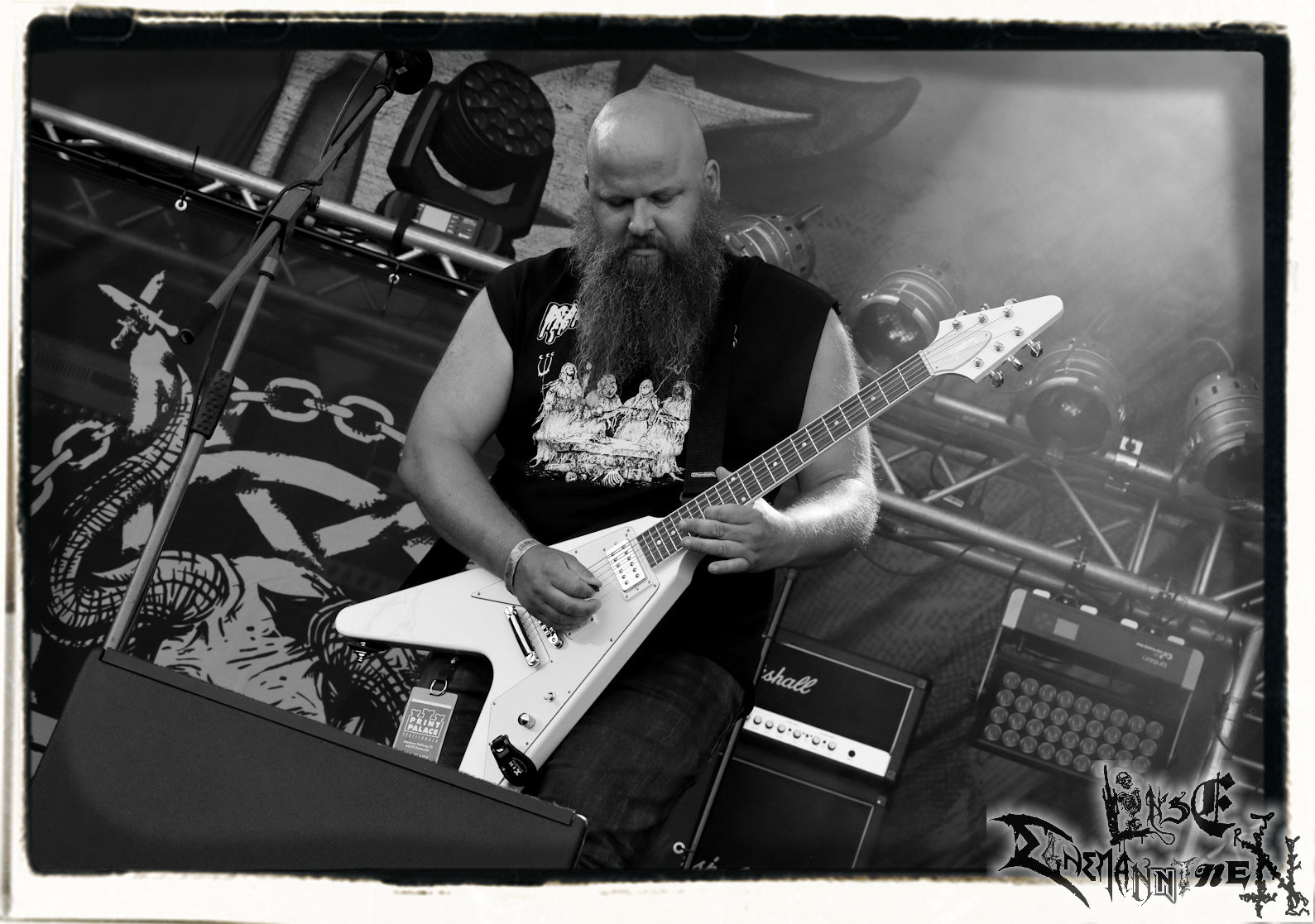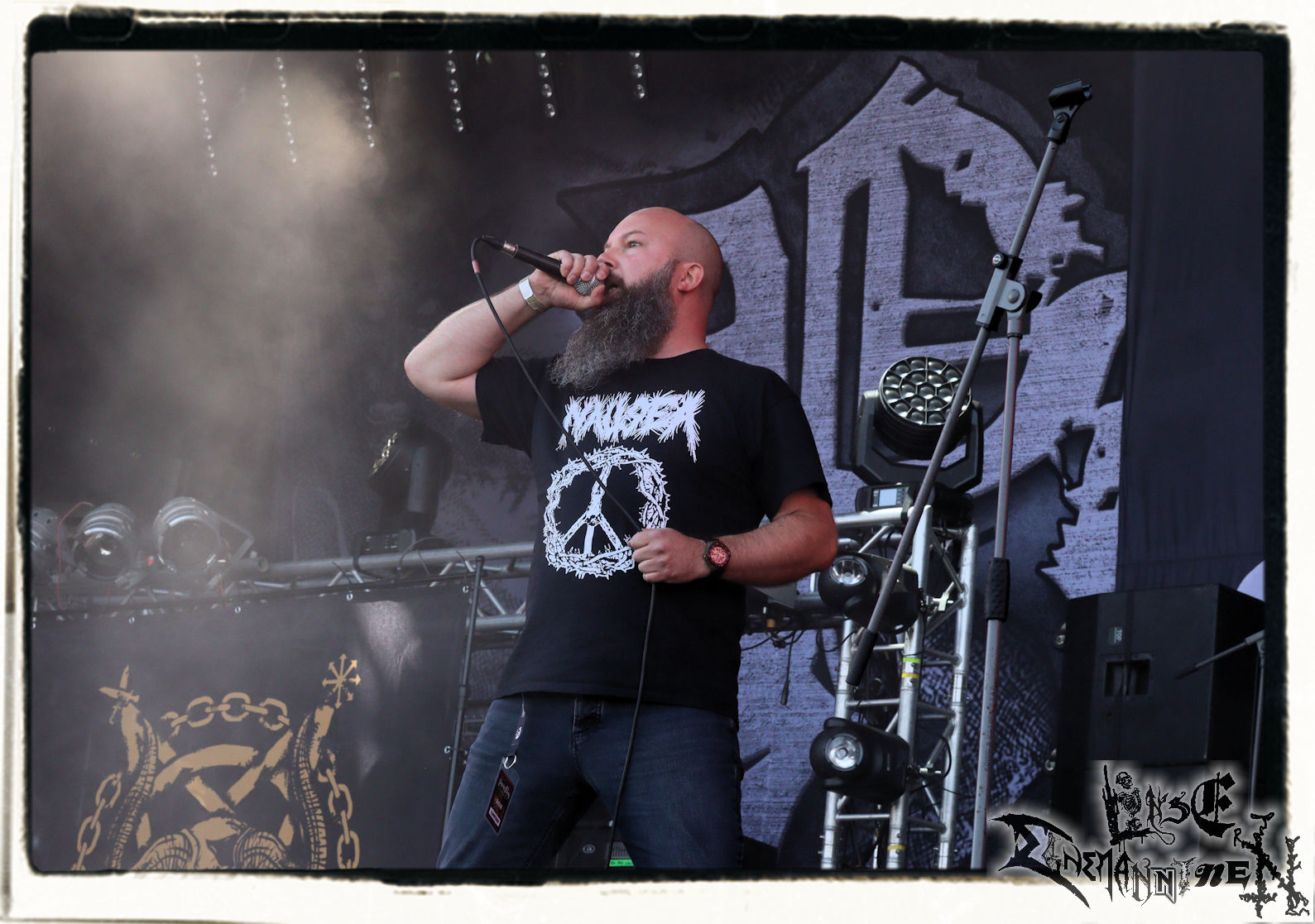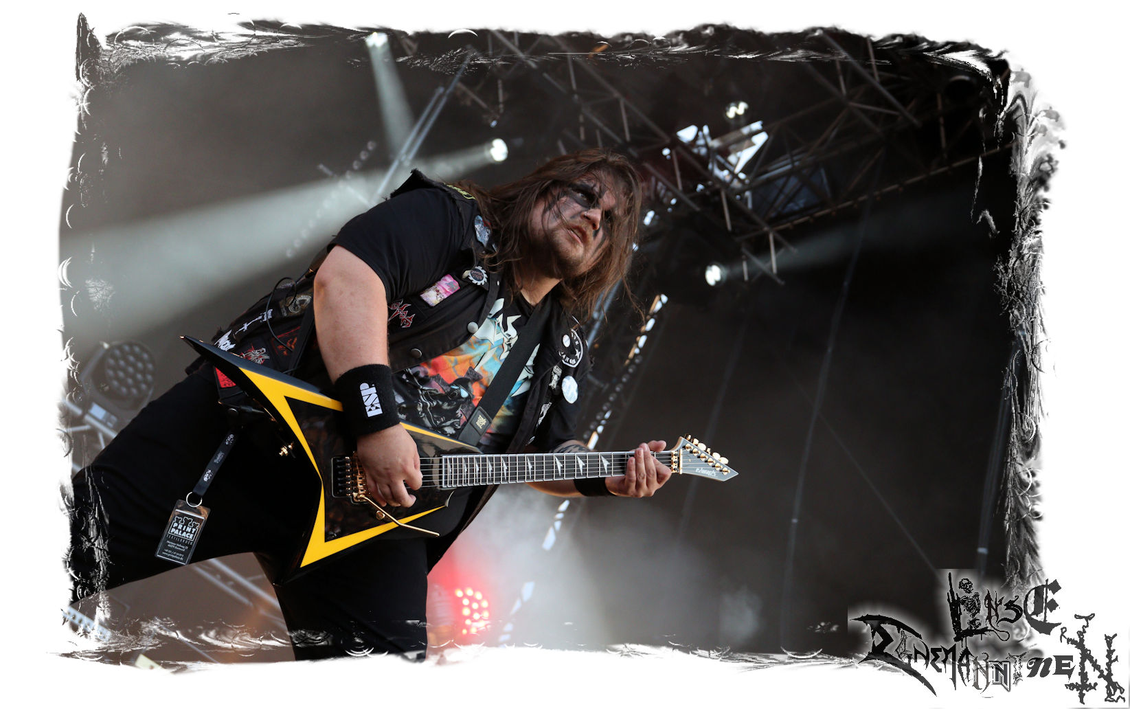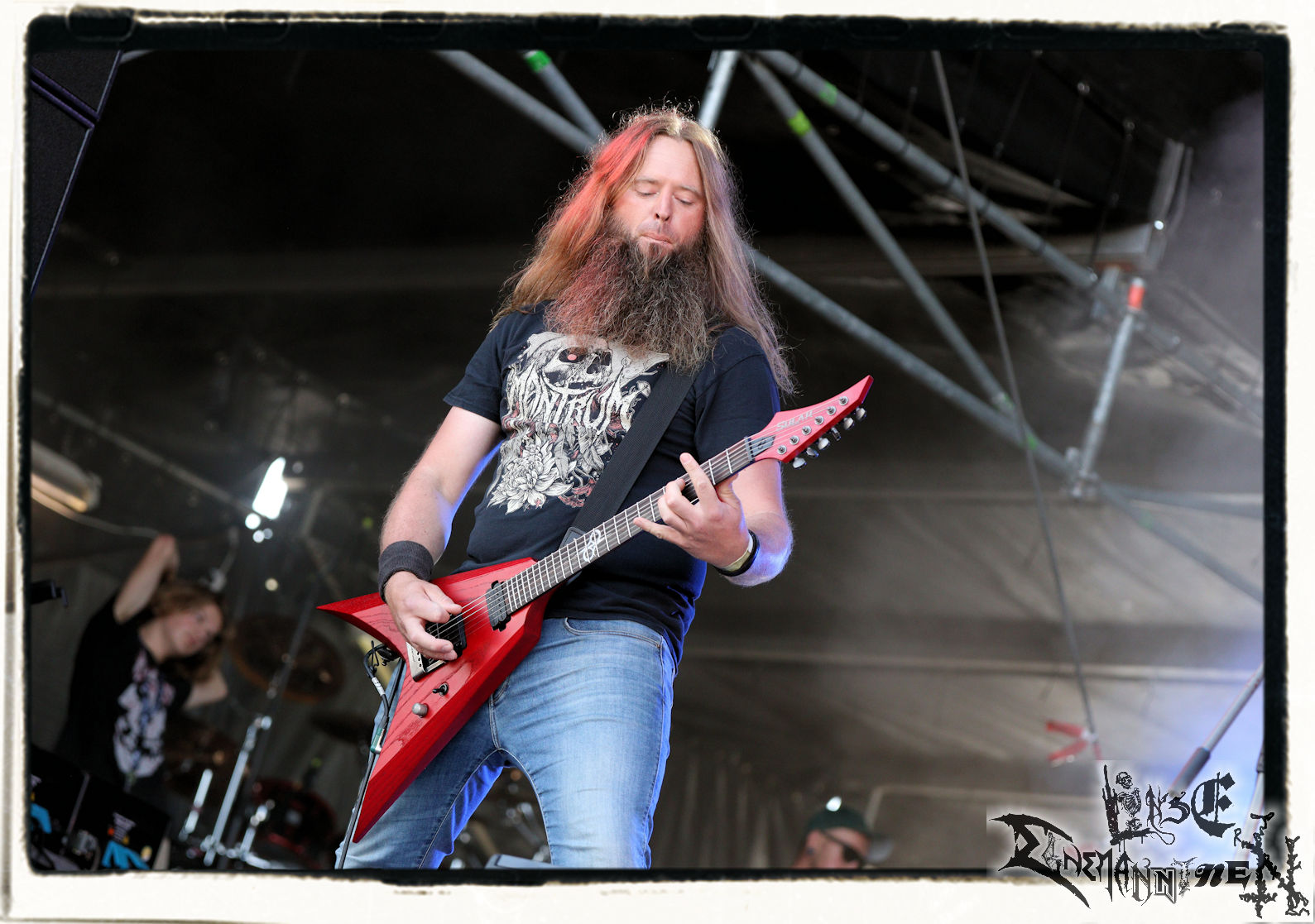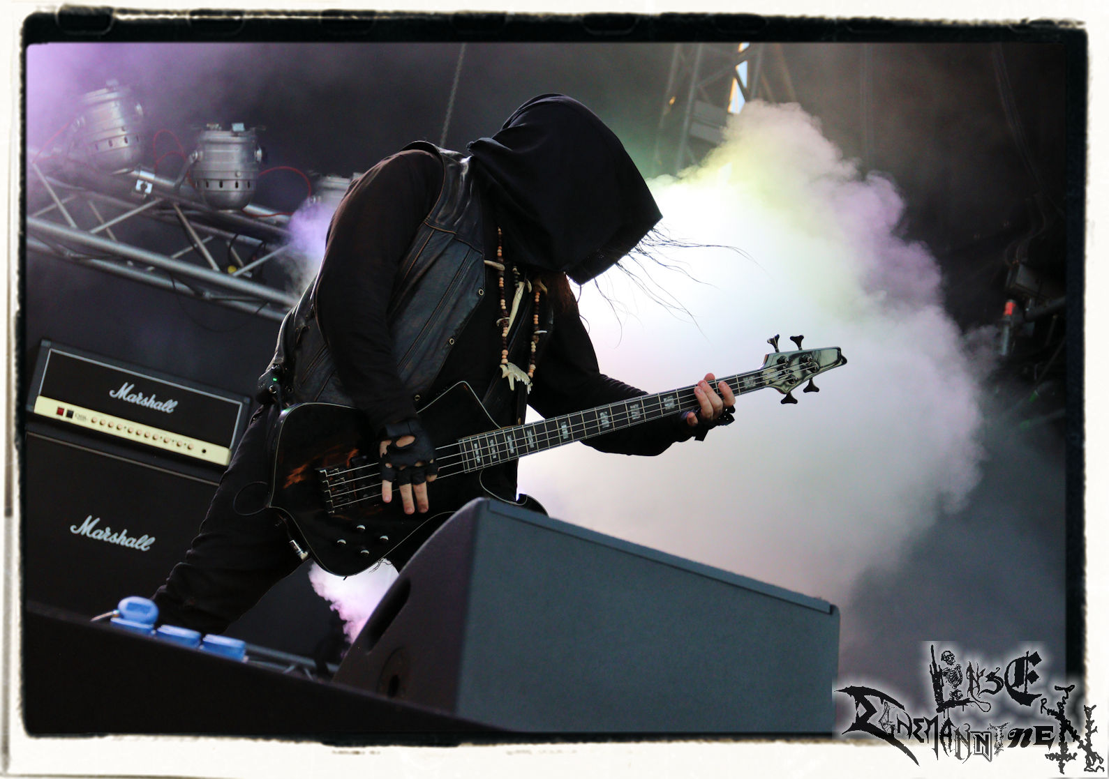 Mit EIS wird der Abend eingeläutet. Die Band aus dem Lupus Lounge – Stall ist wie geschaffen für das Zelt auf dem PARTY.SAN METAL OPEN AIR und beweist eindrucksvoll, wie man Atmosphäre mit mitreißenden Black Metal – Songs kombiniert. Bandkopf Alboin ist gleichzeitig Fan und Vollblutmusiker, der mit den Schwarzmetall-Größen der Neunziger aufgewachsen ist, wobei seine Musik sowohl von diesen, als auch von seiner Bewunderung gegenüber prägenden heimischen Acts wie Helrunar oder auch dem Wirken von Schwadorf mit Sun Of The Sleepless beeinflusst ist. Auch macht er keinen Hehl daraus, dass ihm die Einladung nach Schlotheim mit seiner Band als "Spätberufenem" sehr viel bedeutet. Und diese Haltung schwingt in diesem Konzert mit. Egal, ob Songs vom 2005er-Album "Galeere" ("Durch lichtlose Tiefen", seinerzeit noch unter dem Bandvorgänger Geist veröffentlicht (aus namensrechtlichen Gründen musste man sich danach in Eis umbenennen), vom bisher jüngsten Album "Bannstein" oder vom Klassiker "Wetterkreuz" (2012), der heuer auch schon zehn Jahre auf dem Buckel hat, gespielt werden. Eis zünden ein kleines Highlight, das mir noch lange in Erinnerung bleiben und mich animiert, mir die Scheiben mal wieder zu Gemüte zu führen. Danke!(JD)