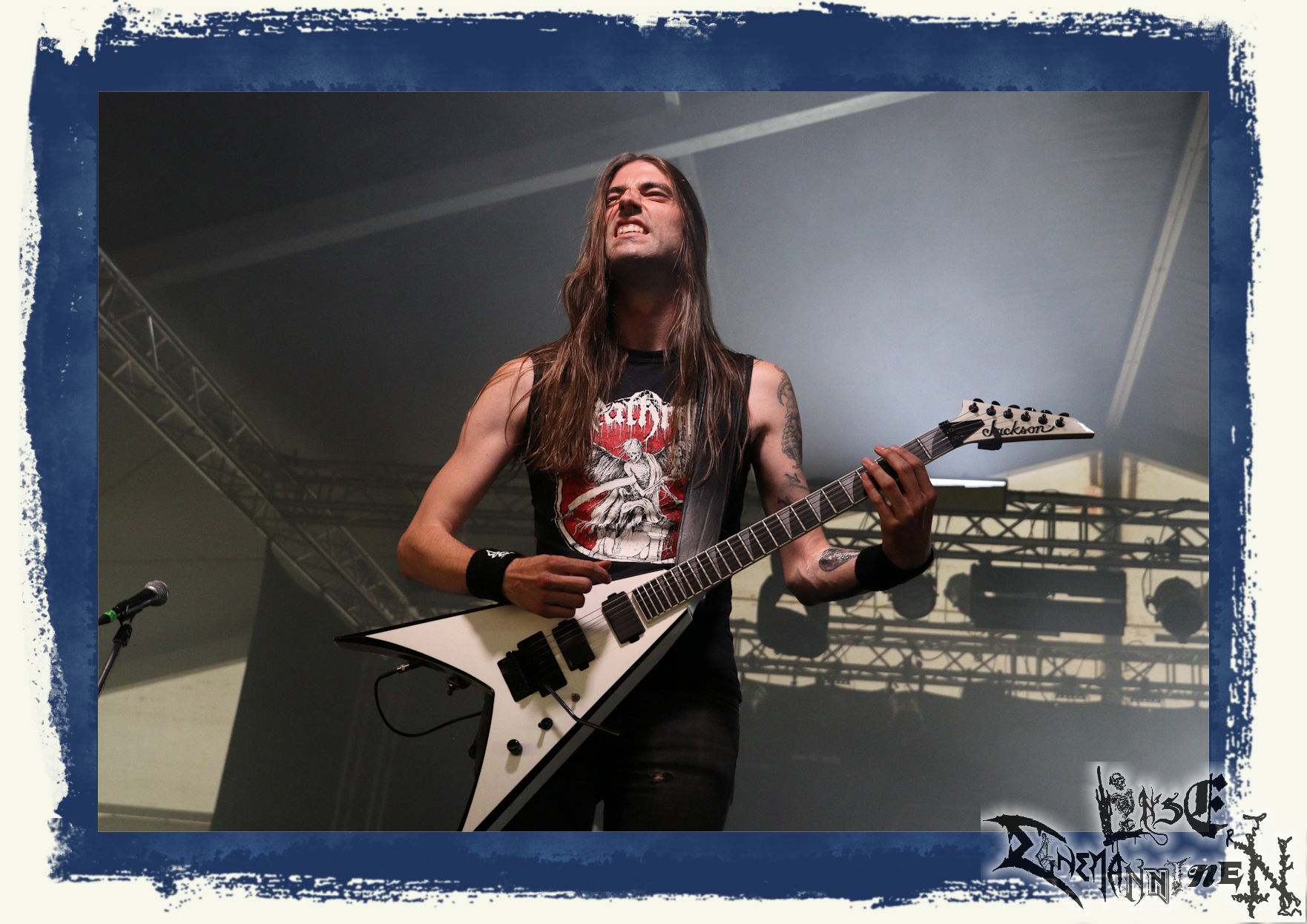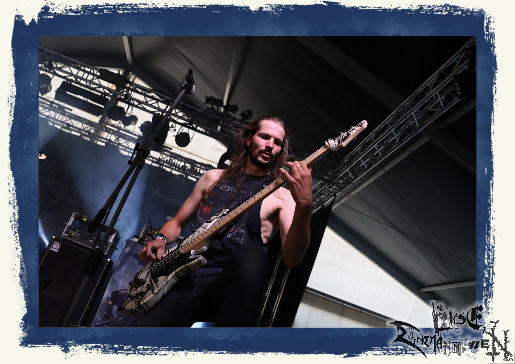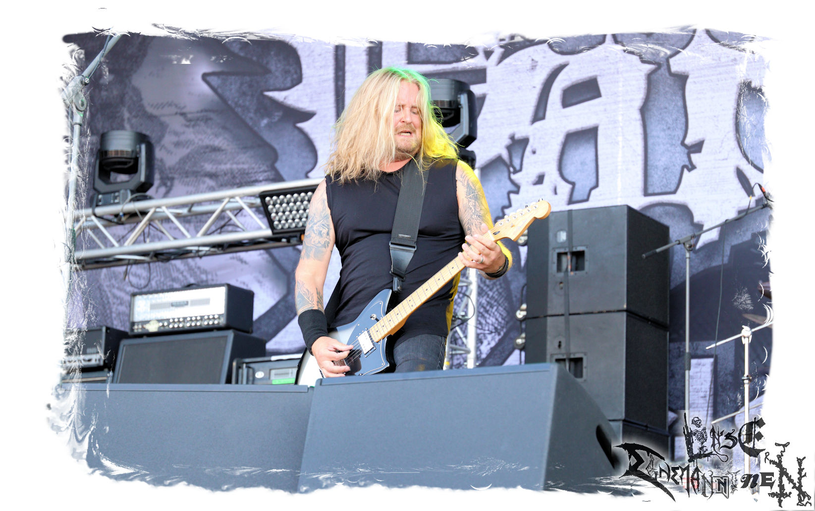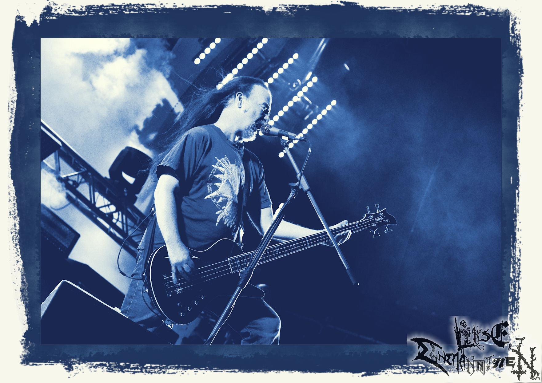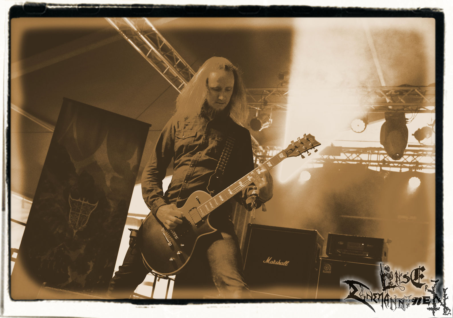 Mit EIS wird der Abend eingeläutet. Die Band aus dem Lupus Lounge – Stall ist wie geschaffen für das Zelt auf dem PARTY.SAN METAL OPEN AIR und beweist eindrucksvoll, wie man Atmosphäre mit mitreißenden Black Metal – Songs kombiniert. Bandkopf Alboin ist gleichzeitig Fan und Vollblutmusiker, der mit den Schwarzmetall-Größen der Neunziger aufgewachsen ist, wobei seine Musik sowohl von diesen, als auch von seiner Bewunderung gegenüber prägenden heimischen Acts wie Helrunar oder auch dem Wirken von Schwadorf mit Sun Of The Sleepless beeinflusst ist. Auch macht er keinen Hehl daraus, dass ihm die Einladung nach Schlotheim mit seiner Band als "Spätberufenem" sehr viel bedeutet. Und diese Haltung schwingt in diesem Konzert mit. Egal, ob Songs vom 2005er-Album "Galeere" ("Durch lichtlose Tiefen", seinerzeit noch unter dem Bandvorgänger Geist veröffentlicht (aus namensrechtlichen Gründen musste man sich danach in Eis umbenennen), vom bisher jüngsten Album "Bannstein" oder vom Klassiker "Wetterkreuz" (2012), der heuer auch schon zehn Jahre auf dem Buckel hat, gespielt werden. Eis zünden ein kleines Highlight, das mir noch lange in Erinnerung bleiben und mich animiert, mir die Scheiben mal wieder zu Gemüte zu führen. Danke!(JD)