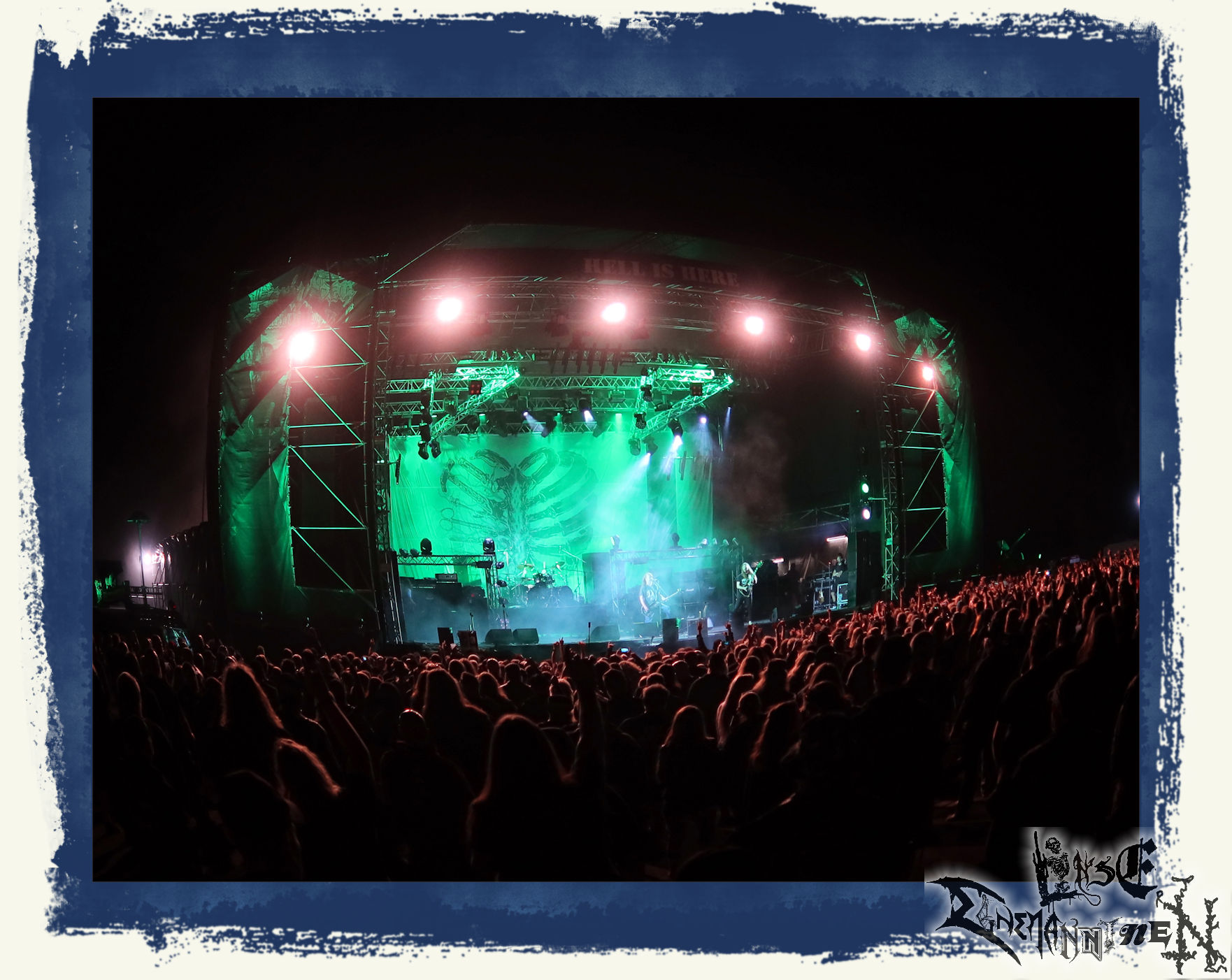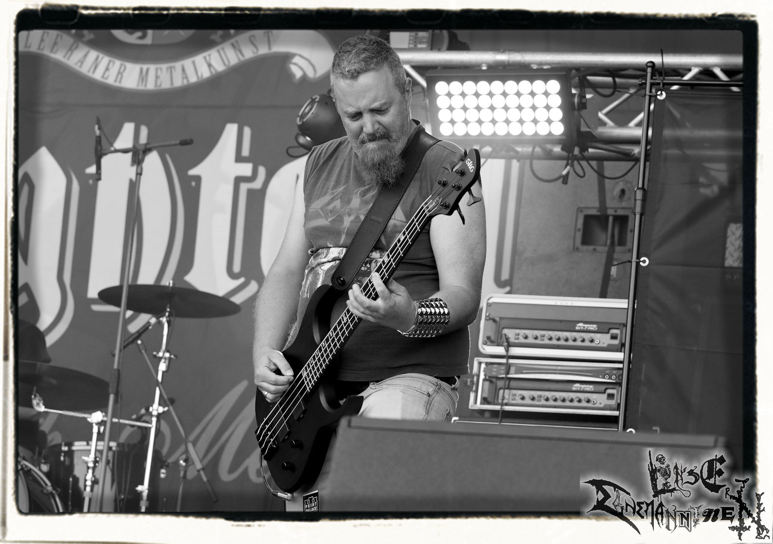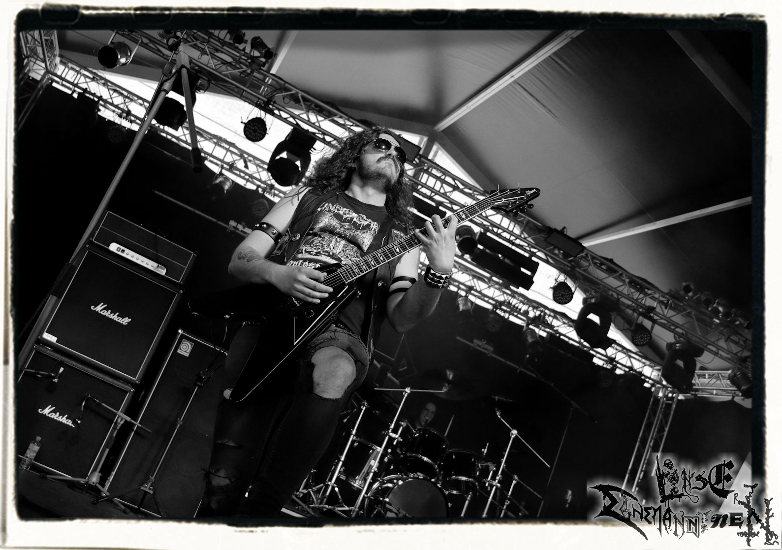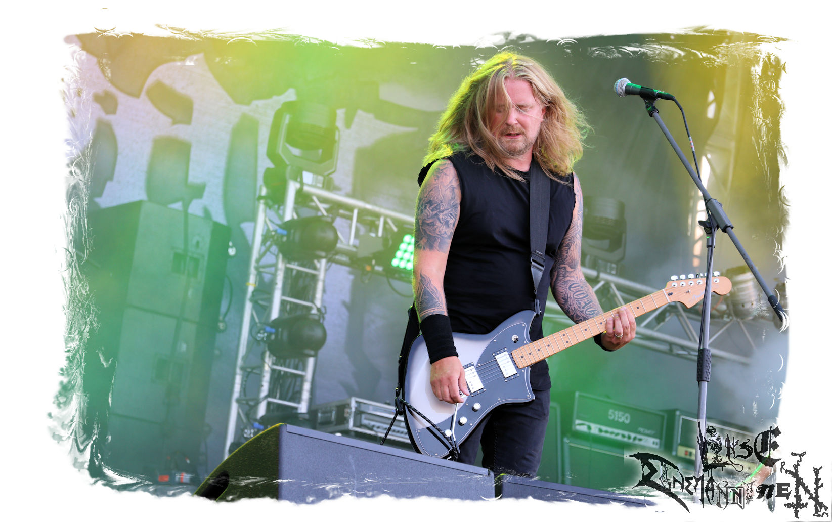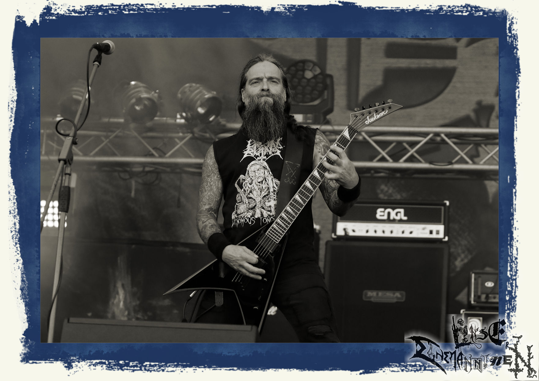 Mit EIS wird der Abend eingeläutet. Die Band aus dem Lupus Lounge – Stall ist wie geschaffen für das Zelt auf dem PARTY.SAN METAL OPEN AIR und beweist eindrucksvoll, wie man Atmosphäre mit mitreißenden Black Metal – Songs kombiniert. Bandkopf Alboin ist gleichzeitig Fan und Vollblutmusiker, der mit den Schwarzmetall-Größen der Neunziger aufgewachsen ist, wobei seine Musik sowohl von diesen, als auch von seiner Bewunderung gegenüber prägenden heimischen Acts wie Helrunar oder auch dem Wirken von Schwadorf mit Sun Of The Sleepless beeinflusst ist. Auch macht er keinen Hehl daraus, dass ihm die Einladung nach Schlotheim mit seiner Band als "Spätberufenem" sehr viel bedeutet. Und diese Haltung schwingt in diesem Konzert mit. Egal, ob Songs vom 2005er-Album "Galeere" ("Durch lichtlose Tiefen", seinerzeit noch unter dem Bandvorgänger Geist veröffentlicht (aus namensrechtlichen Gründen musste man sich danach in Eis umbenennen), vom bisher jüngsten Album "Bannstein" oder vom Klassiker "Wetterkreuz" (2012), der heuer auch schon zehn Jahre auf dem Buckel hat, gespielt werden. Eis zünden ein kleines Highlight, das mir noch lange in Erinnerung bleiben und mich animiert, mir die Scheiben mal wieder zu Gemüte zu führen. Danke!(JD)