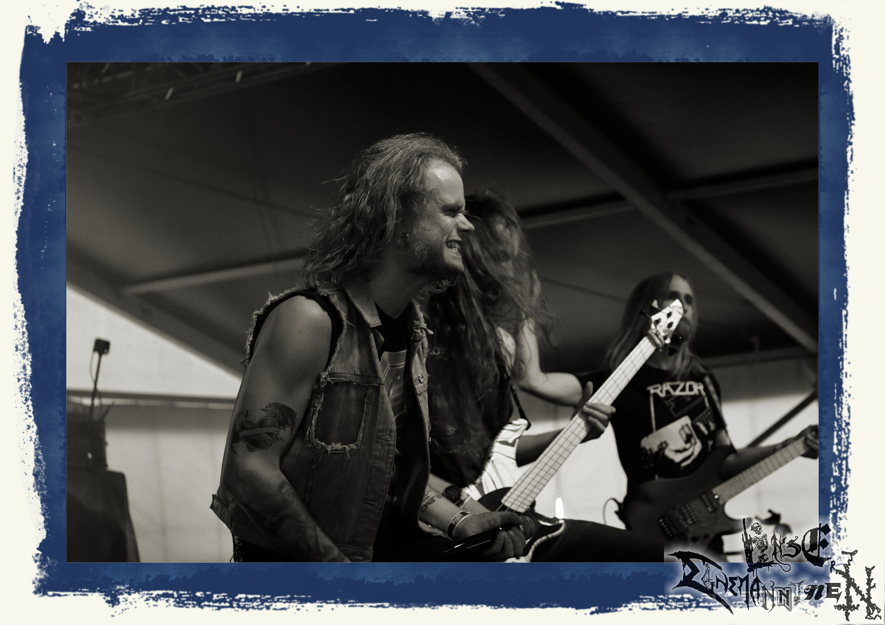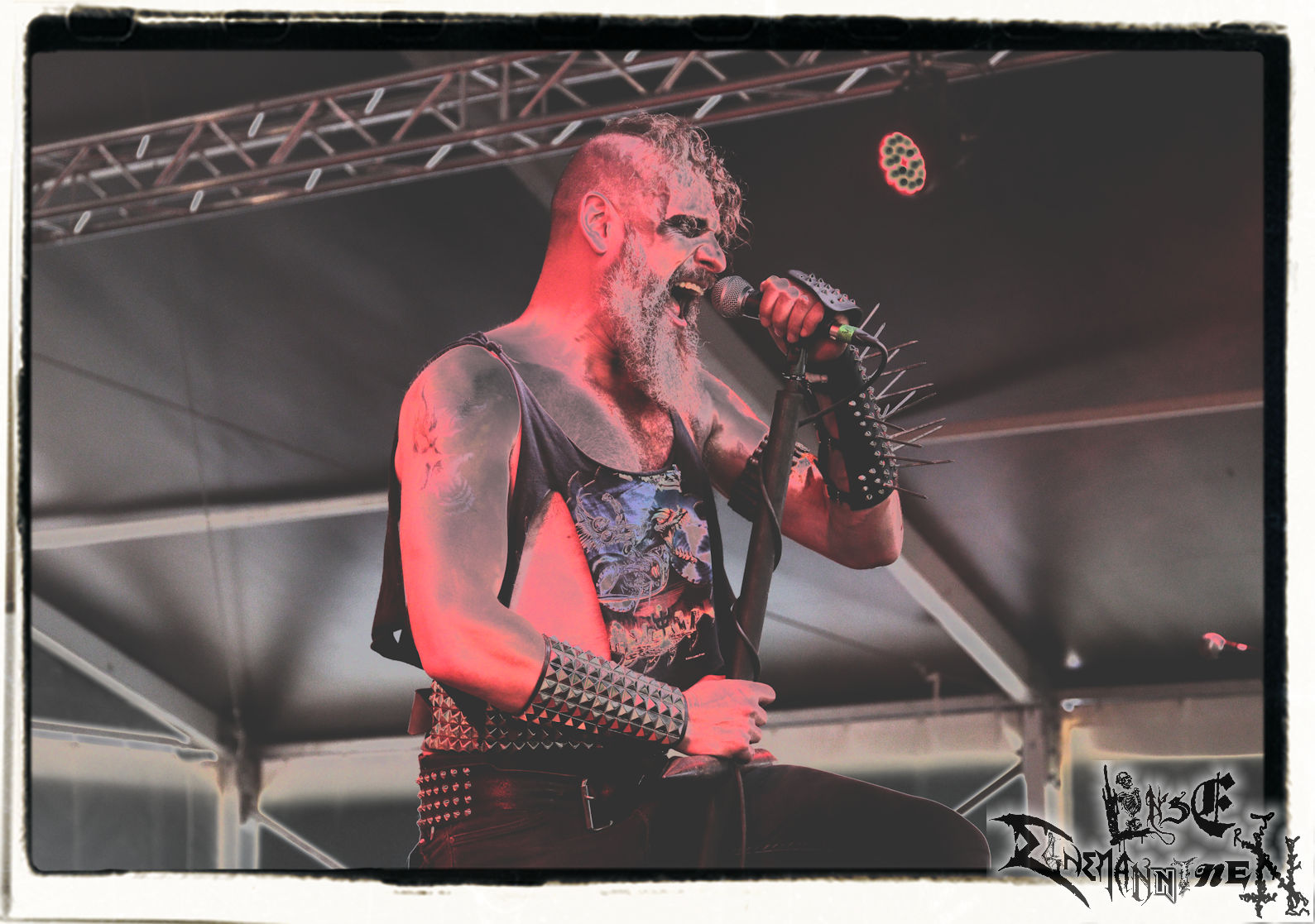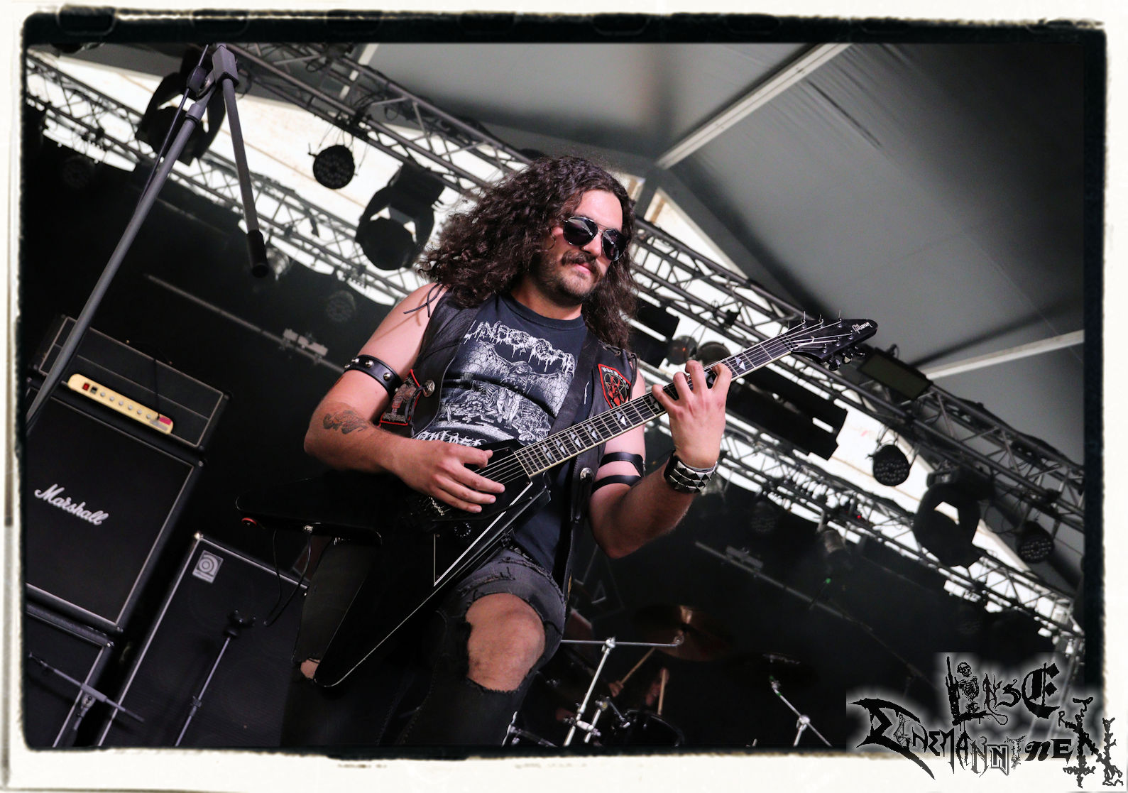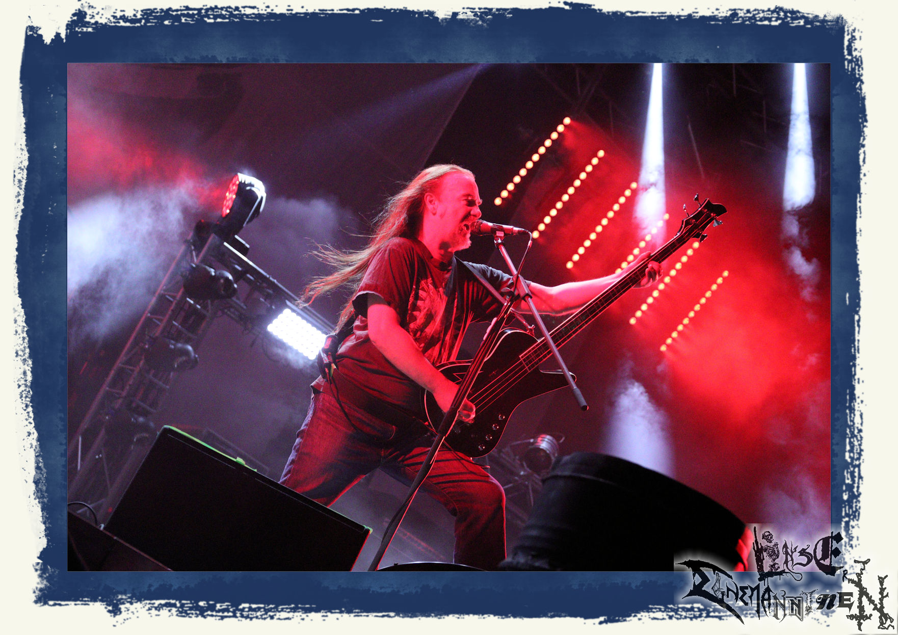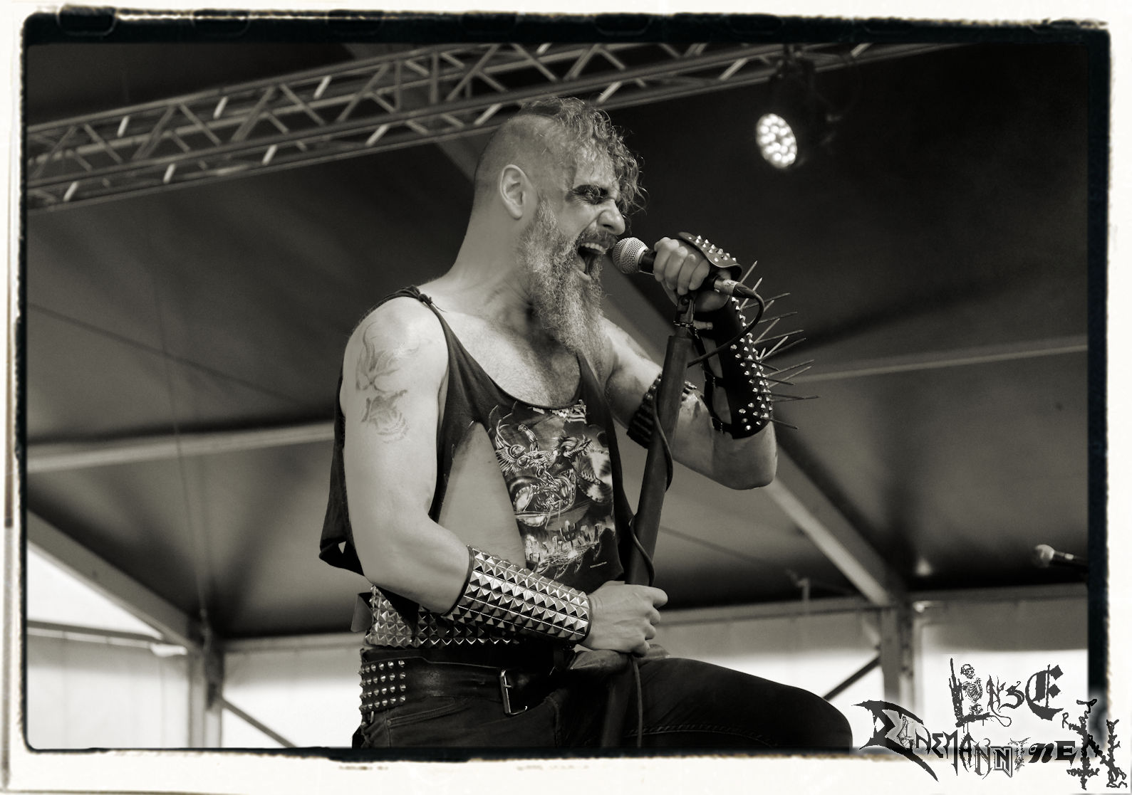 Mit EIS wird der Abend eingeläutet. Die Band aus dem Lupus Lounge – Stall ist wie geschaffen für das Zelt auf dem PARTY.SAN METAL OPEN AIR und beweist eindrucksvoll, wie man Atmosphäre mit mitreißenden Black Metal – Songs kombiniert. Bandkopf Alboin ist gleichzeitig Fan und Vollblutmusiker, der mit den Schwarzmetall-Größen der Neunziger aufgewachsen ist, wobei seine Musik sowohl von diesen, als auch von seiner Bewunderung gegenüber prägenden heimischen Acts wie Helrunar oder auch dem Wirken von Schwadorf mit Sun Of The Sleepless beeinflusst ist. Auch macht er keinen Hehl daraus, dass ihm die Einladung nach Schlotheim mit seiner Band als "Spätberufenem" sehr viel bedeutet. Und diese Haltung schwingt in diesem Konzert mit. Egal, ob Songs vom 2005er-Album "Galeere" ("Durch lichtlose Tiefen", seinerzeit noch unter dem Bandvorgänger Geist veröffentlicht (aus namensrechtlichen Gründen musste man sich danach in Eis umbenennen), vom bisher jüngsten Album "Bannstein" oder vom Klassiker "Wetterkreuz" (2012), der heuer auch schon zehn Jahre auf dem Buckel hat, gespielt werden. Eis zünden ein kleines Highlight, das mir noch lange in Erinnerung bleiben und mich animiert, mir die Scheiben mal wieder zu Gemüte zu führen. Danke!(JD)