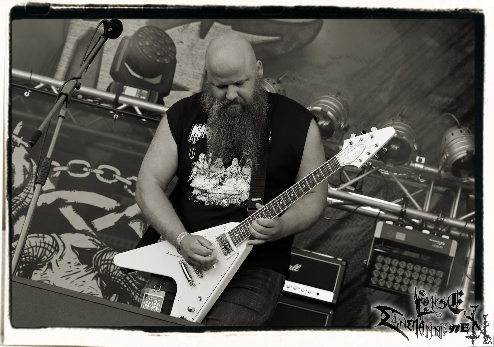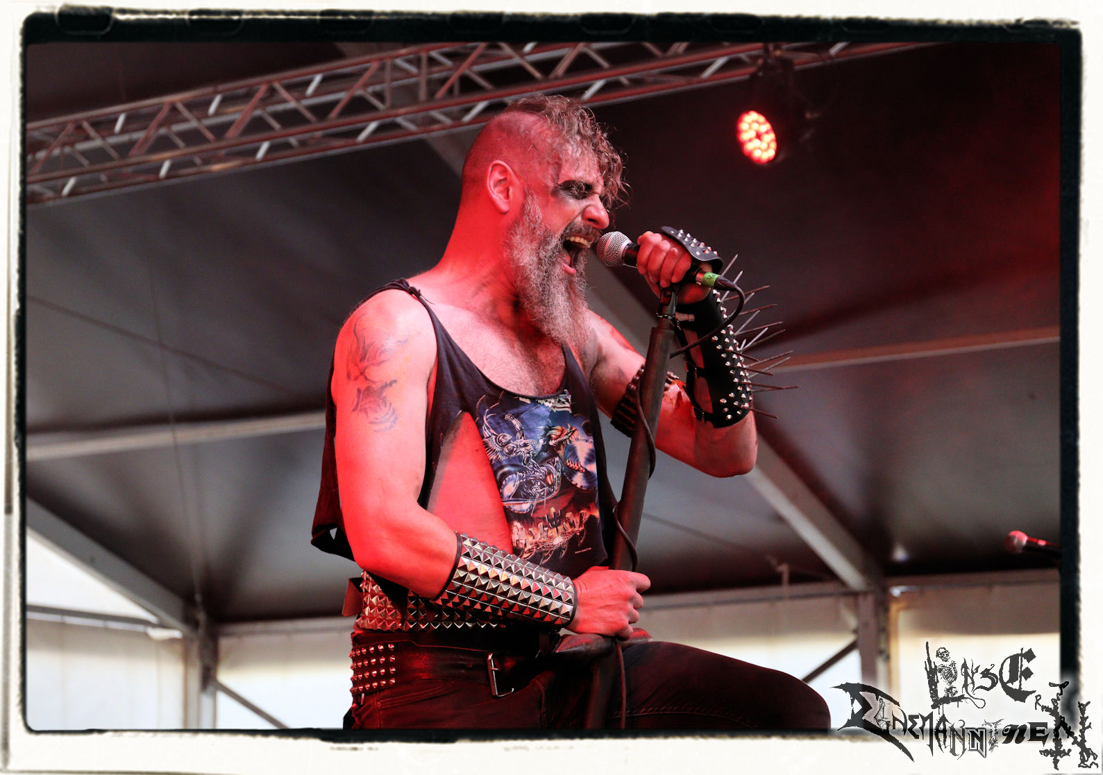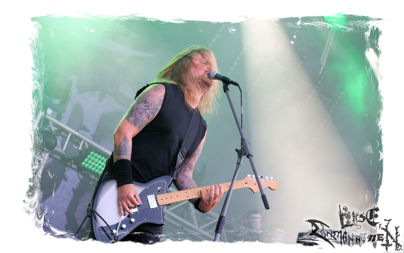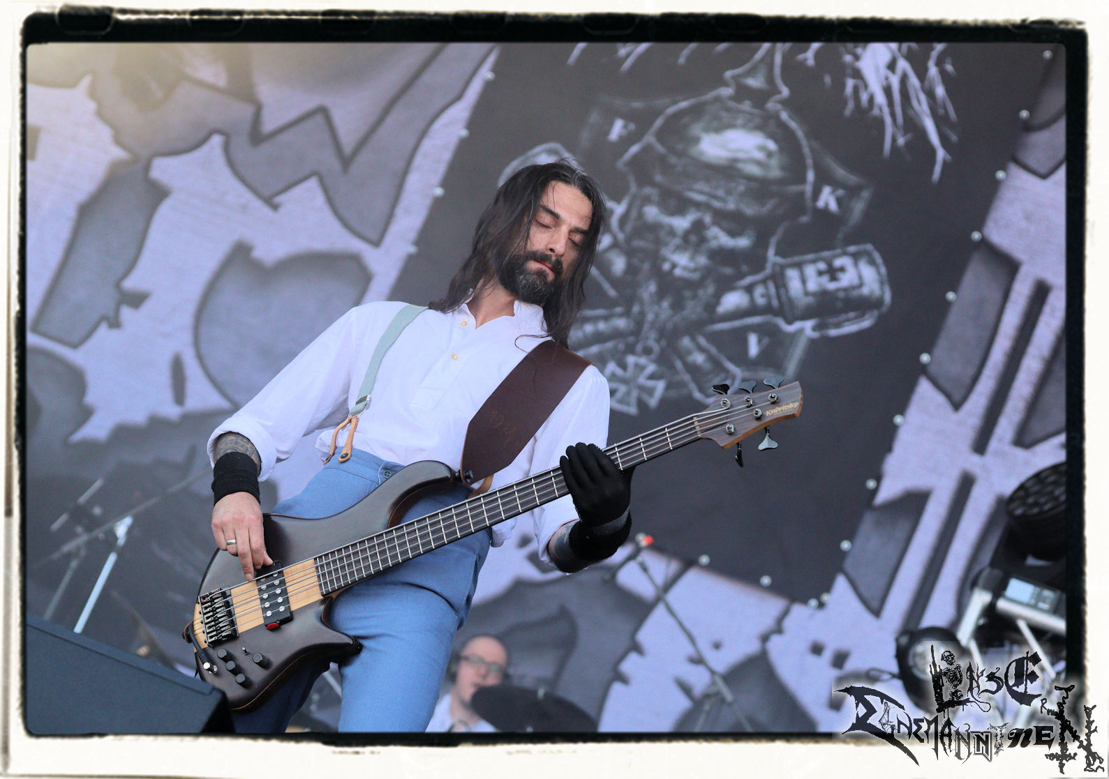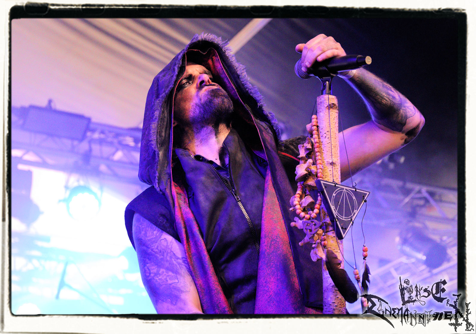 Mit EIS wird der Abend eingeläutet. Die Band aus dem Lupus Lounge – Stall ist wie geschaffen für das Zelt auf dem PARTY.SAN METAL OPEN AIR und beweist eindrucksvoll, wie man Atmosphäre mit mitreißenden Black Metal – Songs kombiniert. Bandkopf Alboin ist gleichzeitig Fan und Vollblutmusiker, der mit den Schwarzmetall-Größen der Neunziger aufgewachsen ist, wobei seine Musik sowohl von diesen, als auch von seiner Bewunderung gegenüber prägenden heimischen Acts wie Helrunar oder auch dem Wirken von Schwadorf mit Sun Of The Sleepless beeinflusst ist. Auch macht er keinen Hehl daraus, dass ihm die Einladung nach Schlotheim mit seiner Band als "Spätberufenem" sehr viel bedeutet. Und diese Haltung schwingt in diesem Konzert mit. Egal, ob Songs vom 2005er-Album "Galeere" ("Durch lichtlose Tiefen", seinerzeit noch unter dem Bandvorgänger Geist veröffentlicht (aus namensrechtlichen Gründen musste man sich danach in Eis umbenennen), vom bisher jüngsten Album "Bannstein" oder vom Klassiker "Wetterkreuz" (2012), der heuer auch schon zehn Jahre auf dem Buckel hat, gespielt werden. Eis zünden ein kleines Highlight, das mir noch lange in Erinnerung bleiben und mich animiert, mir die Scheiben mal wieder zu Gemüte zu führen. Danke!(JD)