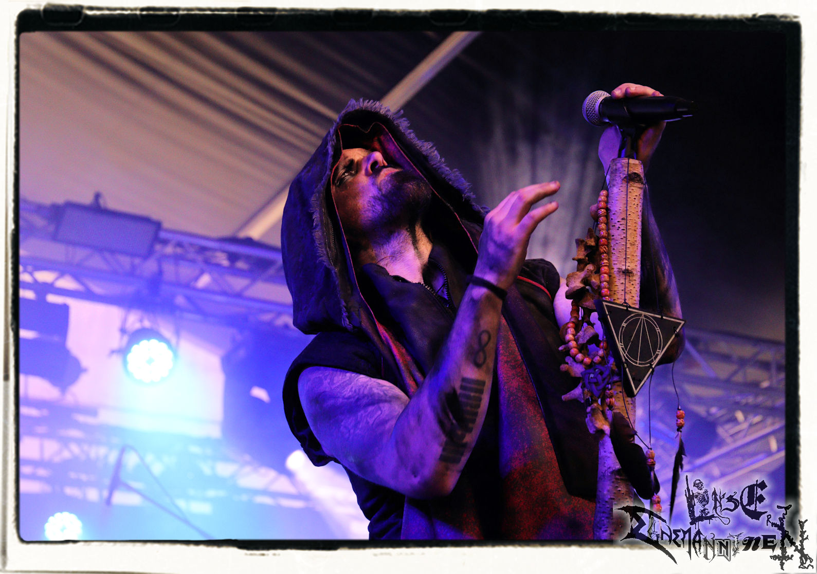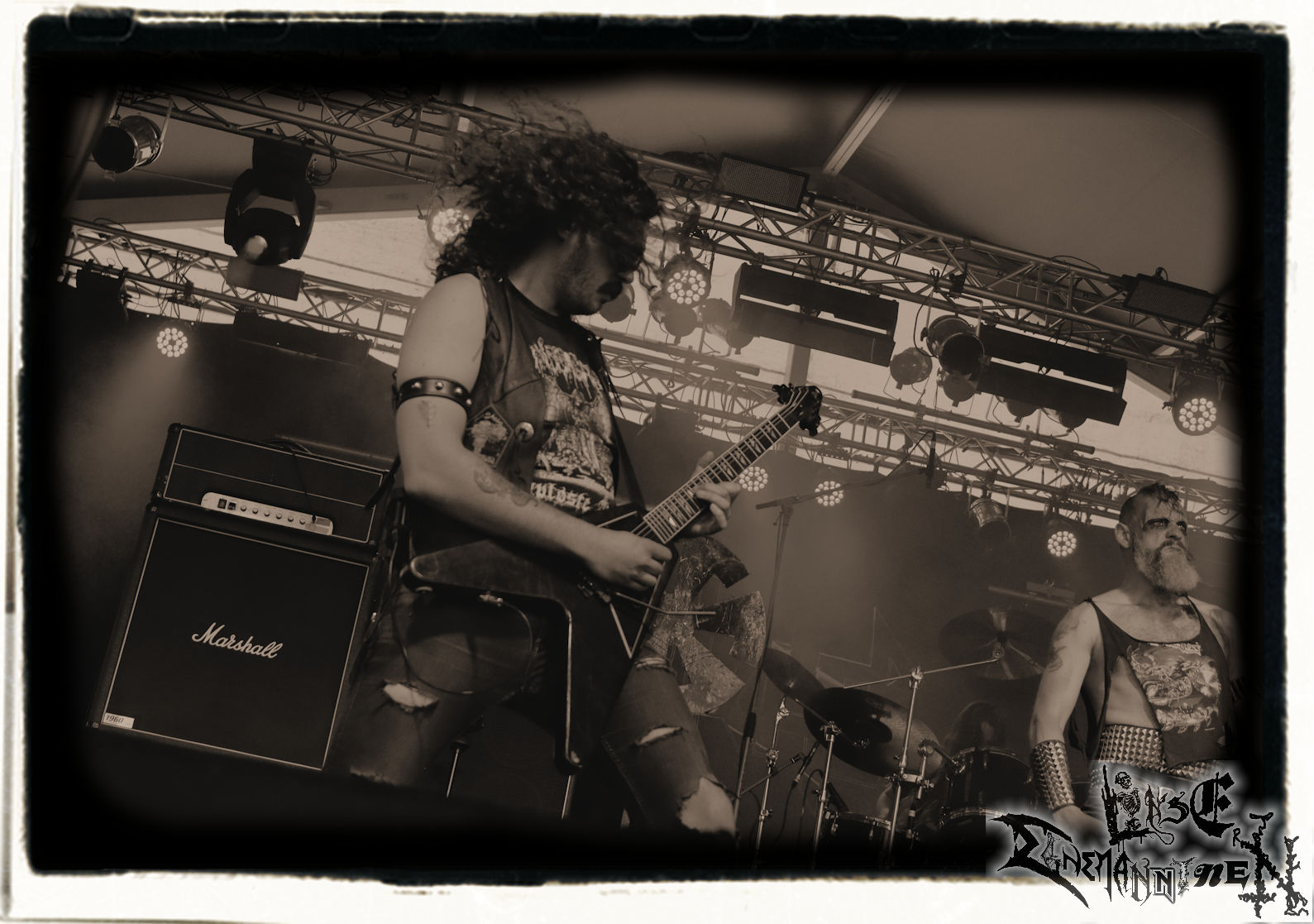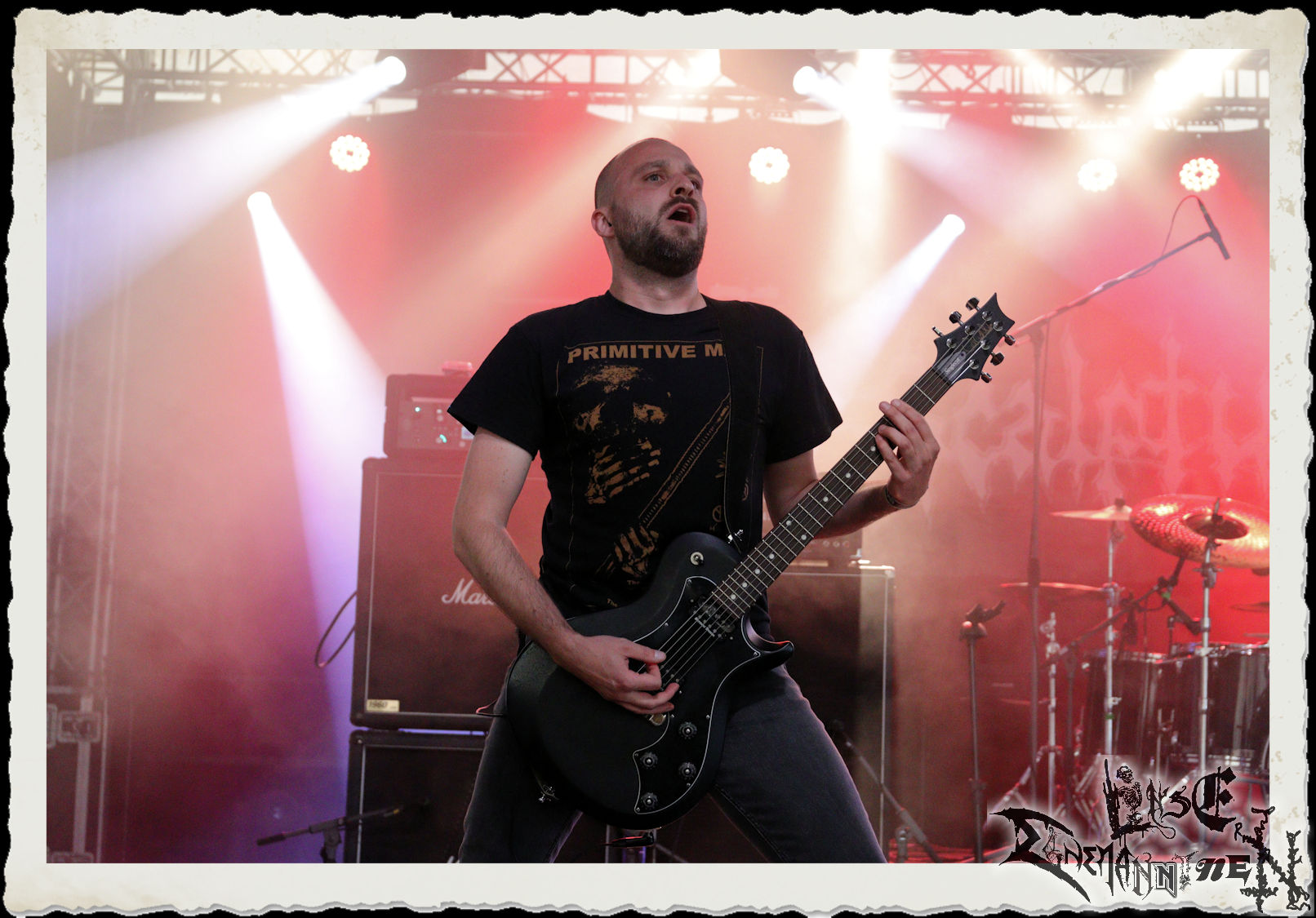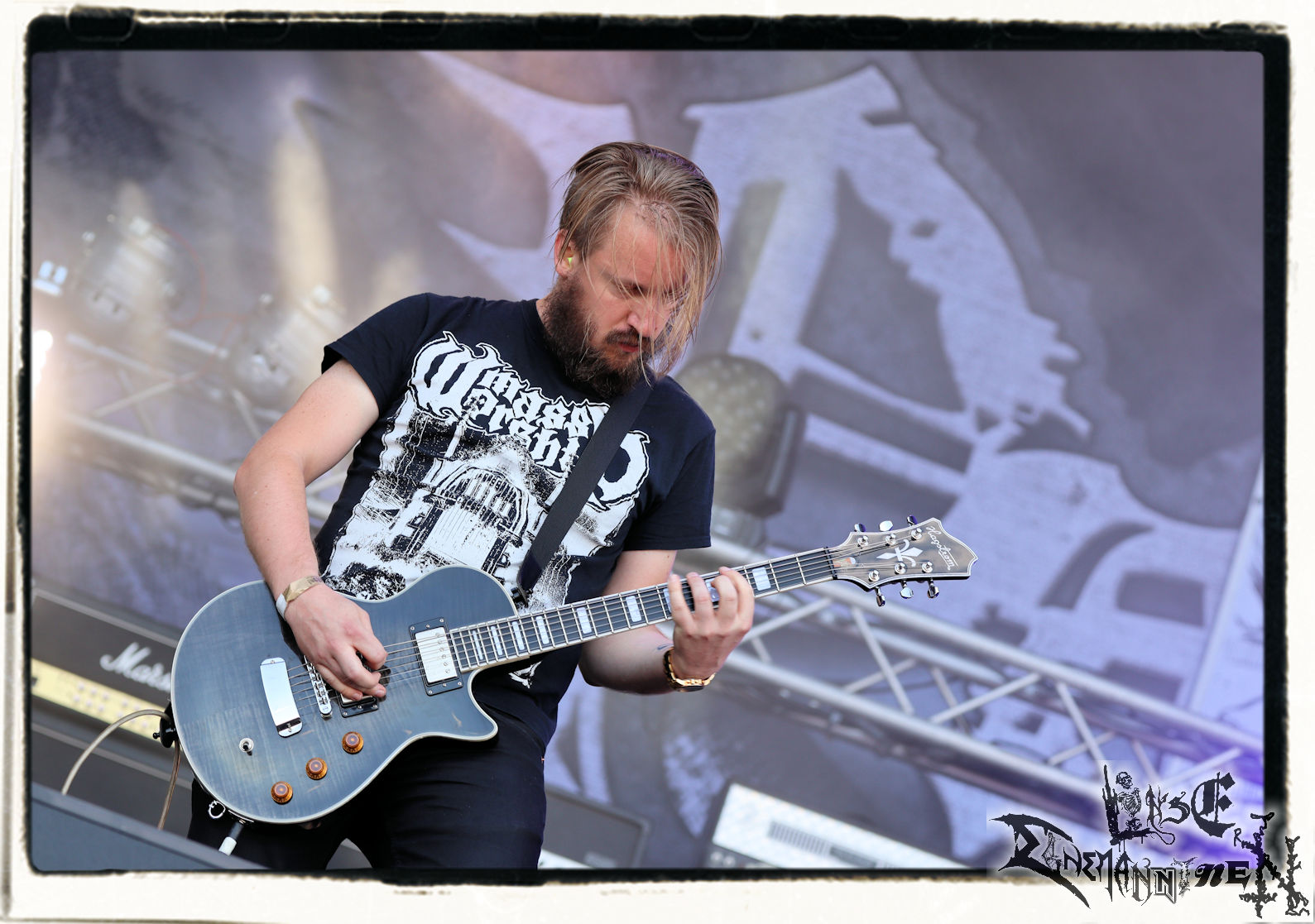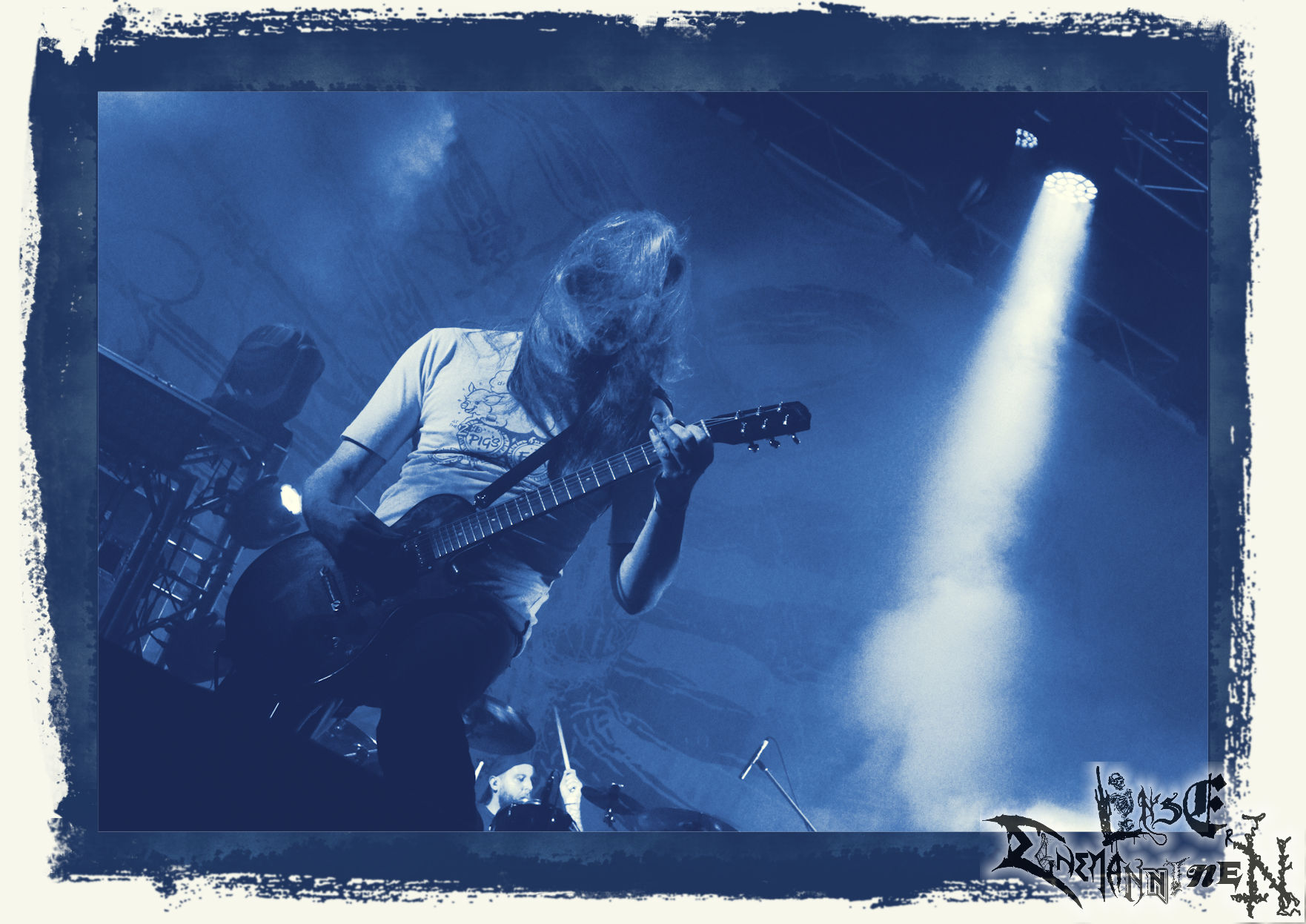 Mit EIS wird der Abend eingeläutet. Die Band aus dem Lupus Lounge – Stall ist wie geschaffen für das Zelt auf dem PARTY.SAN METAL OPEN AIR und beweist eindrucksvoll, wie man Atmosphäre mit mitreißenden Black Metal – Songs kombiniert. Bandkopf Alboin ist gleichzeitig Fan und Vollblutmusiker, der mit den Schwarzmetall-Größen der Neunziger aufgewachsen ist, wobei seine Musik sowohl von diesen, als auch von seiner Bewunderung gegenüber prägenden heimischen Acts wie Helrunar oder auch dem Wirken von Schwadorf mit Sun Of The Sleepless beeinflusst ist. Auch macht er keinen Hehl daraus, dass ihm die Einladung nach Schlotheim mit seiner Band als "Spätberufenem" sehr viel bedeutet. Und diese Haltung schwingt in diesem Konzert mit. Egal, ob Songs vom 2005er-Album "Galeere" ("Durch lichtlose Tiefen", seinerzeit noch unter dem Bandvorgänger Geist veröffentlicht (aus namensrechtlichen Gründen musste man sich danach in Eis umbenennen), vom bisher jüngsten Album "Bannstein" oder vom Klassiker "Wetterkreuz" (2012), der heuer auch schon zehn Jahre auf dem Buckel hat, gespielt werden. Eis zünden ein kleines Highlight, das mir noch lange in Erinnerung bleiben und mich animiert, mir die Scheiben mal wieder zu Gemüte zu führen. Danke!(JD)