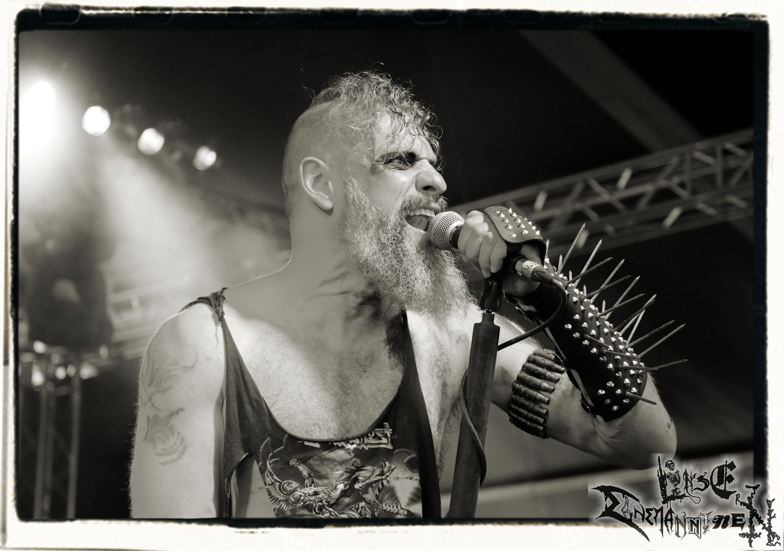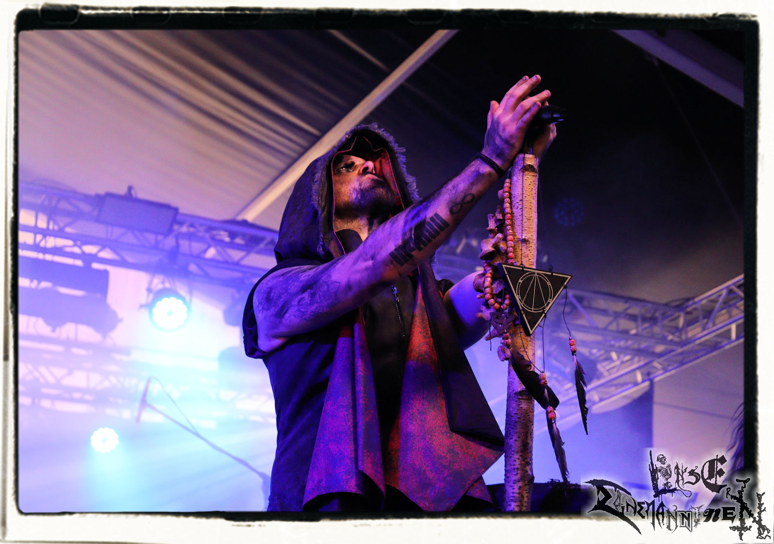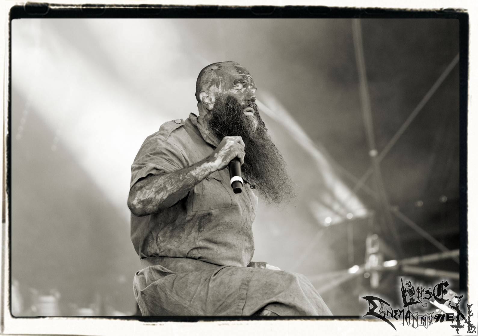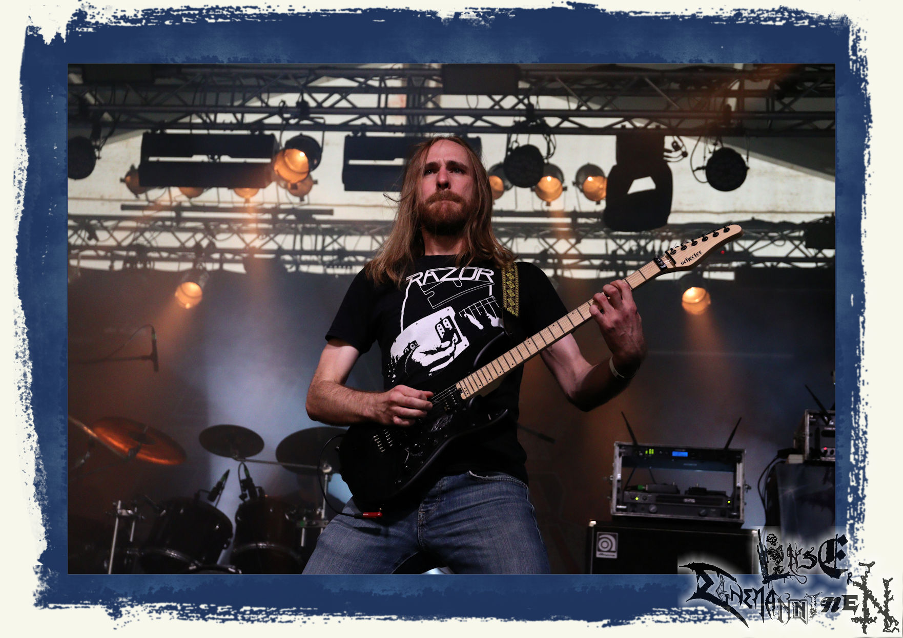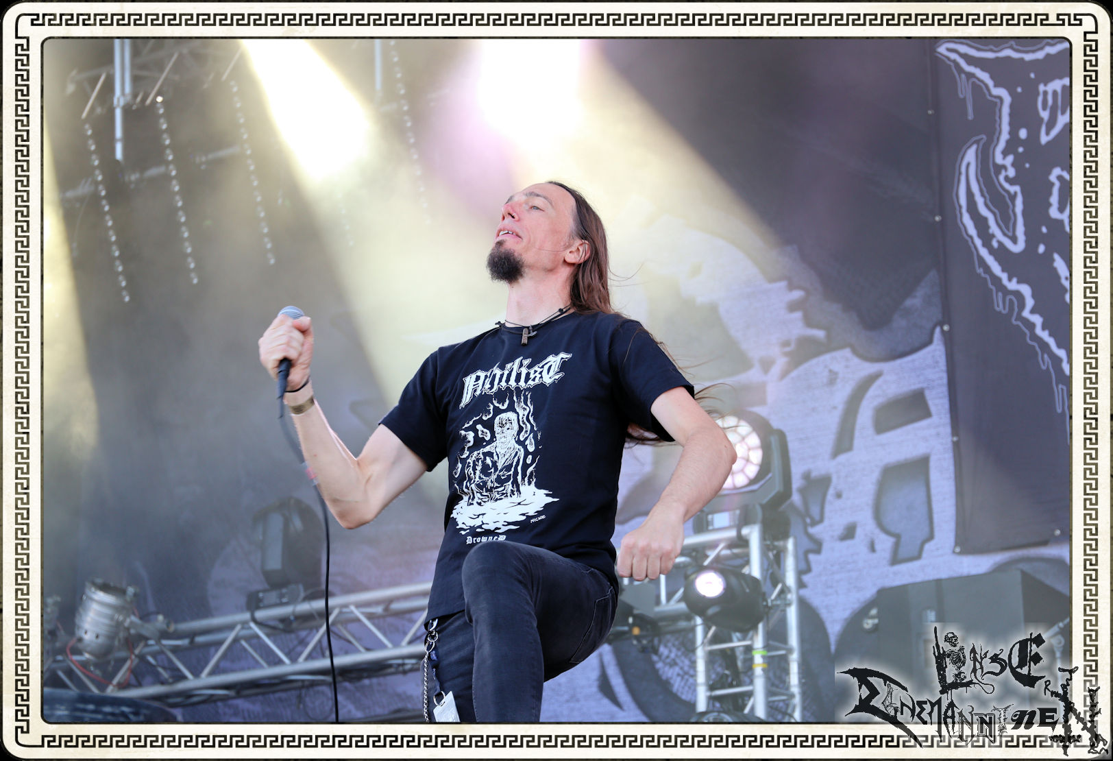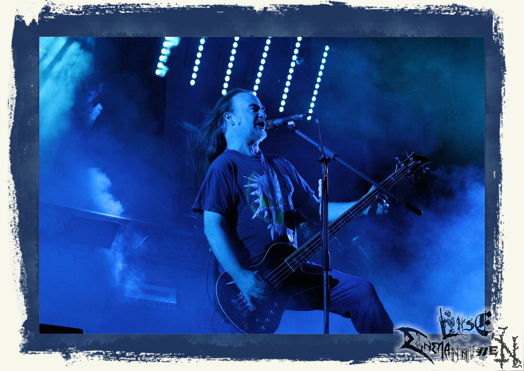 Mit EIS wird der Abend eingeläutet. Die Band aus dem Lupus Lounge – Stall ist wie geschaffen für das Zelt auf dem PARTY.SAN METAL OPEN AIR und beweist eindrucksvoll, wie man Atmosphäre mit mitreißenden Black Metal – Songs kombiniert. Bandkopf Alboin ist gleichzeitig Fan und Vollblutmusiker, der mit den Schwarzmetall-Größen der Neunziger aufgewachsen ist, wobei seine Musik sowohl von diesen, als auch von seiner Bewunderung gegenüber prägenden heimischen Acts wie Helrunar oder auch dem Wirken von Schwadorf mit Sun Of The Sleepless beeinflusst ist. Auch macht er keinen Hehl daraus, dass ihm die Einladung nach Schlotheim mit seiner Band als "Spätberufenem" sehr viel bedeutet. Und diese Haltung schwingt in diesem Konzert mit. Egal, ob Songs vom 2005er-Album "Galeere" ("Durch lichtlose Tiefen", seinerzeit noch unter dem Bandvorgänger Geist veröffentlicht (aus namensrechtlichen Gründen musste man sich danach in Eis umbenennen), vom bisher jüngsten Album "Bannstein" oder vom Klassiker "Wetterkreuz" (2012), der heuer auch schon zehn Jahre auf dem Buckel hat, gespielt werden. Eis zünden ein kleines Highlight, das mir noch lange in Erinnerung bleiben und mich animiert, mir die Scheiben mal wieder zu Gemüte zu führen. Danke!(JD)