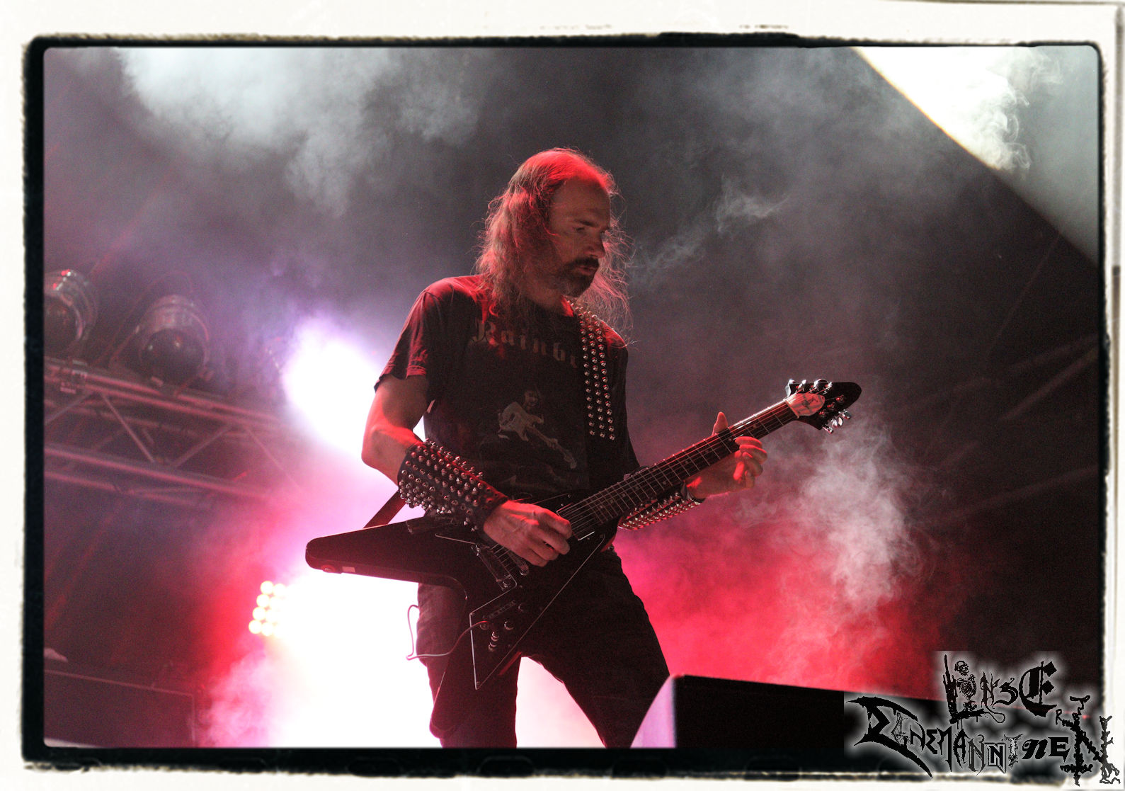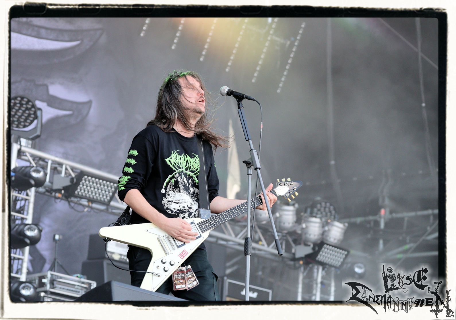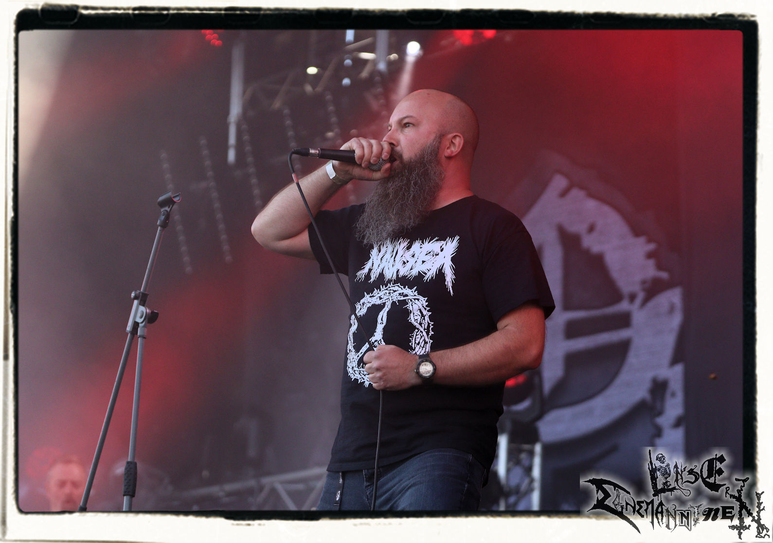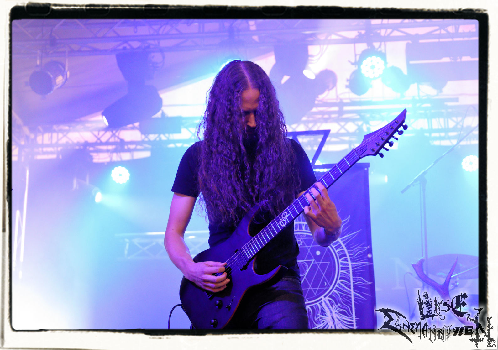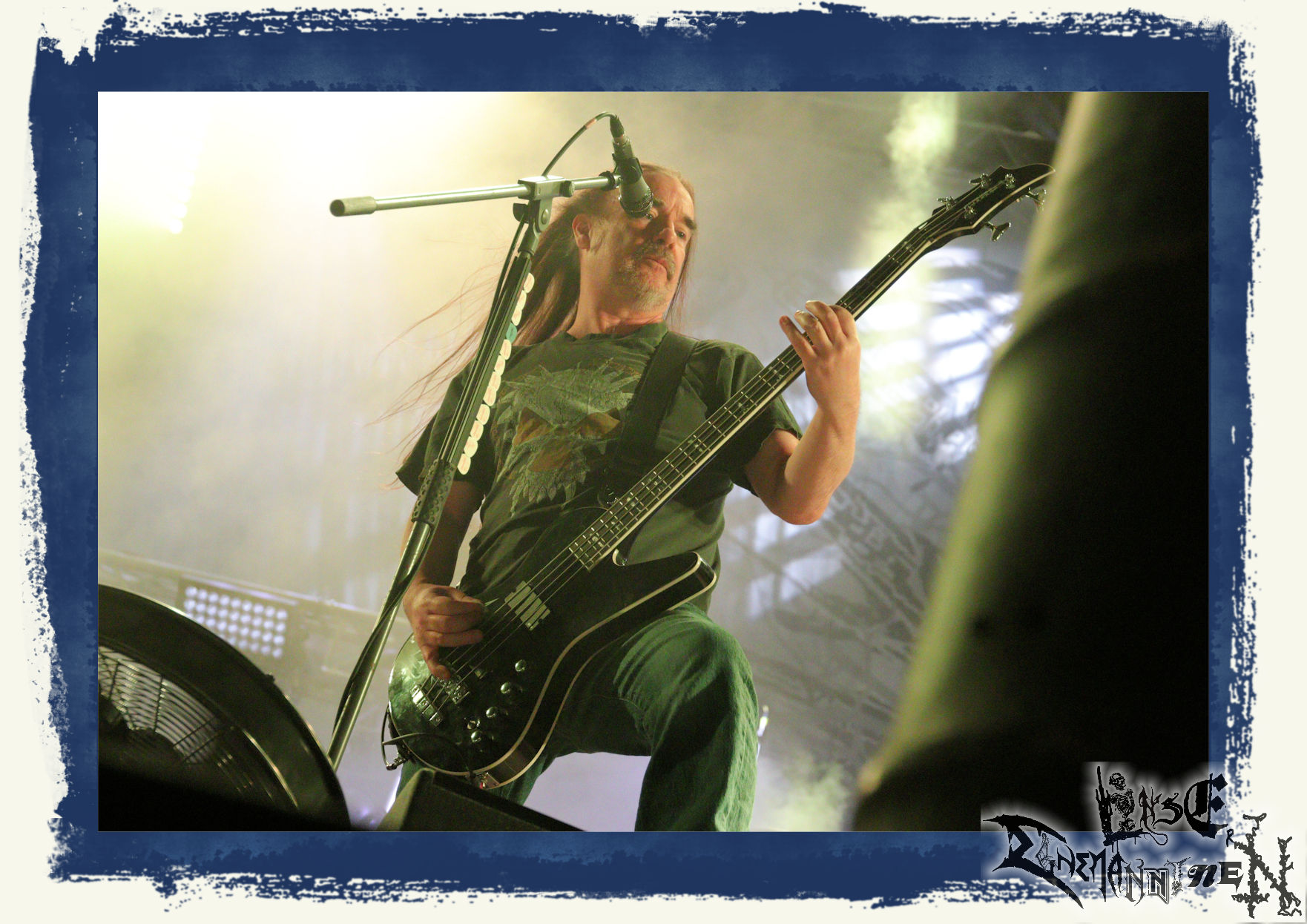 Mit EIS wird der Abend eingeläutet. Die Band aus dem Lupus Lounge – Stall ist wie geschaffen für das Zelt auf dem PARTY.SAN METAL OPEN AIR und beweist eindrucksvoll, wie man Atmosphäre mit mitreißenden Black Metal – Songs kombiniert. Bandkopf Alboin ist gleichzeitig Fan und Vollblutmusiker, der mit den Schwarzmetall-Größen der Neunziger aufgewachsen ist, wobei seine Musik sowohl von diesen, als auch von seiner Bewunderung gegenüber prägenden heimischen Acts wie Helrunar oder auch dem Wirken von Schwadorf mit Sun Of The Sleepless beeinflusst ist. Auch macht er keinen Hehl daraus, dass ihm die Einladung nach Schlotheim mit seiner Band als "Spätberufenem" sehr viel bedeutet. Und diese Haltung schwingt in diesem Konzert mit. Egal, ob Songs vom 2005er-Album "Galeere" ("Durch lichtlose Tiefen", seinerzeit noch unter dem Bandvorgänger Geist veröffentlicht (aus namensrechtlichen Gründen musste man sich danach in Eis umbenennen), vom bisher jüngsten Album "Bannstein" oder vom Klassiker "Wetterkreuz" (2012), der heuer auch schon zehn Jahre auf dem Buckel hat, gespielt werden. Eis zünden ein kleines Highlight, das mir noch lange in Erinnerung bleiben und mich animiert, mir die Scheiben mal wieder zu Gemüte zu führen. Danke!(JD)