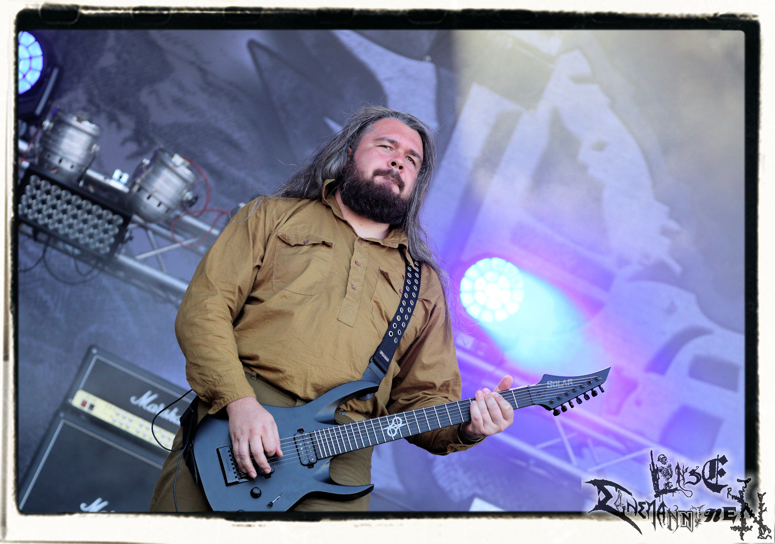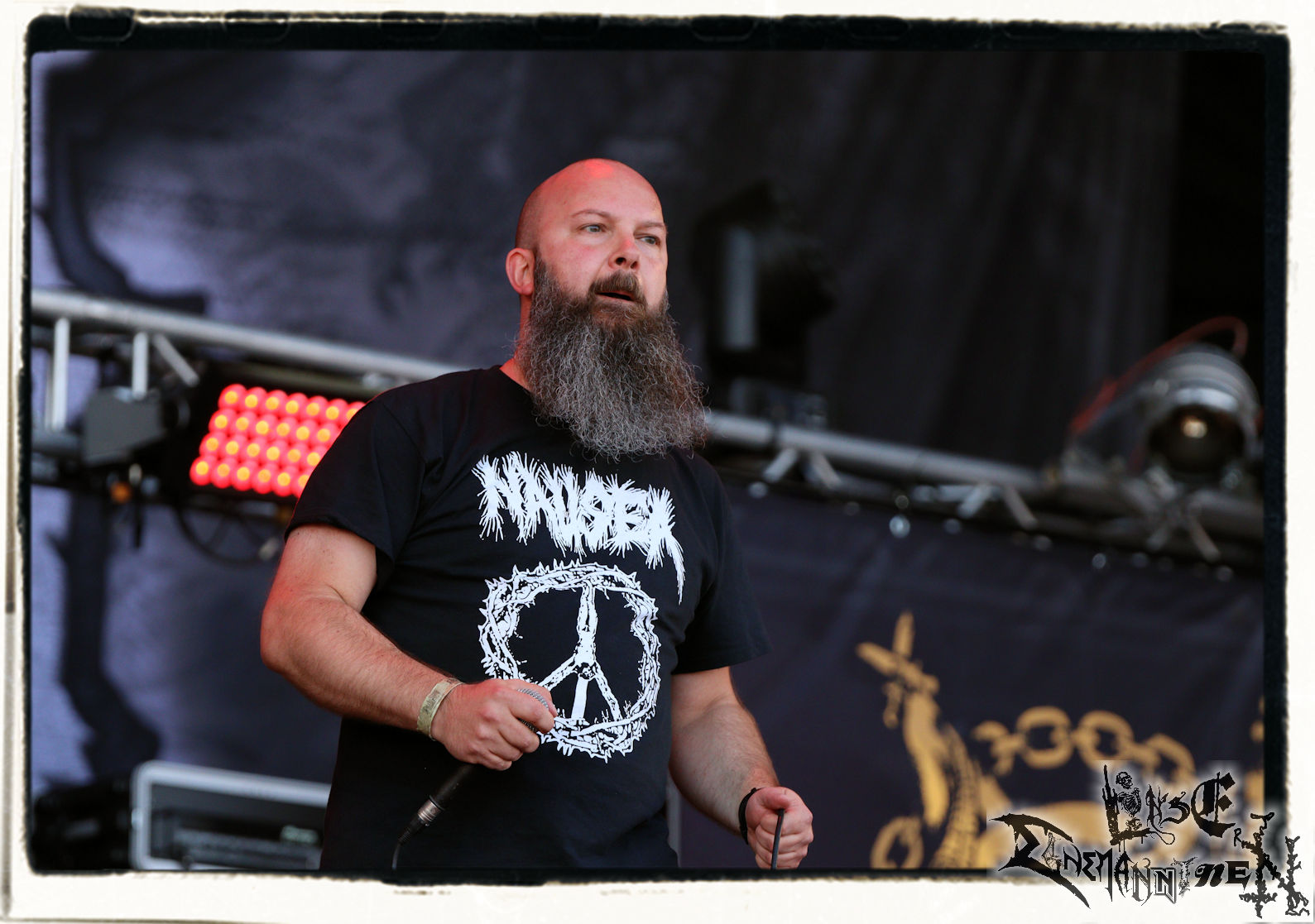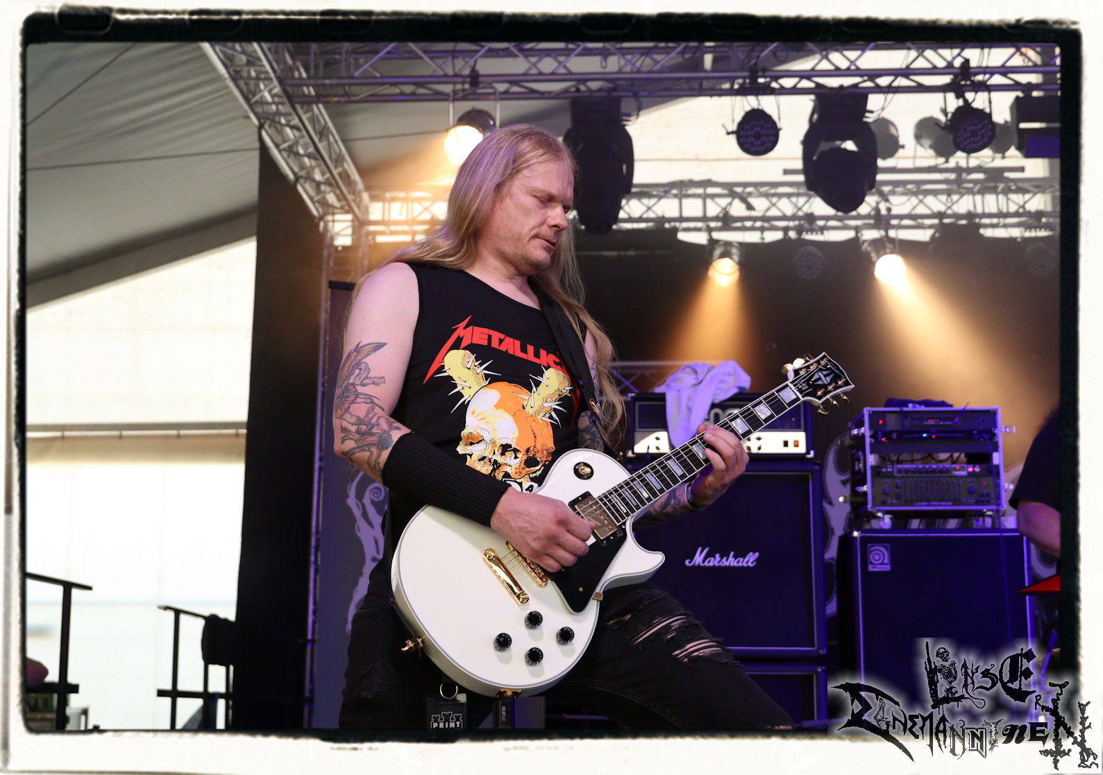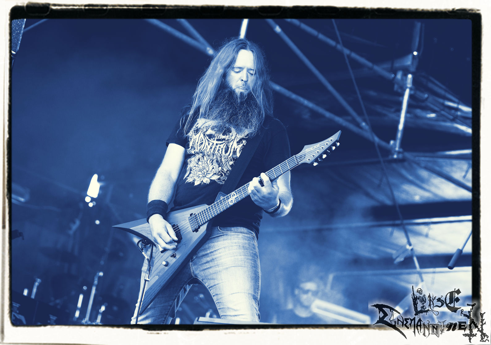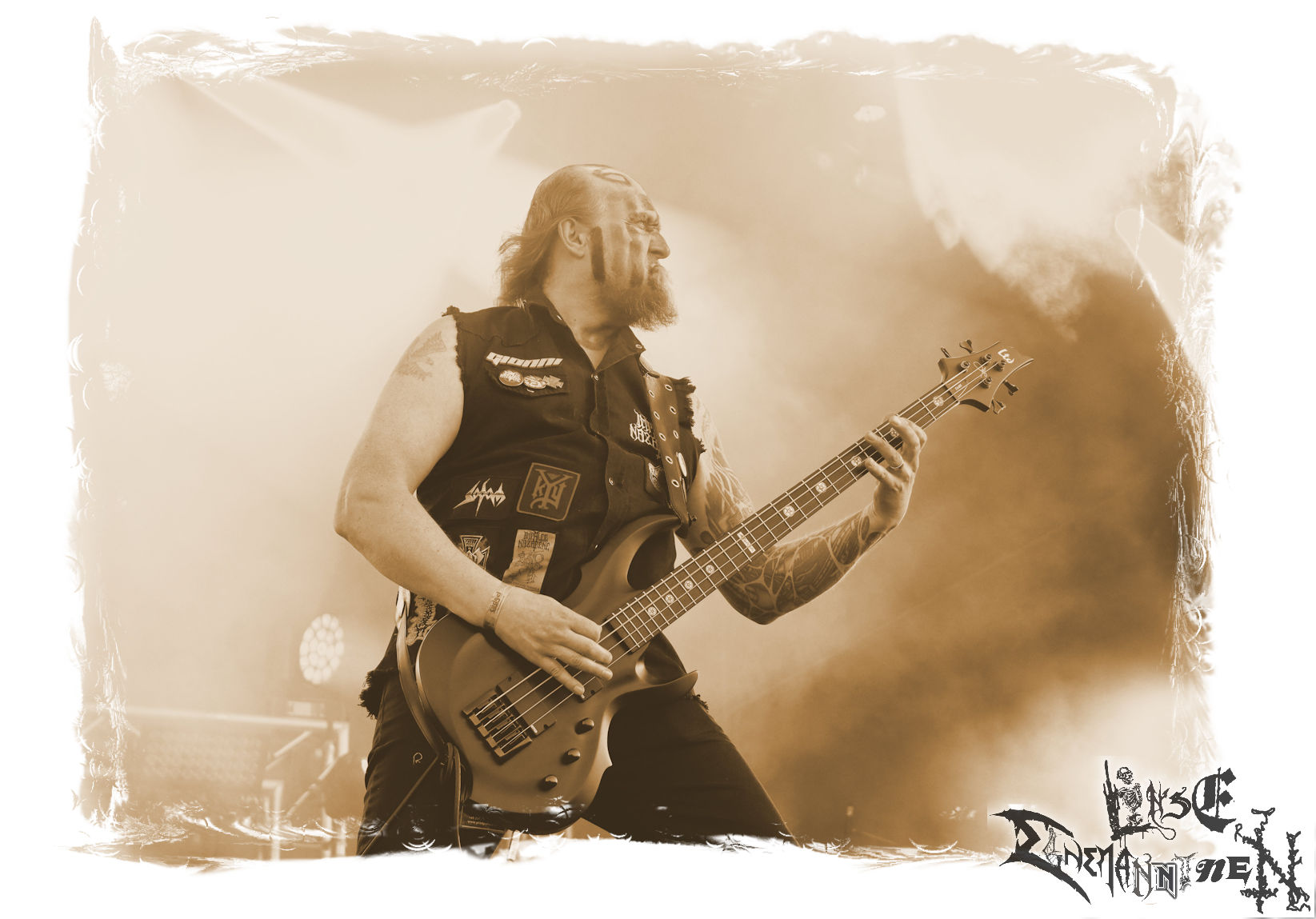 Mit EIS wird der Abend eingeläutet. Die Band aus dem Lupus Lounge – Stall ist wie geschaffen für das Zelt auf dem PARTY.SAN METAL OPEN AIR und beweist eindrucksvoll, wie man Atmosphäre mit mitreißenden Black Metal – Songs kombiniert. Bandkopf Alboin ist gleichzeitig Fan und Vollblutmusiker, der mit den Schwarzmetall-Größen der Neunziger aufgewachsen ist, wobei seine Musik sowohl von diesen, als auch von seiner Bewunderung gegenüber prägenden heimischen Acts wie Helrunar oder auch dem Wirken von Schwadorf mit Sun Of The Sleepless beeinflusst ist. Auch macht er keinen Hehl daraus, dass ihm die Einladung nach Schlotheim mit seiner Band als "Spätberufenem" sehr viel bedeutet. Und diese Haltung schwingt in diesem Konzert mit. Egal, ob Songs vom 2005er-Album "Galeere" ("Durch lichtlose Tiefen", seinerzeit noch unter dem Bandvorgänger Geist veröffentlicht (aus namensrechtlichen Gründen musste man sich danach in Eis umbenennen), vom bisher jüngsten Album "Bannstein" oder vom Klassiker "Wetterkreuz" (2012), der heuer auch schon zehn Jahre auf dem Buckel hat, gespielt werden. Eis zünden ein kleines Highlight, das mir noch lange in Erinnerung bleiben und mich animiert, mir die Scheiben mal wieder zu Gemüte zu führen. Danke!(JD)