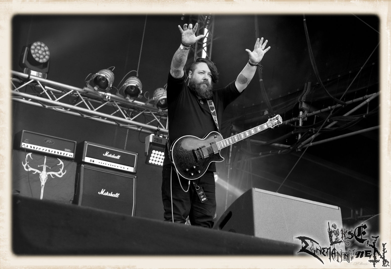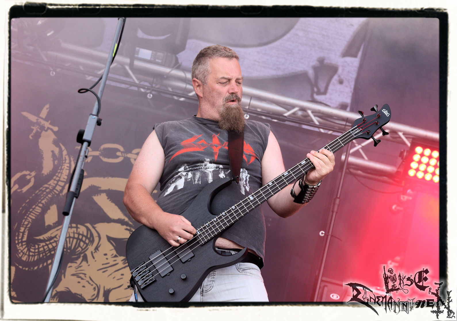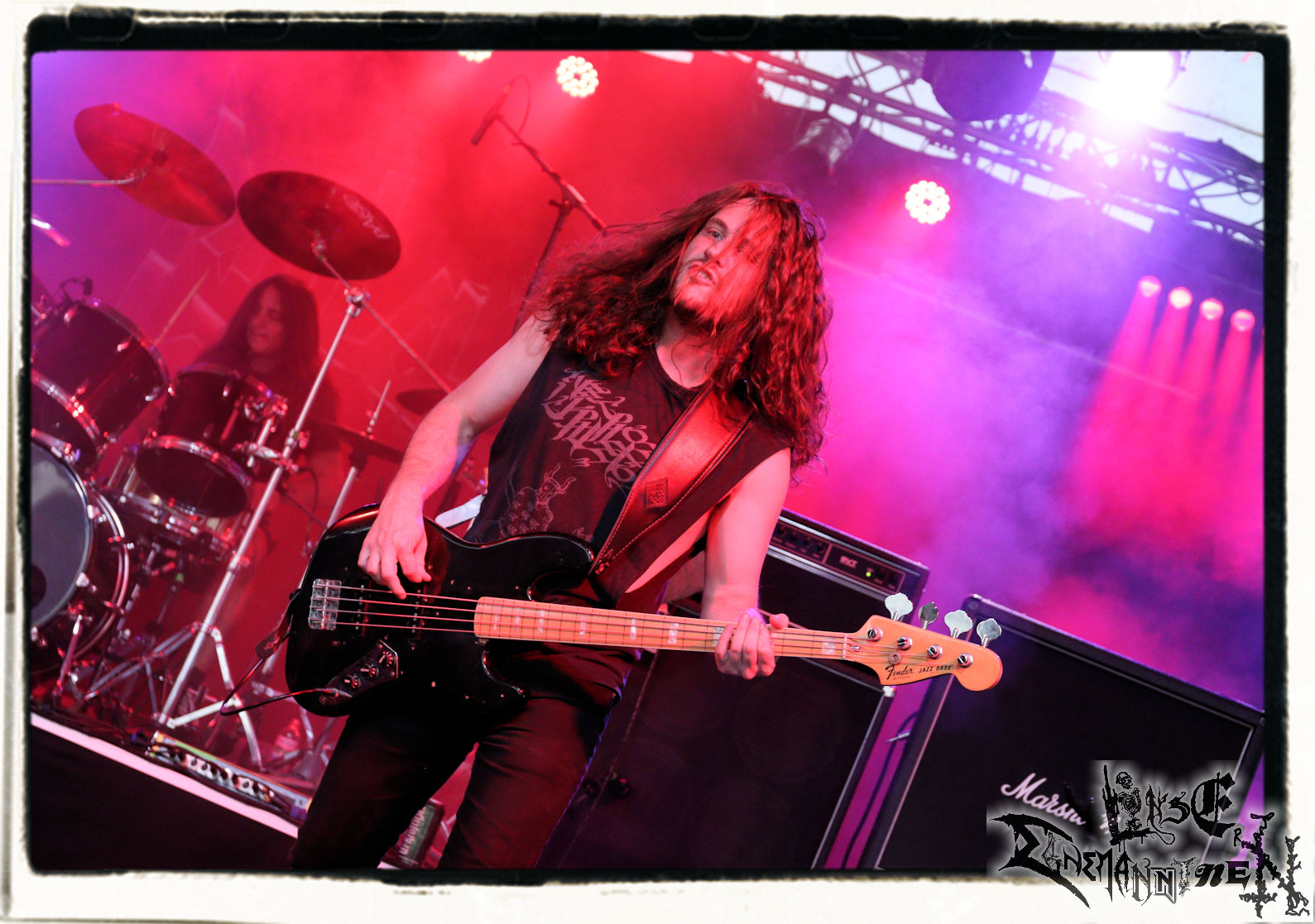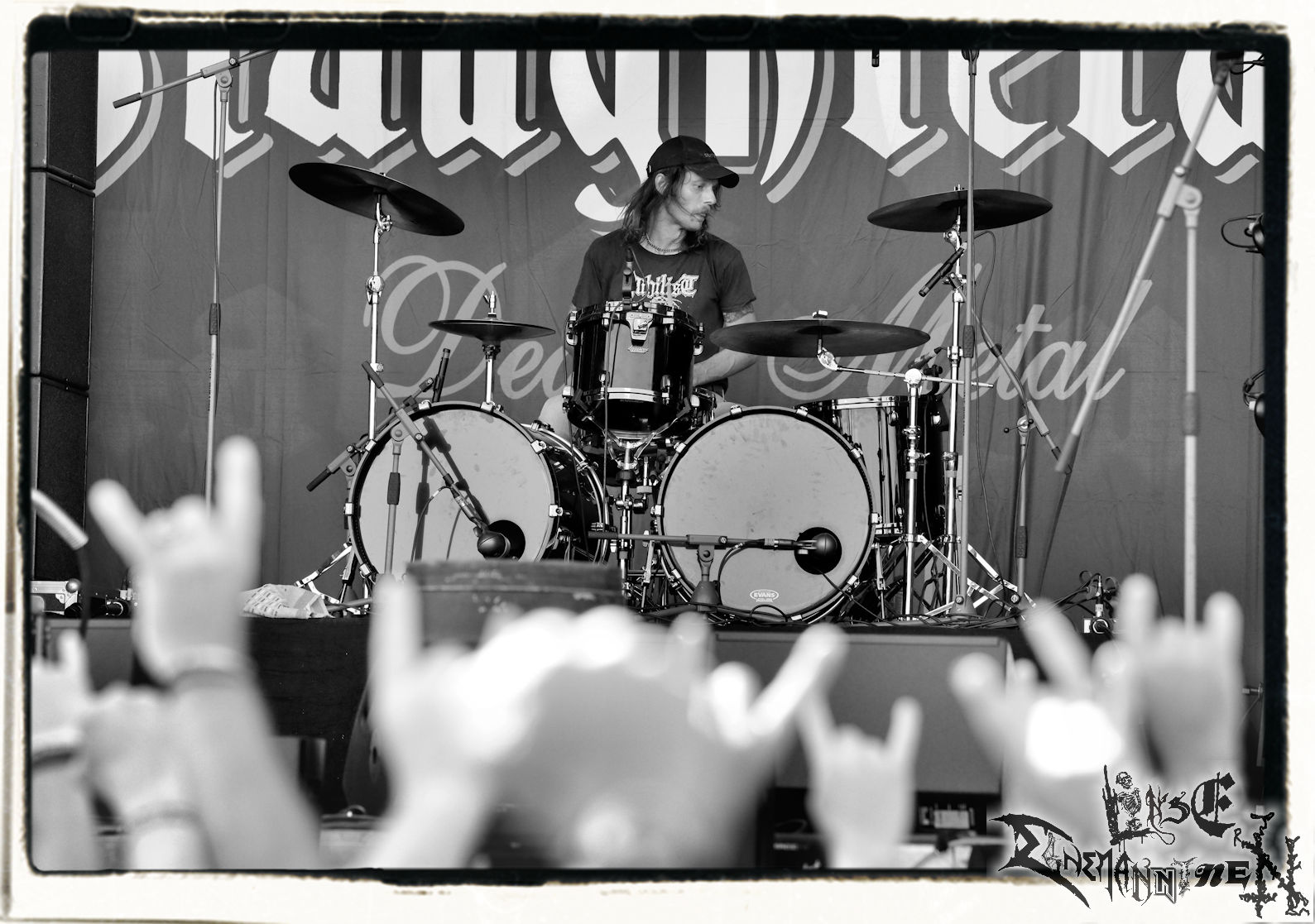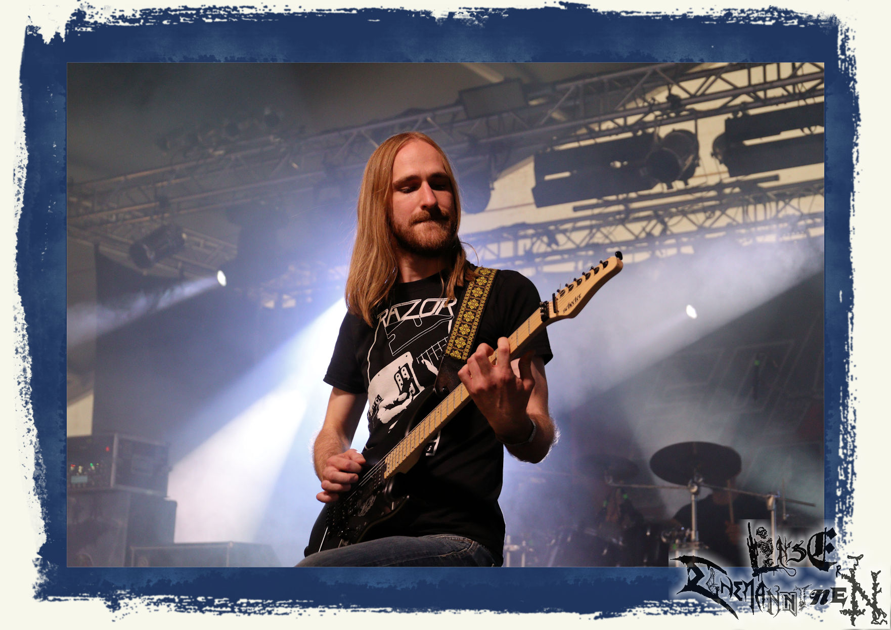 Mit EIS wird der Abend eingeläutet. Die Band aus dem Lupus Lounge – Stall ist wie geschaffen für das Zelt auf dem PARTY.SAN METAL OPEN AIR und beweist eindrucksvoll, wie man Atmosphäre mit mitreißenden Black Metal – Songs kombiniert. Bandkopf Alboin ist gleichzeitig Fan und Vollblutmusiker, der mit den Schwarzmetall-Größen der Neunziger aufgewachsen ist, wobei seine Musik sowohl von diesen, als auch von seiner Bewunderung gegenüber prägenden heimischen Acts wie Helrunar oder auch dem Wirken von Schwadorf mit Sun Of The Sleepless beeinflusst ist. Auch macht er keinen Hehl daraus, dass ihm die Einladung nach Schlotheim mit seiner Band als "Spätberufenem" sehr viel bedeutet. Und diese Haltung schwingt in diesem Konzert mit. Egal, ob Songs vom 2005er-Album "Galeere" ("Durch lichtlose Tiefen", seinerzeit noch unter dem Bandvorgänger Geist veröffentlicht (aus namensrechtlichen Gründen musste man sich danach in Eis umbenennen), vom bisher jüngsten Album "Bannstein" oder vom Klassiker "Wetterkreuz" (2012), der heuer auch schon zehn Jahre auf dem Buckel hat, gespielt werden. Eis zünden ein kleines Highlight, das mir noch lange in Erinnerung bleiben und mich animiert, mir die Scheiben mal wieder zu Gemüte zu führen. Danke!(JD)