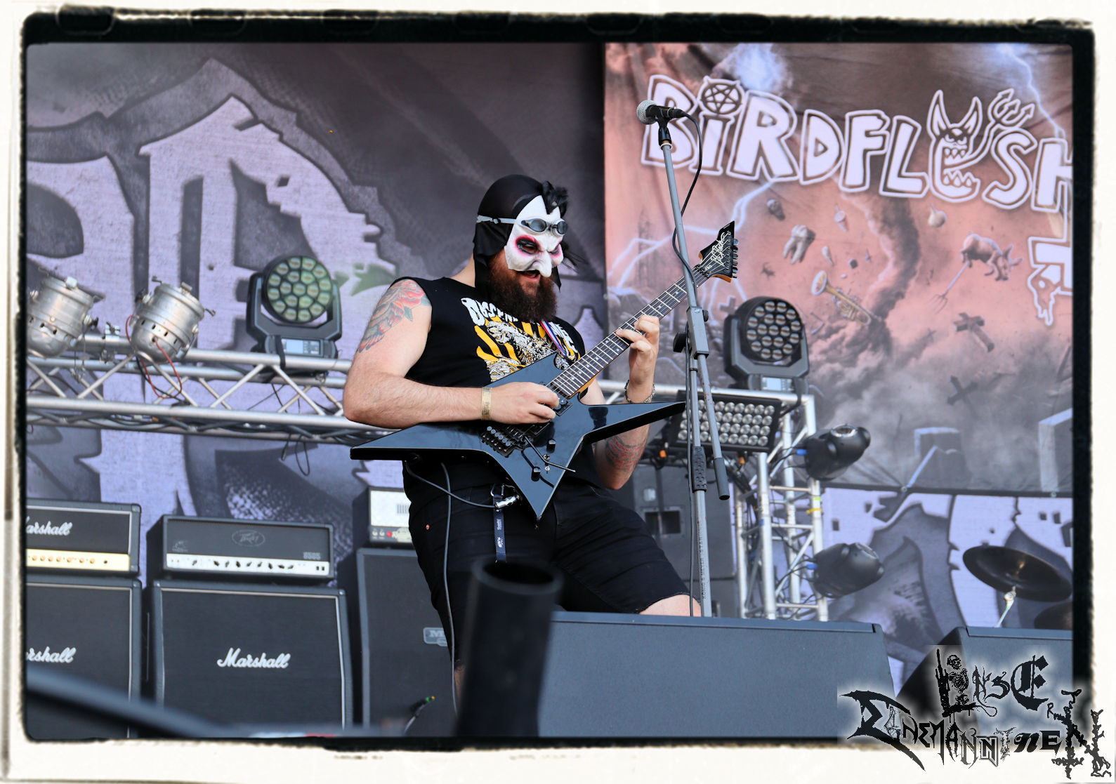Es ist immer noch unwirklich, als die Mittagskanone den ersten Salutschuss abfeuert, die PARTY.SAN-Gemeinde auf´s Infield gebeten wird und es fühlt sich genauso komisch an, als es nach drei Jahren endlich wieder einen Grindcore-Auftakt nach Maß gibt: Wer würde da besser passen als ein schwedisches Urgestein wie BIRDFLESH. Die Diskografie und die zahlreichen Neben- und Hauptaktivitäten des Trios füllen Bände, wobei die Musik der maskierten Pügelknaben sowohl Druck, als auch Spaß macht. Auf der Bühne regieren Blut, Schweiß, Eiter, Tränen und derber Humor. Vor der Bühne herrscht kollektive Glückseeligkeit. It´s great to be back home!!!