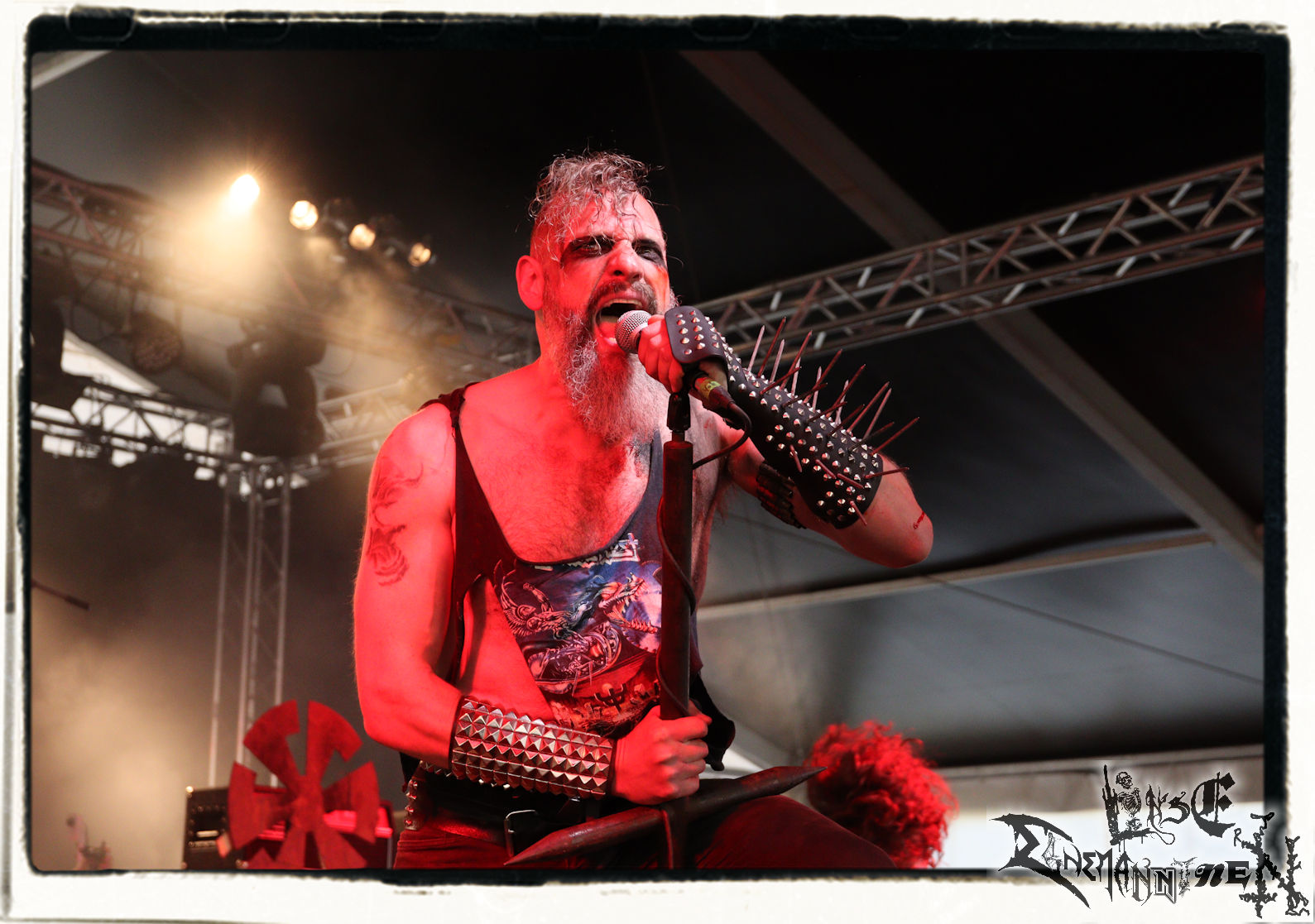Viele härtere Bands im Metal driften ja in Richtung Mainstream, gut das es da noch kontroverse Bands wie IMPALED NAZARENE gibt, die allem und jedem den Mittelfinger zeigen und gut dass die Veranstalter die Finnen recht hoch auf das Billing setzen. Fronter Mika Luttinen scheint auch seiner Gesundheit den Mittelfinger zu zeigen und so wirkt er doch etwas durch den Lebenswandel gezeichnet. Da war Ende der 90er wesentlich mehr an aggressivem Stageacting. Den Gesang bekommt er aber immer noch auf die Kette. Mit K. Tormentor hat Mika einen wirklichen "Suomi-Ringer" an der Gitarre rekrutiert. Die Band ackert sich tight durch das Set. Das repräsentiert das gesamte Spektrum der Band vom Debüt bis zum Titeltrack des aktuellen Longplayers. Natürlich darf ´Total War - Winter War´ vom 1994er Hitalbum ´Suomi Finland Perkele´ nicht fehlen. Außenstehenden wird sich wohl nie erschließen, warum der Moshpit bei den vorgetragenen Hassbrocken aus fröhlich grinsenden Menschen besteht. Die Finnen sind für mich die Motörhead des Black Metal und überzeugen mich einmal mehr mit diesem Gig. (Trille)