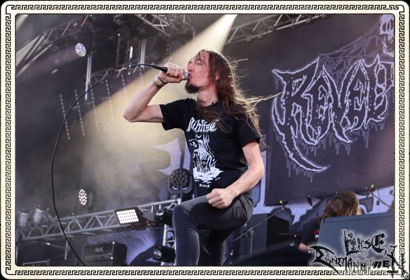 FLESHCRAWL werden oft nicht genug gewürdigt, wenn es um die Entstehung des deutschen Death Metals geht. Mit den Vorläufer-Bands reicht ihre Geschichte bis 1987 zurück. Durch Banner mit einem Foto des 2021 verstorbenen Sängers Sven(son) Gross und dem Spruch „Gone but never forgotten“ erinnern die Jungs an den ehemaligen Shouter. Der Gig verzichtet aber völlig auf Sentimentalitäten, was sicherlich im Sinne von Sven ist. Erstmals sehe ich die Band mit „Jungspund“ Borisz Sarafutgyinov, der sich als würdiger Nachfolger am Mikro erweißt. FLESHCRAWL feuern ihren Todesmetall schwedischer Bauart mit Spielfreude und fettem Sound in die Menge und ernten verdientermaßen gute Reaktionen vom Publikum. Mach´s gut, Svensson! (Trille)