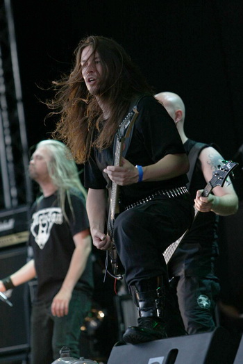 Nachdem die Sonne das Gelände in den letzten Stunden mehr als verwöhnt hat verspricht der Himmel gegen Mittag Abkühlung, die wir in diesem Jahr dankbar annehmen. Es tröpfelt, während sich IRATE ARCHITECT anschicken, den Freitag zu eröffnen. Die Jungs überraschten mich auf ihrem Debut "Visitors" durch eine komplexe Mischung aus Death Metal und Grindcore, die trotz aller technischer Finessen mit nachvollziehbaren Songstrukturen daher kommt. Auch auf der Bühne brauchen Irate Architect nicht hinter ihren musikalischen Paten Dying Fetus oder Misery Index zu verstecken. Die Hamburger holen auch den letzten Langschläfer mit ihrem brutalen Sound aus dem Zelt und sorgen damit für den "Hallo-Wach-Effekt". Selbst der Regen verzieht sich zwischenzeitlich.(JD) Hier braucht man nicht allzuviele Worte verlieren, diese deutschen Death-Metaller DEFLORATION rollen alles nieder. Die Grooves sind niederschmetternd und alles ist im beständigen Wechsel zwischen Blast und Midtempo. Die Stimmung ist erste Sahne und an Publikum mangelt es während dieser Band auch nicht. Fazit: Hammer! (DS) TYRANT aus Schweden machen mit ihrem rohen Sound dem Black Metal nun wieder alle Ehre und bieten eine solide Vorstellung ohne wirklich zu glänzen. Ein Achtungserfolg, welcher in punkto Eigenständigkeit im musikalischen Sinne in Zukunft ruhig noch untermauert werden darf. (CP) Er ist zurück gekehrt. Nachdem Martin van Drunen im letzten Jahr mit Asphyx ein grandioses Comeback feierte, steht der Ausnahmesänger heuer mit seiner neuen Kriegsmaschinerie
