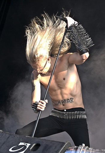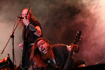 KAMPFAR hatte ich seit der Veröffentlichung von "Kvass" in nahezu unterirdischer Erinnerung. Mit diesem Gig rehabilitieren sich die Norweger und spielen ein solides Konzert, welches wie das ihrer Kollegen von Tyrant ohne große Höhepunkte auskommen muss. Allerdings kommt die Mischung aus klassischem rohen Black Metal und nordischer Folklore live gespielt weitaus intensiver als auf dem dem besagten, soundtechnisch etwas identitätslosen Album "Kvass".(CP) Den weiten Weg von den Faroer Inseln waren TYR gekommen um mit ihrem hymnischen Pagan Metal das Volk zu begeistern. Das gelang über weite Strecken auch sehr gut, lief aber irgendwie an mir vorbei. Zwar war das alles sehr ordentlich gespielt und auch die zweistimmigen Gesänge wurden gefällig vorgetragen, aber wirklich im Ohr blieb bei mir nur das abschließende "Hail To The Hammer".(ET) Mit der Verpflichtung von