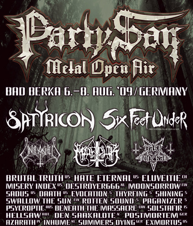 MARDUK, SATYRICON, SIX FEET UNDER, UNLEASHED, DARK FUNERAL, was für die jüngere PSOA-Generation eine absolut traumhafte Konstellation darstellt, kann für langjährig erprobte Party.Sanen trotz zahlreicher kleiner und vermeintlich unscheinbarer Schmankerl wie SÓLSTAFIR, BRUTAL TRUTH, BRUJERIA oder auch SHINING leider nicht darüber hinwegtäuschen, dass das Billing 2009 das unangefochten schwächste der letzten fünf Jahre darstellt. Nicht zuletzt Marduk und Six Feet Under beehrten das Publikum vor gerade einmal drei Jahren mit Headliner-Gigs. Für die Tatsache dass ausgerechnet, der bereits im letzten Jahr euphorisch angekündigte Headliner Satyricon im Verlauf des Jahres nicht nur in zahlreichen Clubs des Landes, sondern auch auf zahlreichen Festivals mehr als aktiv war und somit nur wenig Überraschendes bot, konnten die Macher des Party.Sans nichts.