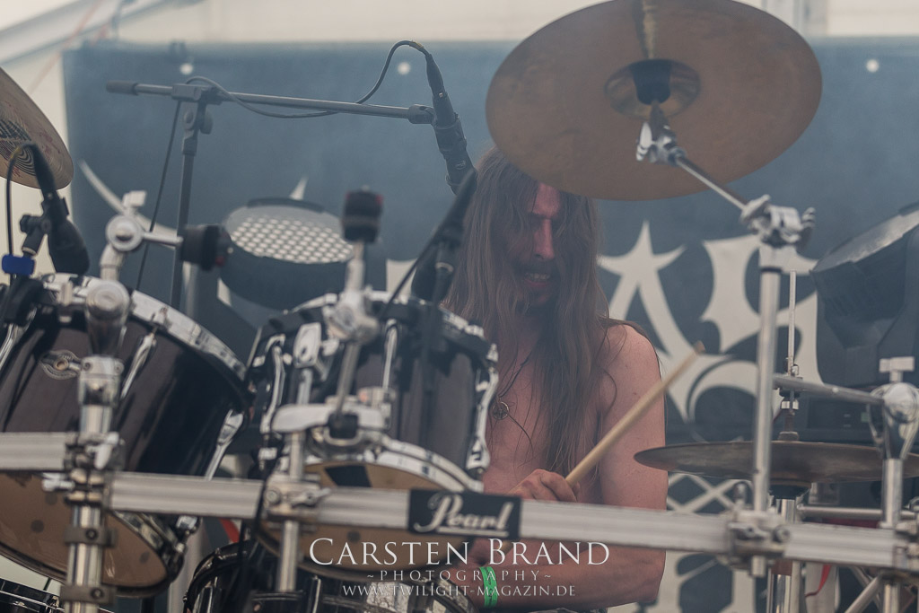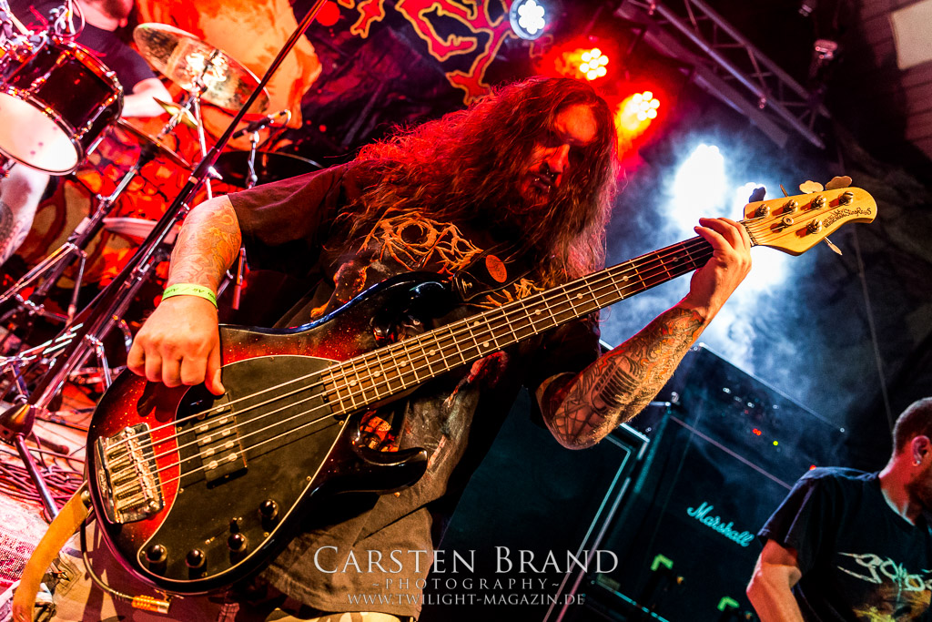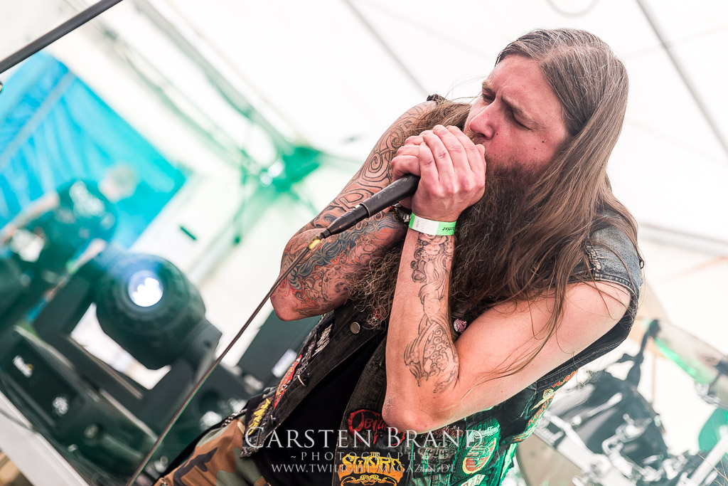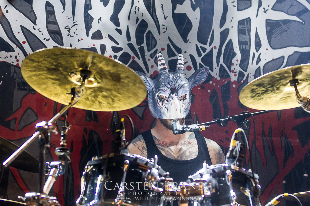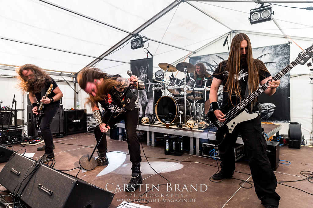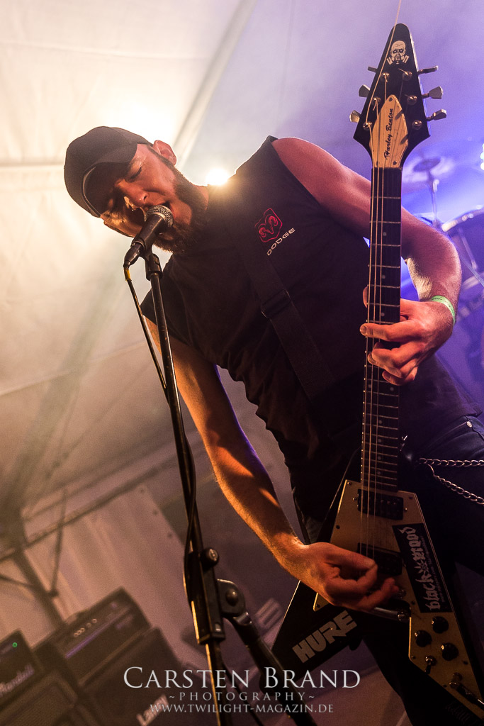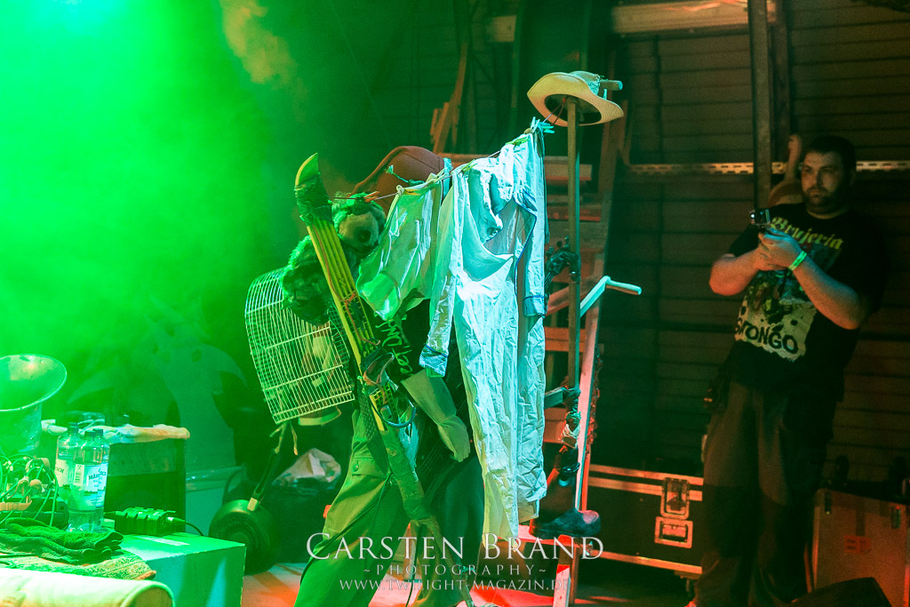 MILKING THE GOATMACHINE wissen da im Anschluss deutlich besser zu mobilisieren. Das Grindcore Trio mit den Ziegenmasken und der Vorliebe für Euro-Dance um den brüllenden Trommler Goatleeb Udder versteht sich durchaus auf brutalen, simplen aber abwechslungsreichen Death-Grind mit einer ordentlichen Prise Ironie, ohne dabei albern zu wirken. Auch wenn nicht wirklich meine musikalische Baustelle, so lasse ich mich am Ende doch gerne packen und mitreißen. Ganz starke Performance, die zeigt, wieso die Berliner schon seit geraumer Zeit in aller Munde sind. Wer sich übrigens in der Zwischenzeit fragt, wo denn die BEARDED BASTARDS und SUCCUBUS abgeblieben sind, welche gemeinsam mit Atomwinter das Zelt gerockt haben, dem sei gesagt, dass die Band- und Bühnenaufstockung durchaus Vorteile aber eben auch Nachteile hat, wenn es eben Schlag auf Schlag ohne Unterbrechung durchgeht. Und da das Zelebrieren des Wiedersehens und die Gespräche bei diversen Getränken mit vielen Freunden und Wegbegleitern im Rahmen der Protzen-Familie ein wesentlicher Bestandteil dieses Festivals ist, möge man mir es nachsehen, wenn ich diese beiden Bands unterschlage, um genussvoll durchzuschnaufen.