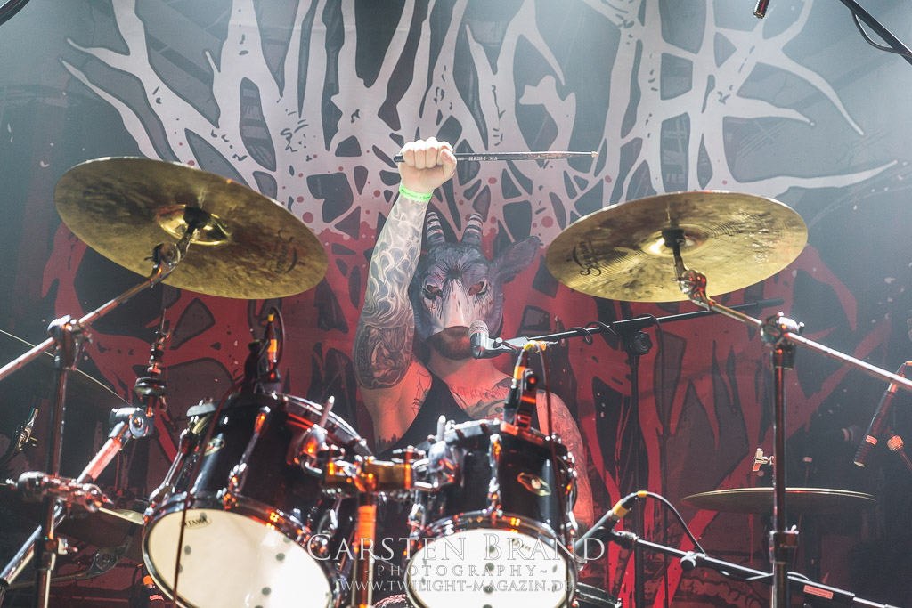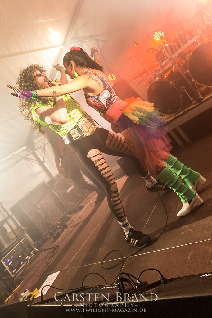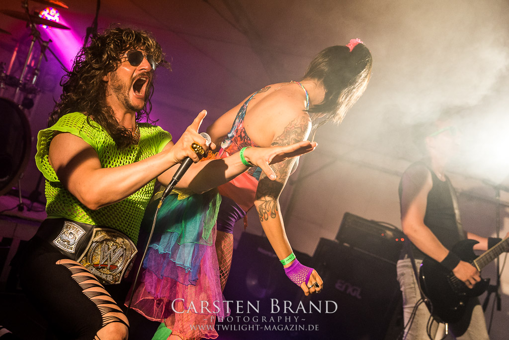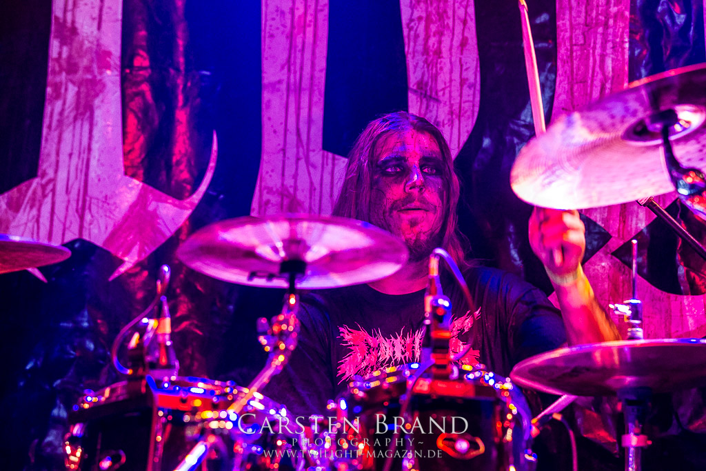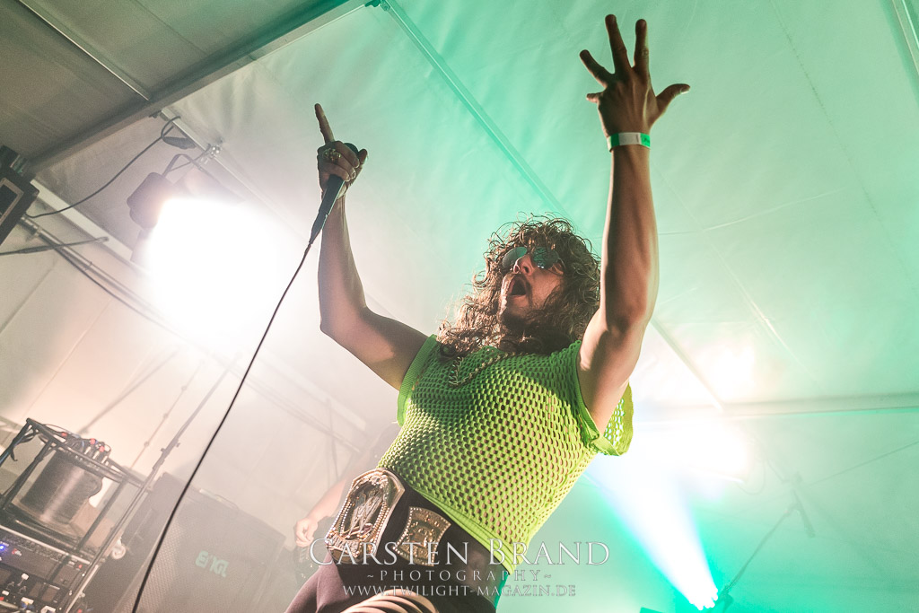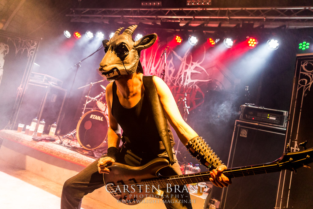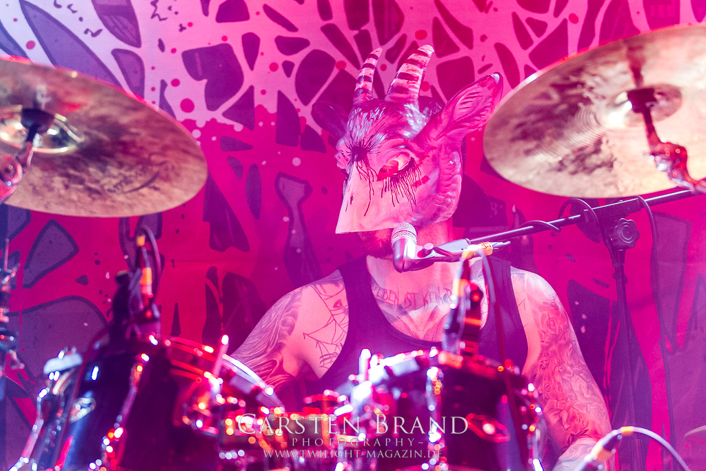 MILKING THE GOATMACHINE wissen da im Anschluss deutlich besser zu mobilisieren. Das Grindcore Trio mit den Ziegenmasken und der Vorliebe für Euro-Dance um den brüllenden Trommler Goatleeb Udder versteht sich durchaus auf brutalen, simplen aber abwechslungsreichen Death-Grind mit einer ordentlichen Prise Ironie, ohne dabei albern zu wirken. Auch wenn nicht wirklich meine musikalische Baustelle, so lasse ich mich am Ende doch gerne packen und mitreißen. Ganz starke Performance, die zeigt, wieso die Berliner schon seit geraumer Zeit in aller Munde sind. Wer sich übrigens in der Zwischenzeit fragt, wo denn die BEARDED BASTARDS und SUCCUBUS abgeblieben sind, welche gemeinsam mit Atomwinter das Zelt gerockt haben, dem sei gesagt, dass die Band- und Bühnenaufstockung durchaus Vorteile aber eben auch Nachteile hat, wenn es eben Schlag auf Schlag ohne Unterbrechung durchgeht. Und da das Zelebrieren des Wiedersehens und die Gespräche bei diversen Getränken mit vielen Freunden und Wegbegleitern im Rahmen der Protzen-Familie ein wesentlicher Bestandteil dieses Festivals ist, möge man mir es nachsehen, wenn ich diese beiden Bands unterschlage, um genussvoll durchzuschnaufen.