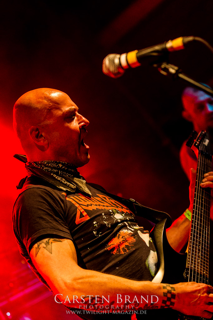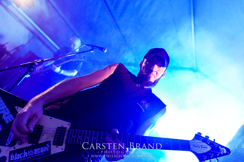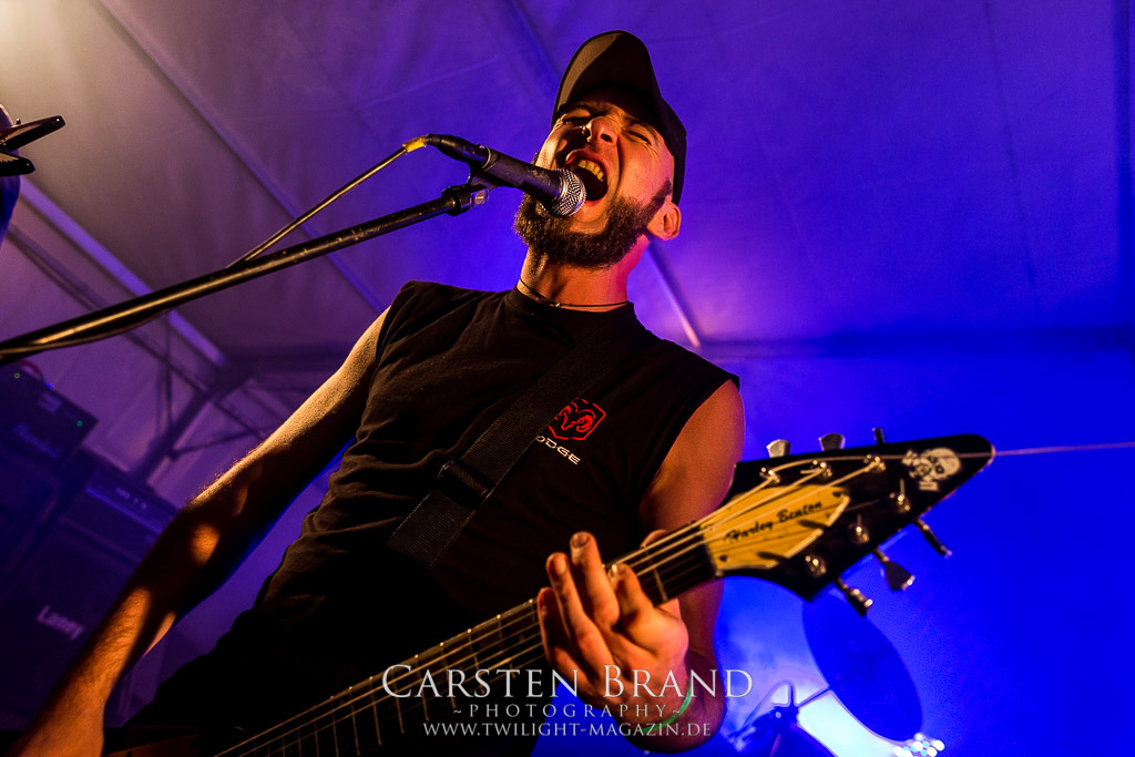 Die Magdeburger TORTURIZED haben in den letzten zehn Jahren eine gewaltige Entwicklung genommen, von der klassischen Old-School - Death Metal - Band zur modern ausgerichteten Tech-Death-Formation, und das komplett ohne Label im Rücken. Das jüngste Zeugnis "Omnivore" gleicht einer Urgewalt, die, gebündelt durch die spielerische Klasse der Musiker in kontrollierte Bahnen gelenkt wird. Das unterstreicht auch die beeindruckende halbe Stunde im Zelt, bei der der Sound heute leider nicht ganz so gut wie an den vorangegangenen Tagen ist. Dennoch würde ich mir zukünftig wieder mehr Bauch statt Kopf im Hause Torturized wünschen, sind Songs und handwerkliches Können zwar über jeden Zweifel erhaben, aber gerade Live wirkt mir das ganze mittlerweile zu klinisch, steril und klingt manchmal schon fast (Siggi, verzeih´ mir diesen Ausdruck!!!) wie Hipster - Death Metal. (JD)