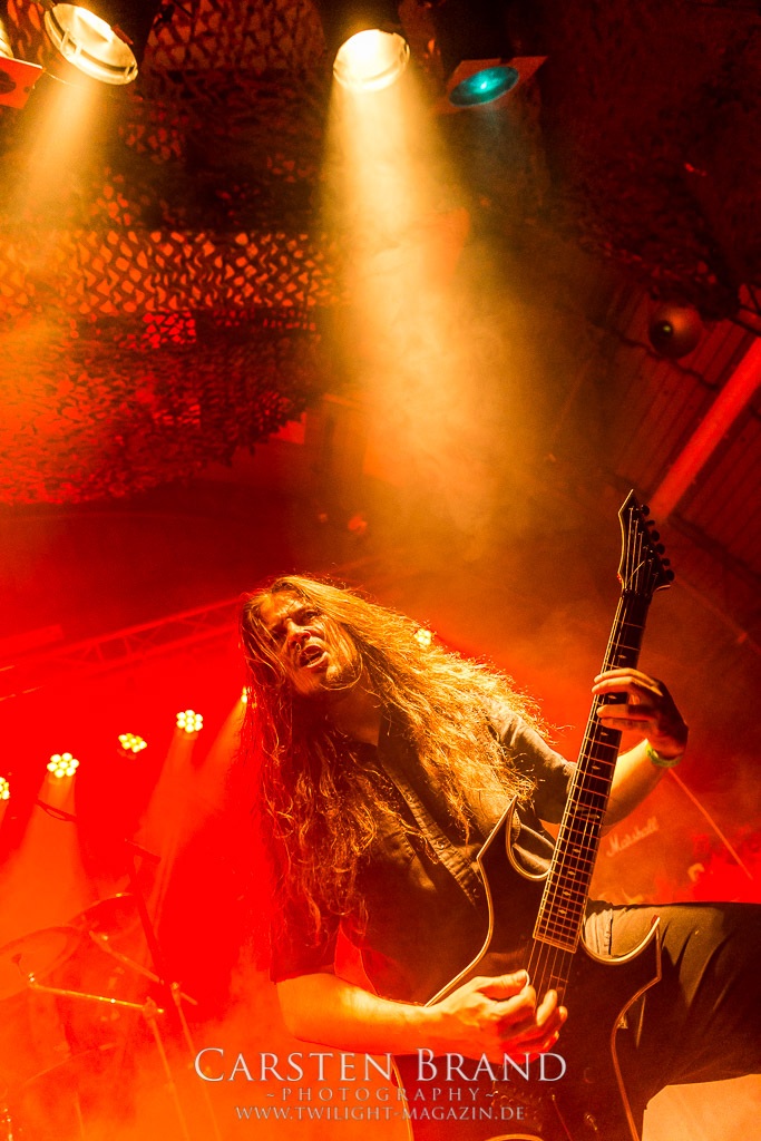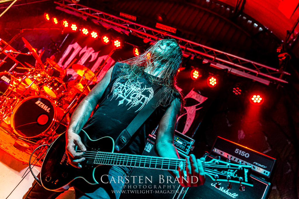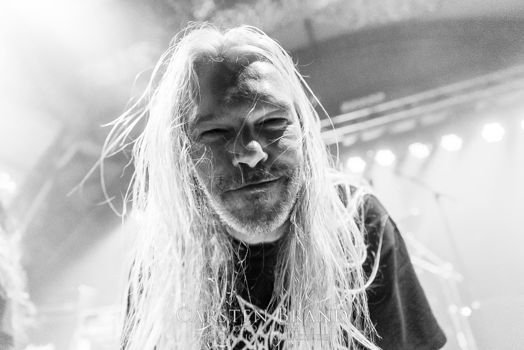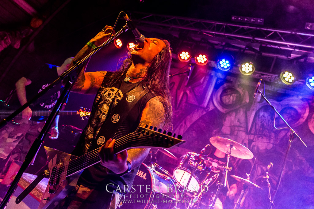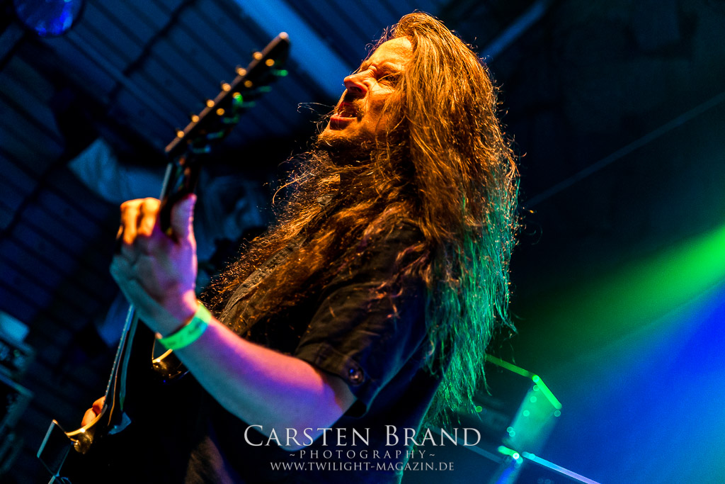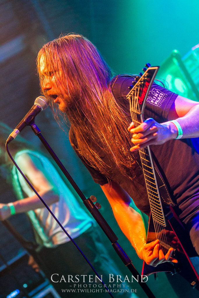 Paul Speckmann wirkt nicht nur optisch wie Vater Abraham, er ist tatsächlich der Methusalem der Death Metal - Szene. Zwar hat der MASTER-Frontmann musikalisch in über drei Dekaden meiner Ansicht nie die ganz hochkarätigen Klassiker erschaffen, sein Einfluss und vor allem seine musikalische Beständigkeit und Präsenz ist jedoch unbestritten und das rechtfertigt tatsächlich die hohe Position im Billing. Knochentrocken rotzt der Wahl-Tscheche mit seinen beiden Mitstreitern die tief im Thrash verwurzelten Brecher aus 35 Jahren Bandgeschichte aus dem Ärmel. Auch wenn ich dem alten Mann immer noch nachtrage, dass er Krabathor einst auseinanderdividiert hat, Master werden an diesem Abend ihrer Position gerecht.