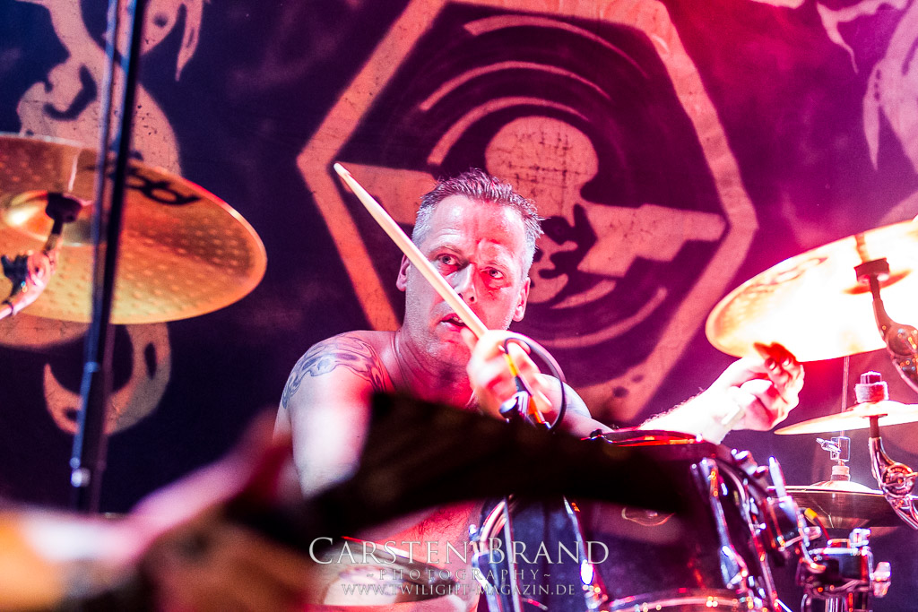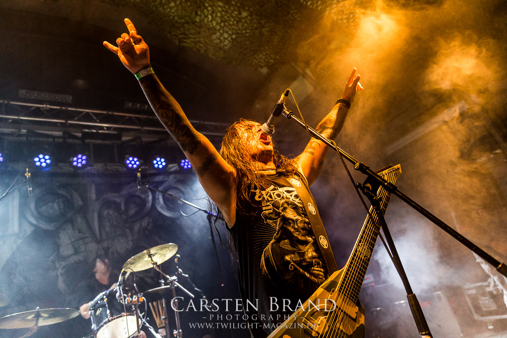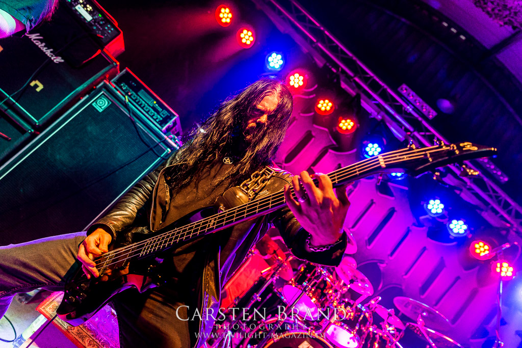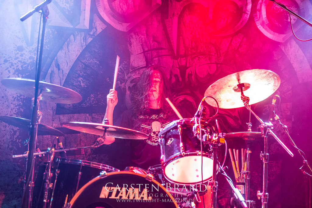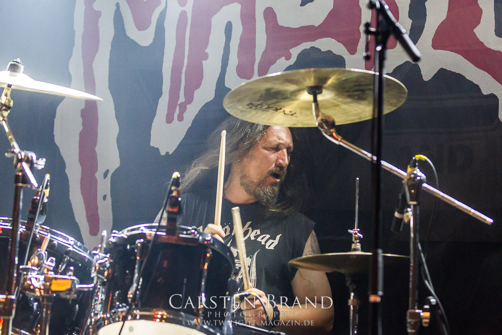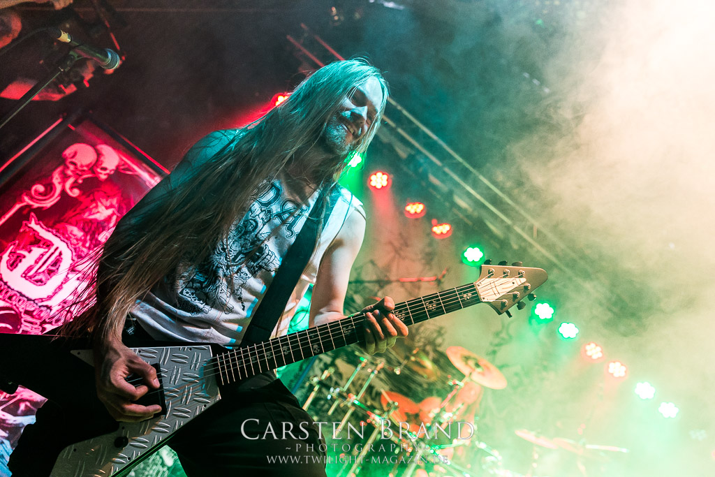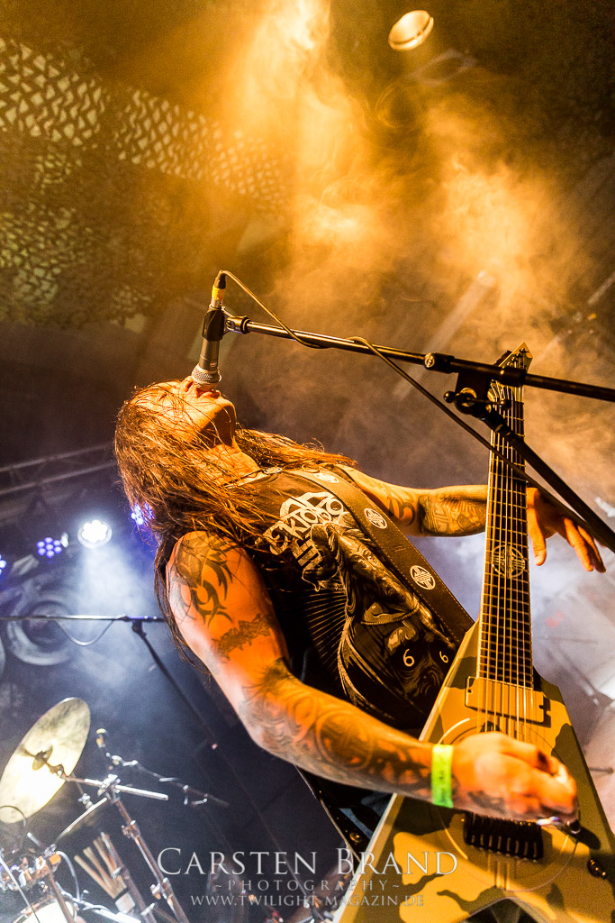 Paul Speckmann wirkt nicht nur optisch wie Vater Abraham, er ist tatsächlich der Methusalem der Death Metal - Szene. Zwar hat der MASTER-Frontmann musikalisch in über drei Dekaden meiner Ansicht nie die ganz hochkarätigen Klassiker erschaffen, sein Einfluss und vor allem seine musikalische Beständigkeit und Präsenz ist jedoch unbestritten und das rechtfertigt tatsächlich die hohe Position im Billing. Knochentrocken rotzt der Wahl-Tscheche mit seinen beiden Mitstreitern die tief im Thrash verwurzelten Brecher aus 35 Jahren Bandgeschichte aus dem Ärmel. Auch wenn ich dem alten Mann immer noch nachtrage, dass er Krabathor einst auseinanderdividiert hat, Master werden an diesem Abend ihrer Position gerecht.
