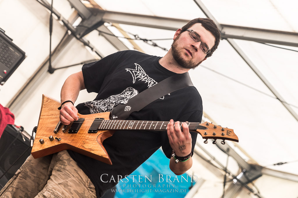 Kollege Linses Ohren sind ja einiges gewohnt. Als der mit den Worten „das ist mir zu krass“ aus dem Zelt kommt, in dem WOJCZECH gerade ihr Set begonnen haben, ist mein Interesse noch weiter geweckt. Das war eh´ schon da, denn Sänger Danilo übernimmt auch bei den von mir geschätzten Entrails Massacre die Vocals. Auf Bandcamp beschreiben die Rostocker ihren Sound als hardcoregrinddeathblackdoomcrustpunk. Das trifft es. Und tatsächlich klingen andere Bands wie Revel In Flesh oder Facebreaker, die zuvor gespielt haben im Vergleich fast schon nach Easy Listening. Die Mucke von Wojczech ist im besten Sinne chaotisch und radikal, ohne sich dabei in reinem Krach zu verlieren. Musikalisch ist mir das ein willkommener Farbtupfer im Billing.