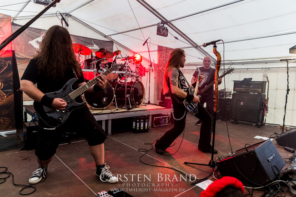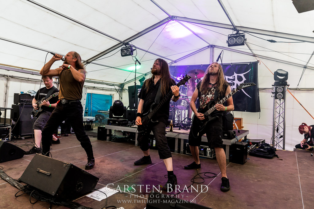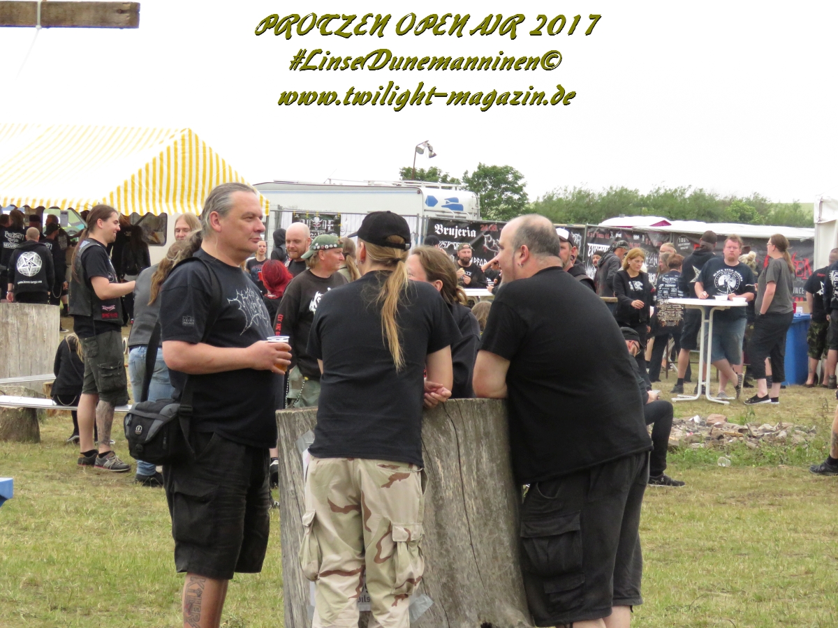 Puh, 20 Jahre Protzen Open Air, da lässt sich sogar der Deutsche Wetterdienst nicht lumpen. Mit seiner Unwetterwarnung für den Kreis Ostprignitz-Ruppin soll er am heutigen Anreisetag Recht behalten. Erste Vorboten machen sich bereits in Höhe Magdeburg auf der Warschauer Allee, besser bekannt als Autobahn 2, bemerkbar, als sei es der Leibhaftige höchst selbst, der mit jedem Kilometer den Himmel ein wenig mehr verfinstert und eine bleierne, alles erdrückende Schwüle unaufhaltsam durch die Lüftungsschlitze meines Gefährts zu schicken scheint. Auf dem letzten Viertel meiner bis dahin reibungslos verlaufenen Anreise wähne mich schon fast in Sicherheit und freue mich schon, mein Zelt vielleicht doch noch vor der großen Flut aufbauen zu können, als mich der Stau-Troll kurz vor dem Dreieck Werder erwischt, um mich danach unmittelbar in eine unheilvolle, schwarze Wetter-Wand zu treiben, in der Thor seinen Hammer ungestüm schwingt, Zeus Blitz um Blitz vom Olymp herab schleudert und Petrus sintflutartig seine Schleusen öffnet. Die letzten Kilometer auf der Autobahn werden zum Kampf mit den Elementen, der neben Fahrkunst auch die Vitalität der Bäume am Rande der Autobahn testet und die jahrelangen Planungen deutscher Siedlungswasserwirtschafts-Ingenieure mächtig auf die Probe stellt. Aber im Gegensatz zu den frühen Vögeln, welche sich seit den Morgenstunden auf dem Deadland-Gelände tummeln, befinde ich mich in meinem faradayschen Käfig wenigstens im Trockenen. Nach den letztjährigen Glutofen-Temperaturen nun also die Sintflut ausgerechnet zum Jubileum, denke ich mir noch, nachdem die Unwetter-Front vorüber gezogen ist und ich bei trockener aber kaum weniger grimmiger Witterung endlich das "Wohnzimmer" für die kommenden drei Tage erreiche. Ein schlechtes Omen? Weit gefehlt, das Wetter wird an diesem Wochenende zwar äußerst launisch und wechselhaft bleiben aber Crew, Bands und Fans kommen nicht nach Protzen, um Trübsal zu blasen, sondern um den Heavy Metal zu zelebrieren, zu feiern und zu huldigen. Und da ist für (schlechtes) Wetter nun mal kein Platz.