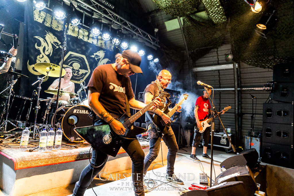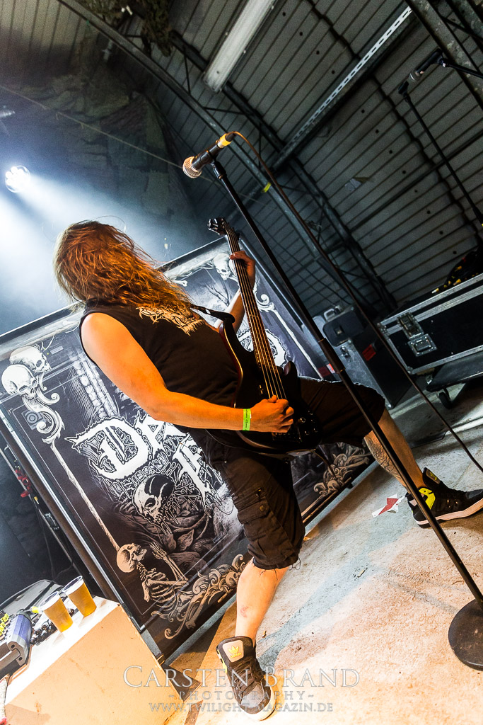 Ich gebe offen zu, dass erst die Absage von Haemorrhage und die damit verbundene Bekanntgabe von VIU DRAKH als Ersatz dazu geführt hatten, dass der Besuch des diesjährigen Protzen-Jubileums für mich unverzichtbar wurde. Vielen jüngeren Lesern und Besuchern dürften die Hallenser nahezu unbekannt sein. Sie waren jedoch um die Jahrtausendwende eine der aktivsten und besten deutschen Live-Bands und noch dazu eine der musikalisch außergewöhnlichsten Bands in der Schnittmenge zwischen Death Metal, Crust, Grind und Punk. Das 2002er Album "Death Riff Society" ist ein bis heute kaum gewürdigter, vergessener und unerreichter Klassiker, der die Band seinerzeit sogar auf Europatour mit Cannibal Corpse führte. Danach folgte ein Split auf Raten und teilweise die Fortführung mit den nicht weniger genialen Korades. Und dass die Band nun ausgerechnet auf dem diesjährigen Open Air ihr Comeback feiert ist dem alljährlichen, gebetsmühlenartigen Einreden von Veranstalter Mario auf alle Beteiligten des Origina l- Line-Up´s zu verdanken, eine Beharrlichkeit, die man ihm gar nicht hoch genug anrechnen kann. Doch kann die Band aus dem Stand tatsächlich die gleiche Explosivität wie vor mehr als einer Dekade auf die Bretter bringen oder sollte eine große Enttäuschung anstehen? Erste, durchgesickerte Stimmen vom Vorabend, an dem Viu Drakh mit ihren Freunden von Malignant Turmour daheim eine Generalprobe veranstaltet hatten, verhießen Gutes, ließen aber die Spannung im Vorfeld nur noch weiter ins Unermessliche steigen. Doch schon mit den ersten Takten macht das Quartett klar, dass sie es immer noch können. Mit rasiermesserscharfem, krachendem Sound knallen Viu Drakh dem Publikum Klassiker für Klassiker vor den Latz, als wären sie nie weg gewesen. "Death Riff Society", "Mutant Gods", "Caravan", "Dead Or Alive", "Black Milk" vom "Take No Prisoners..."-Album, ja sogar "Noize Militia" vom Demo der Vorgängerband TinPanAlley ist in der Setlist und am Ende fehlt auch die obligatorische Motörhead-Hymne "Ace Of Spades" natürlich nicht. Dieser Gig ist Zeitreise und Frischzellenkur zugleich. Während der nachdrücklichen Vorstellung verjünge ich mich mal eben locker um 15 Jahre, um mich hernach sofort wieder um 20 Jahre gealtert zu fühlen. Was bleibt ist pures Glück und ein breites Grinsen angesichts dieser Vorstellung, sowohl bei den Musikern auf der Bühne, wie auch bei den Fans. Dieser Gig ist eine Machtdemonstration. Fortsetzung folgt? Eigentlich führt kein weg daran vorbei allerdings dürfte es wohl eher unwahrscheinlich sein. Aber ich bin unheimlich glücklich und dankbar, dass ich Viu Drakh und ihre Songs noch einmal live erleben durfte, noch dazu in dieser Art und Weise. (JD)