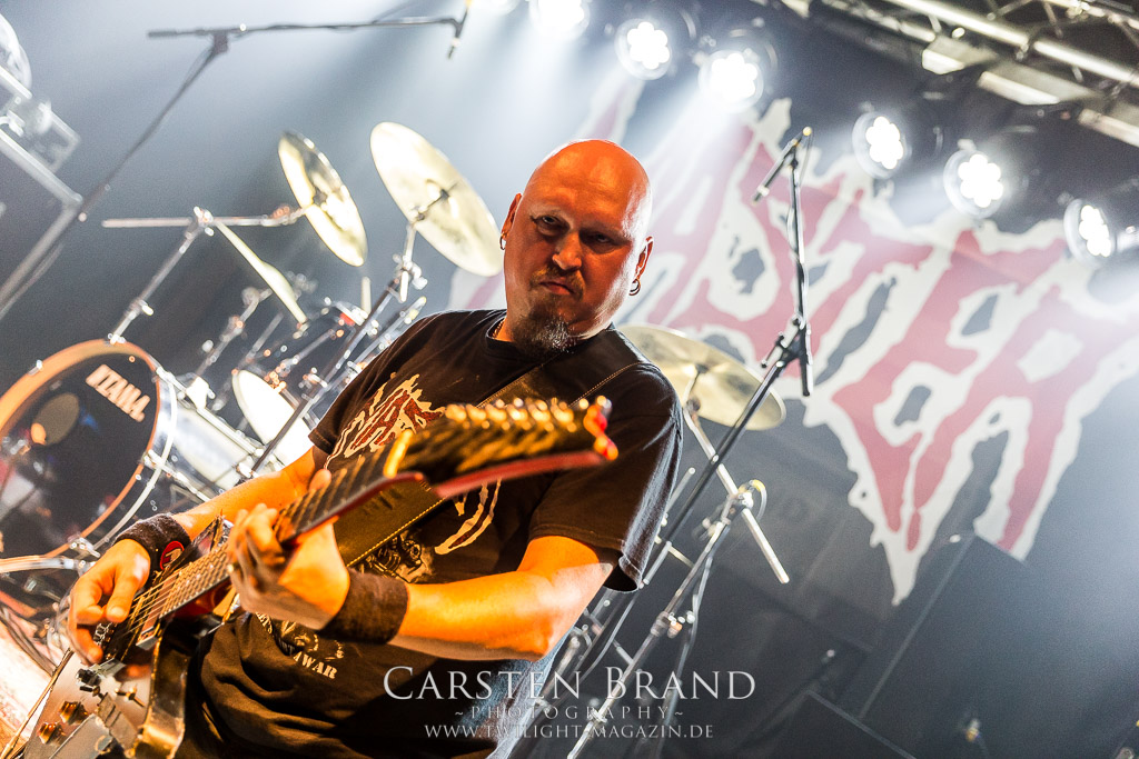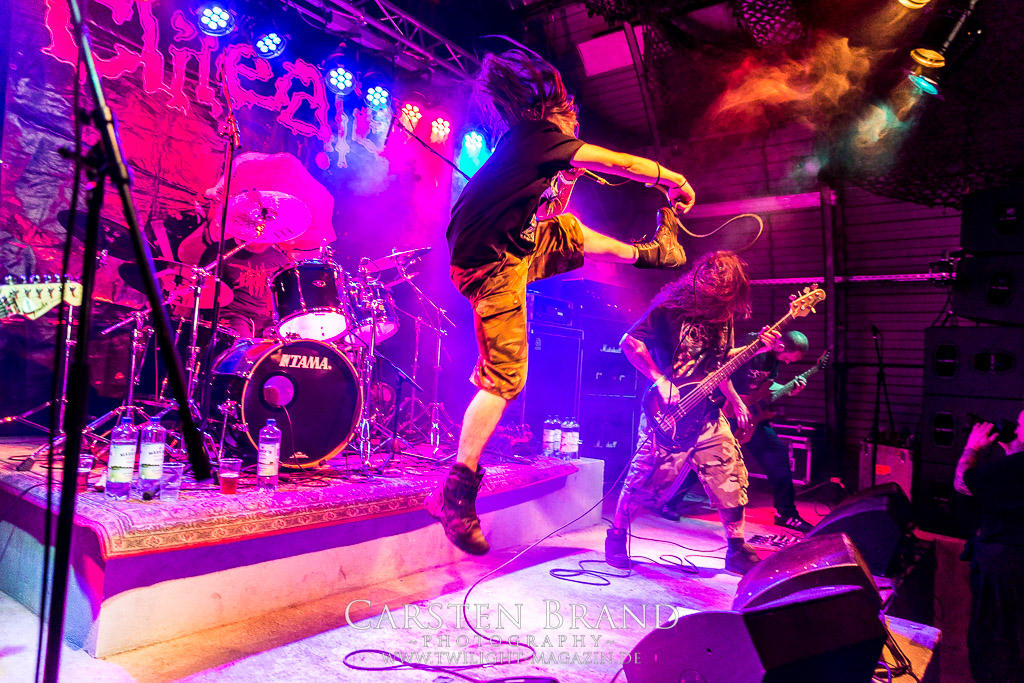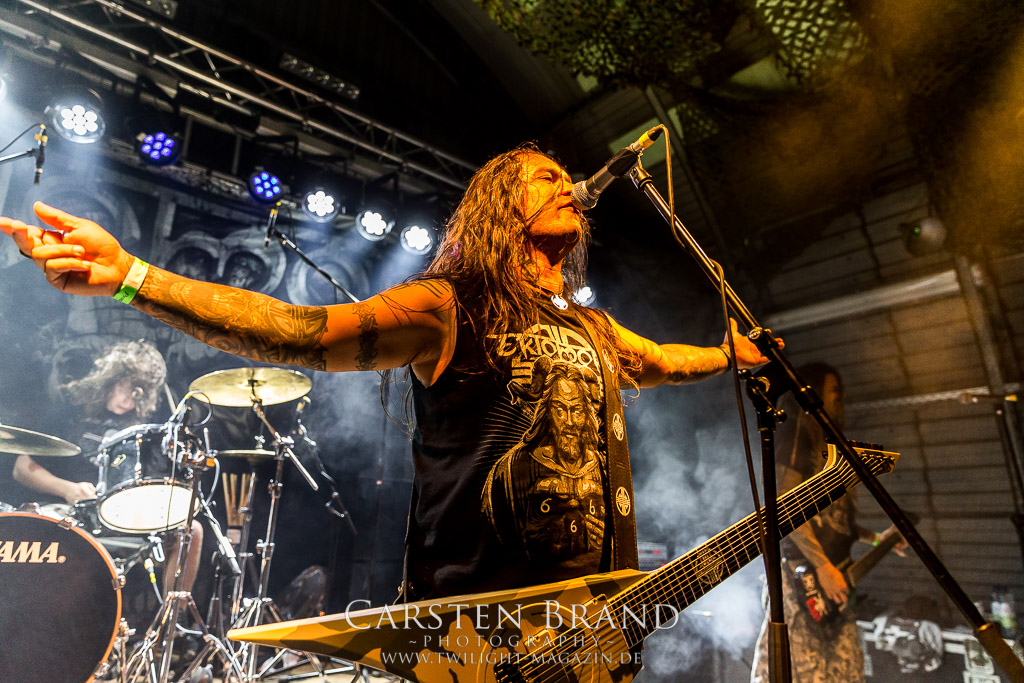 Dieser Slot war verflucht. Zunächst sagen Misery Index alle Europa-Gigs ab und dann wird es auch nichts mit dem Auftritt der ehemaligen Massacre-Mucker Kam Lee und Rick Rozz. Grund hier scheint Ego-Gewichse zu sein. Die Veranstalter sind gut vernetzt und so zaubern sie sehr kurzfristig mit SCHIRENC PLAYS PUNGENT STENCH einen würdigen Ersatz aus dem Hut. Die haben ja selber leidvolle Erfahrungen mit dem Weiterführen einer Band unter dem ursprünglichen Namen... Der Gestank im Hangar war für die meisten am ersten Abend noch nicht beißend genug, aber Schirenc Plays Pungent Stench sorgen dafür, dass sich der Schweißgeruch noch einmal potenziert. Wie schon 2014 liefern die Österreicher einen wirklich guten Gig ab bei dem die Stimmung vortrefflich auf das Publikum überspringt.(TT)