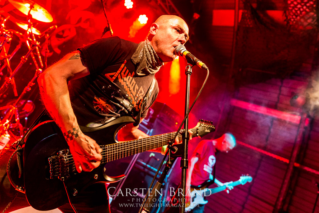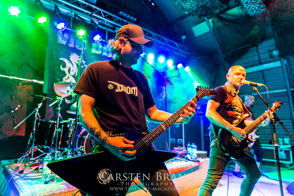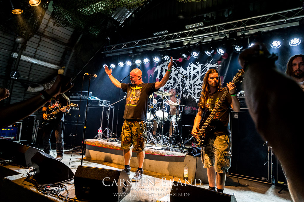 Dass die Band ihr stilistisches Alleinstellungsmerkmal, nämlich die ungarischen Folklore-Einflüsse, auf ihren zukünftigen Veröffentlichungen zunehmend vernachlässigte, führte nicht nur dazu, dass sich das Quartett spätestens ab "Destroy" zunehmend aus meiner Hörweite verabschiedete, sondern, dass ich mit Ektomorf bis heute vornehmlich Musik verbinde, die wie Sepultura klingt, als diese schon scheiße waren. Doch die Band funktioniert hervorragend und sogar als Co-Headliner ziehen sie die Leute nicht nur in Scharen in den Hangar, sondern wissen diese auch noch amtlich zum Toben zu bringen, so dass ich neidlos anerkennen muss, dass diese Formation, wenn sie auch musikalisch nicht originell sein mag, nach wie vor über überragende Live-Qualitäten verfügt. Und auch die Streitmacht Bergisch´ Land weiß rund drei Stunden zuvor zu überzeugen. Der melodische Death Metal mit deutschen Texten ist mittlerweile erfreulich weit entfernt von Pagan Metal - Klischees und wildert stattdessen in Amon Amarth´schen gefilden, aus der Zeit, als diese noch musikalisch ernstzunehmen waren. Somit muss ich auch hier konstatieren, dass Obscurity, die wie das Protzen in diesem Jahr bereits den zwanzigsten Geburtstag feiern, sich selbst mit diesem durchaus abgefeierten Auftritt ein schönes Präsent machen, dass musikalisch eine weitere Abwechslung zwischen all dem Geballer ist. Was sonst noch passierte? Nachdem Auftritt der emsländischen Melodic-Deather ISLAY beginnt mit DISASTER K. F. W. im Zelt der Auftakt zum Abend der ostdeutschen Metal-Legenden. Auch wenn das seit 1985 aktive Quintett um den ehemaligen Reiter-Drummer Skeleton die Intensität ihres bärenstarken jüngsten Albums "Pieces" nicht voll auf die Bühne bringen kann, so machen Songs wie "The Black Death" doch ordentlich Laune und bereiten den Boden, für das, was da noch kommen soll.