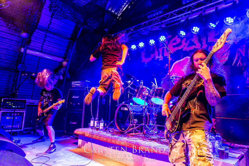 Die Schwaben von REVEL IN FLESH gastieren im Rahmen ihrer Mini-Tour mit FACEBREAKER in Protzen. Die deutschen Schwedenstahl-Anbeter sind seit ihrem letzten Auftritt 2015 wesentlich besser geworden und präsentieren einen amtlichen Abriss. Insgesamt kommen sie aber nach wie vor nicht über den Status einer - wenn auch sehr guten - Dismember-Gedächtniskapelle hinaus. Mir fehlt hier einfach das letzte, gewisse Etwas, was die schwedischen Kollegen LIK zweifelsohne haben. Immerhin, ihren deutschen Kollegen von Fleshcrawl haben Revel In Flesh mittlerweile den Rang ganz klar abgelaufen. Und sie gefallen mir auch einmal mehr besser als ihre Tourkollegen von Facebreaker, eine Schweden-Band, die so gar nicht nach typischen Schwedensound tönt. Knochentrocken, brutal und direkt ins Gesicht und irgendwie beliebig und austauschbar konnte mich das Quintett noch nie wirklich hinter dem Ofen hervor locken und ich denke das wird in diesem Leben auch nichts mehr.