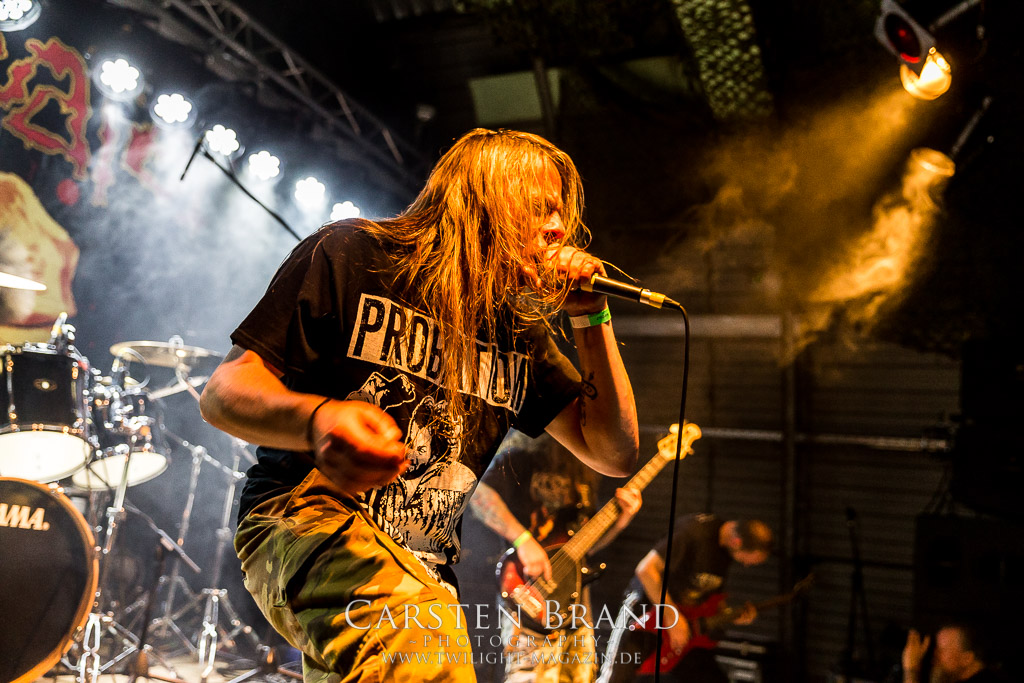 Die Protzen-Familie ist früh auf den Beinen und bereits bei der ersten Band am Samstag zahlreich im Hangar erschienen. TERRIBLE SICKNESS legen gleich "morgens" um zwölf Uhr Zeugnis darüber ab, wie talentiert und fit der deutsche Underground ist, bietet das Quintett doch genau die richtige Mischung aus Technik, Härte und Melodien. Fronter Flo ist eine imponierende Erscheinung und wütet mit seinem eindrucksvollen Organ derart über die Bühne, dass eine Freundin konstatiert: "Wenn ich den neben mir auf der Bühne hätte, dann hätte ich Angst." So muss Death Metal sein.