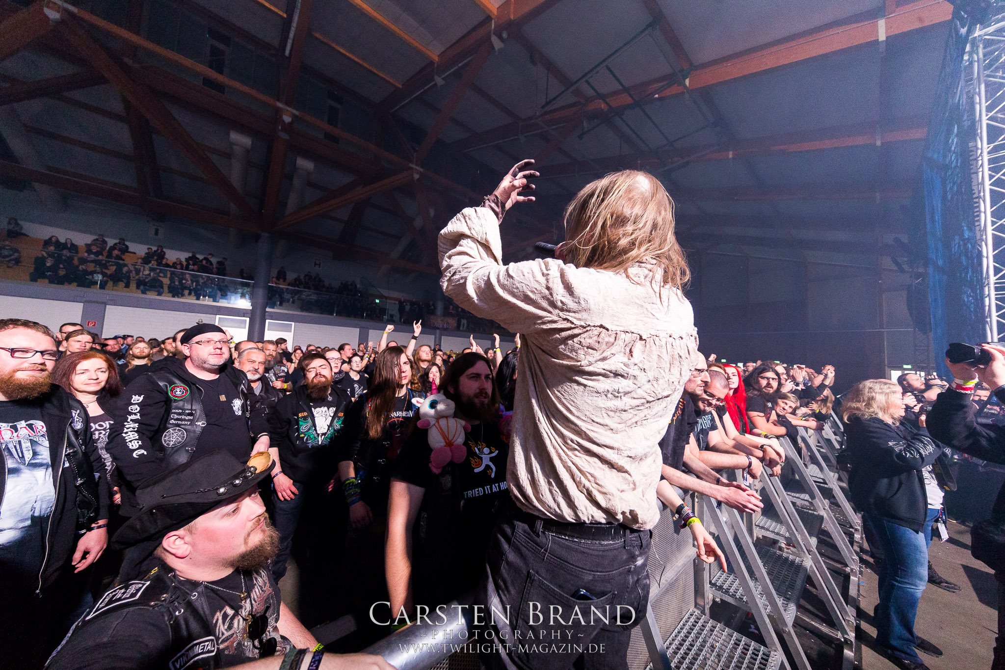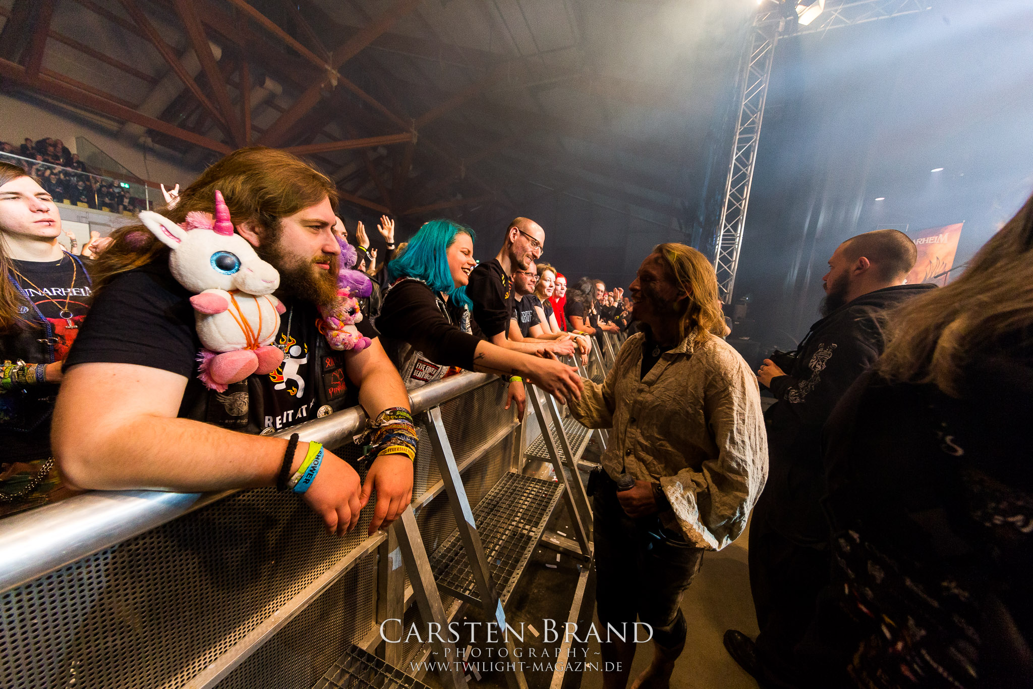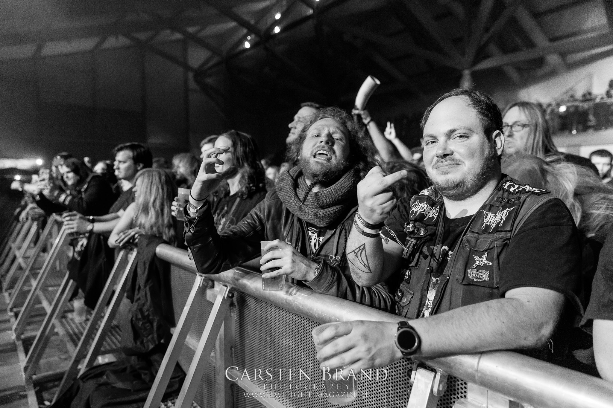 Auch VARG haben ein spezielles Set vorbereitet und spielen bei ihrem ersten Auftritt 2019 im normalen Set nur Songs ihres ersten Albums „Wolfszeit“, was die Fans der ersten Stunde natürlich erfreut und vor die Bühne zieht. Spätestens bei der aufgrund seiner Konnotation sehr selten gespielten Zugabe „Schildfront“ sind die Anhänger natürlich voll dabei, während nicht wenige den Hype eher stoisch verfolgen.