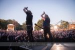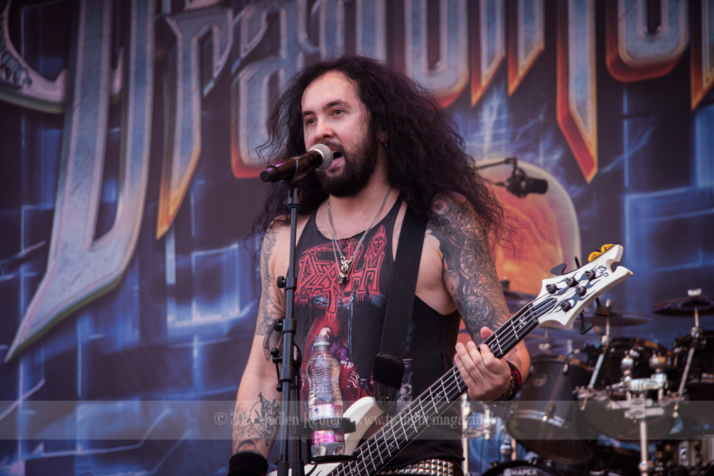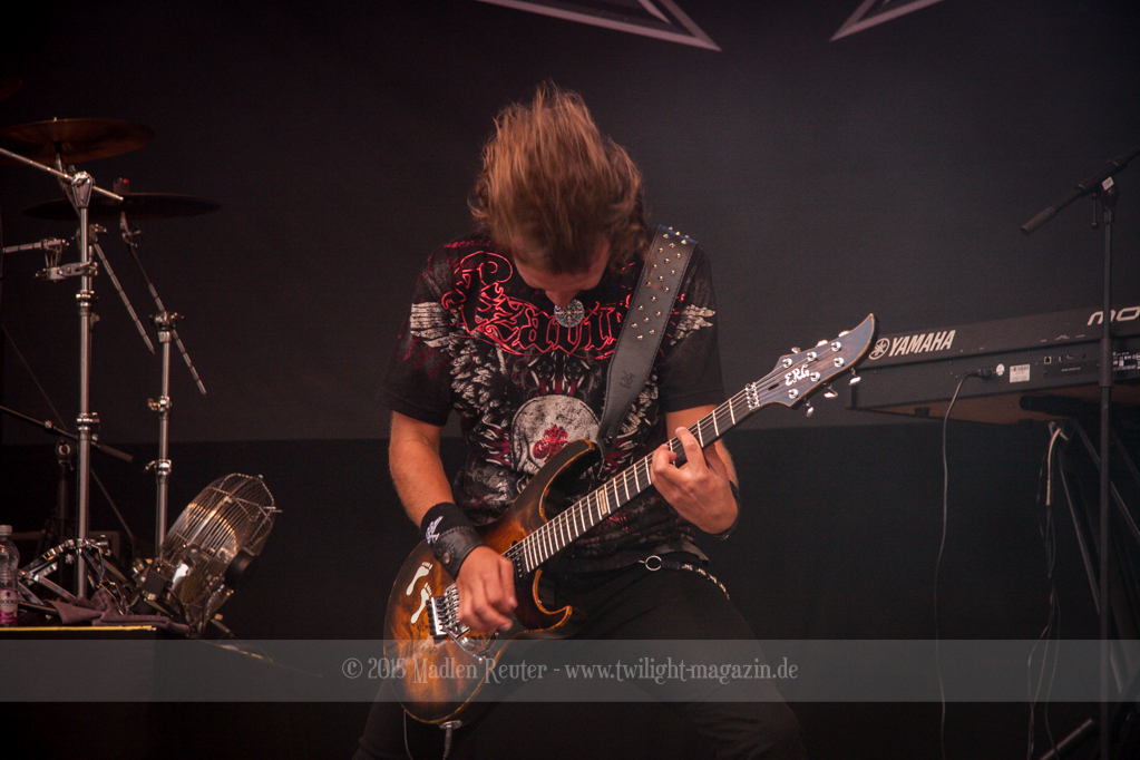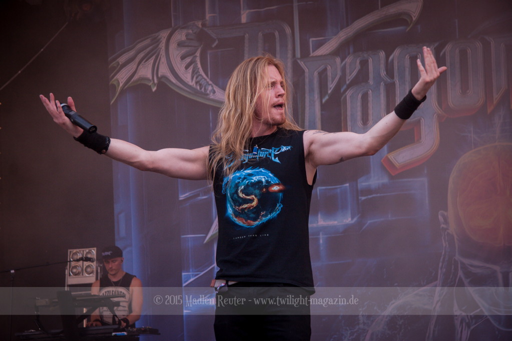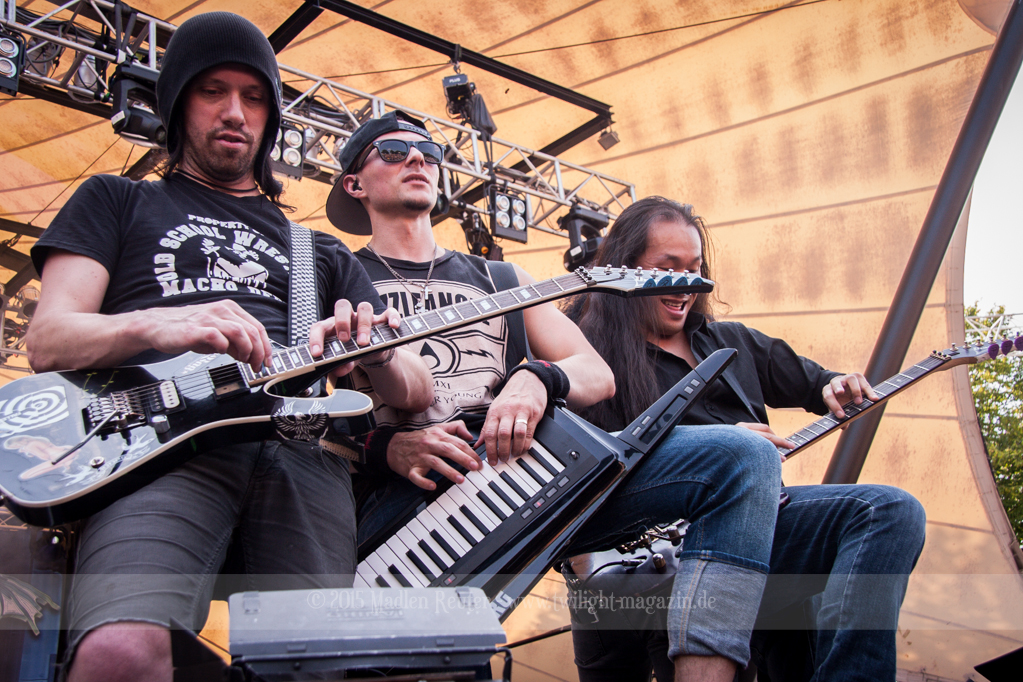 Da ich nun aber richtig angekommen war, konnte es mit DRAGONFORCE weitergehen. Ach halt, Moment. Leider konnte die örtliche Technik die Hitze genauso ungut vertragen, wie manch ein Festivalbesucher. Die fast 40° hatten dafür gesorgt, dass eines der Mischpulte aufgeraucht war. Somit hatte sich der Auftritt etwas verzögert. Der Auftritt selbst lief dann wie geschmiert. Die Fans, sowie die Band selbst, haben ordentlich Gas gegeben. Bei so manch einem Solo taten mir nur vom Zuhören die Flossen weh – Respekt an die Gitarristen.