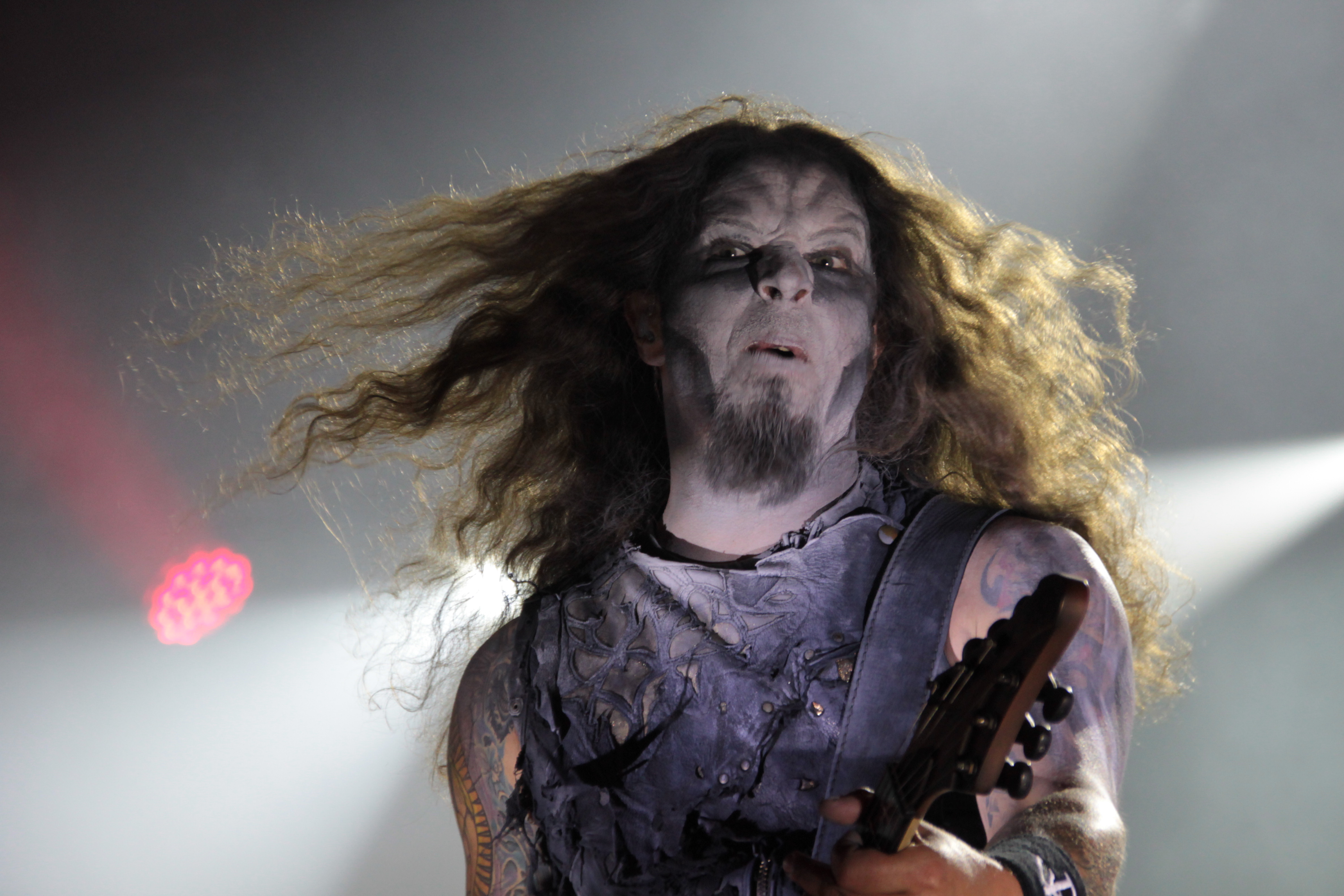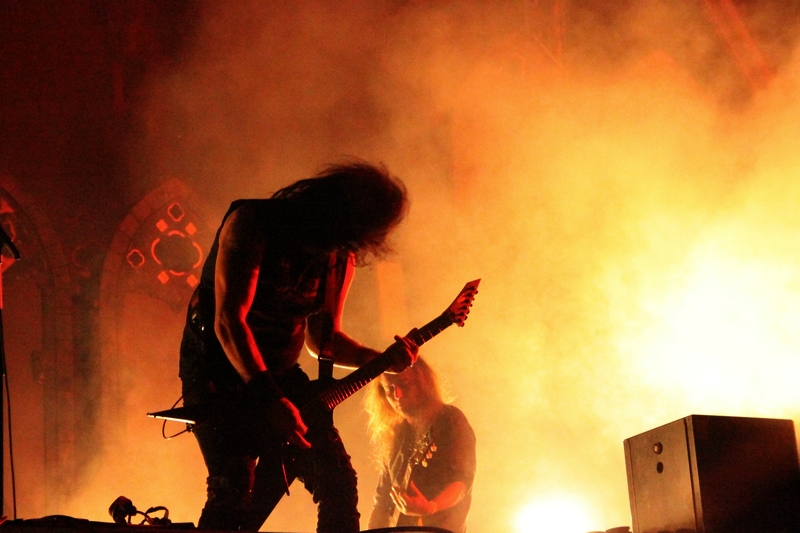 Kurz vor Einbruch der Dunkelheit war die Zeit reif für die Pioniere des Gothic Death Metal von PARADISE LOST. Während der Kollege Lison schon beim Aussprechen des Namens schwitzige Hände bekommt, konnte mich die Band seit „Icon“ eigentlich nicht mehr so richtig begeistern. Mit „Host“ ging die Band musikalisch durch ein tiefes Tal und ich ging seinerzeit an ihrer Seite und kämpfte mich durch die dazugehörige Tour – im Vorprogramm darkwavten seinerzeit KREATOR. Schön war es nicht, aber die Zeiten sind ja vorbei. Trotzdem konnten mich PARADISE LOST das letzte Mal live so richtig überzeugen als sie als Support auf SEPULTURAs „Chaos A.D.“ Tour die Music Hall in Hannover erschütterten. Entsprechend paarte sich an diesem Abend Spannung mit Vorfreude auf den Gig der Briten. Los ging es mit „No Hope In Sight“ vom „The Plague Within“ Album, bevor sich Holmes & Co durch „Blood and Chaos“ vom aktuellen Longplayer „Medusa“ quälten. Gitarrist Aaron Aedy schunkelte sich verzückt dreinschauend durch seine Riffs, während Basser Steve Edmondson und Klampfer Gregor Mackintosh mit schmerzverzerrten Gesichtern herumstanden.