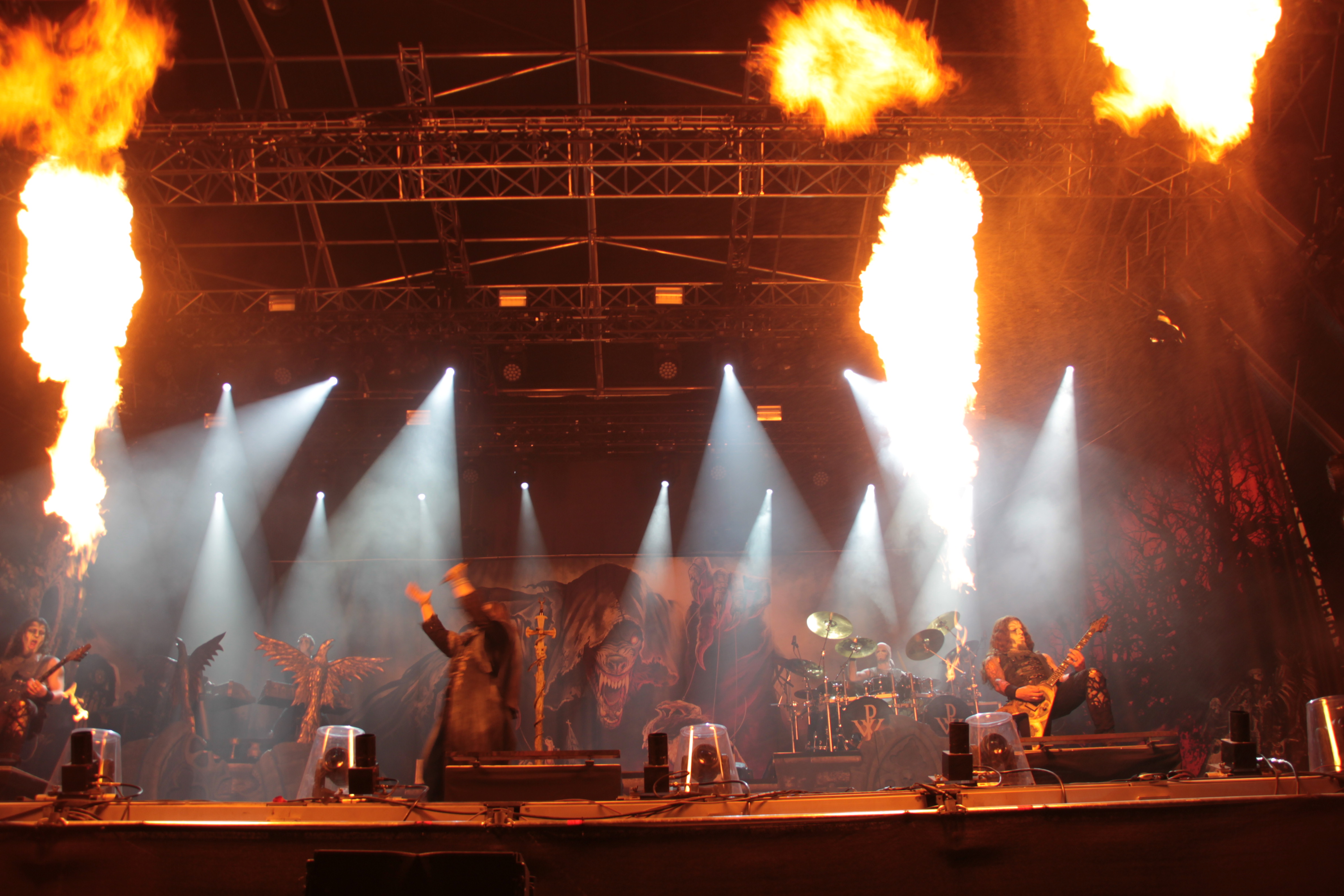 Kurz vor Elf war dann die Zeit für den heutigen Headliner gekommen: POWERWOLF. Die Wölfe hatten ihr neues Album „Sacraments of Sin“ im Gepäck, boten ihren Jüngern jedoch vor allem Altbekanntes. POWERWOLF liefern tatsächlich eine großartige Show ab. Zahlreiche Backdrops, die ausgefeilten Bühnenoutfits, gute Choreographie, Explosionen und Feuer: Die Wölfe ziehen an diesem Abend alle Register.