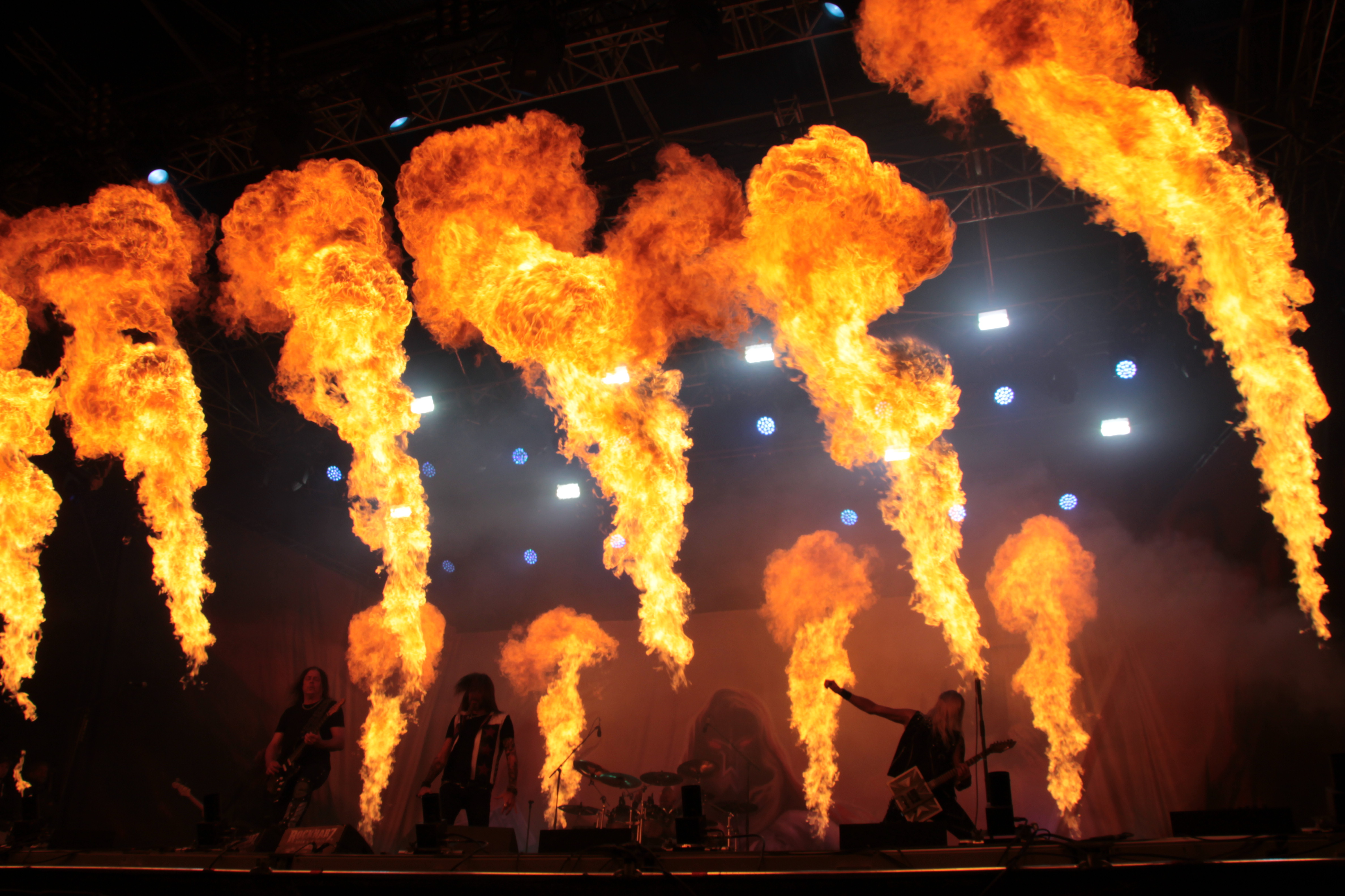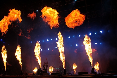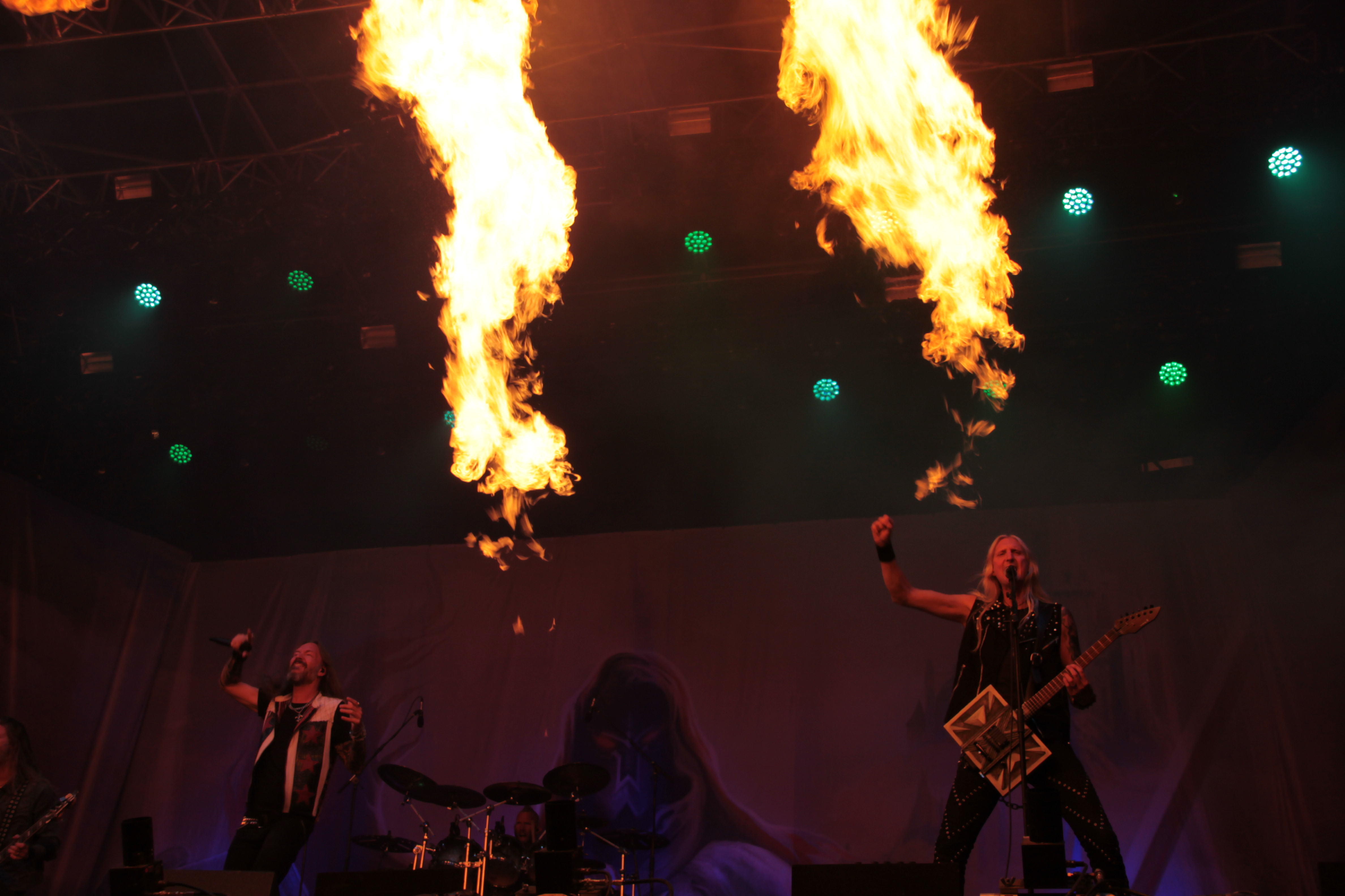 Und getreu dem heutigen Motto, knallte und loderte es an allen Ecken und Enden der Bühne und sogar der Mischertürme. Das war dann aber auch tatsächlich schon der Höhepunkt der Show. Zwar zeigte sich vor allem Oscar durchaus spielfreudig, aber insgesamt wirkte die Band sehr routiniert und statisch. Die Songauswahl war für meinen Geschmack nicht wirklich gelungen und nachdem gerade der Geburtstag des Debüts mit Re-Release usw. gefeiert wurde, fehlten mit Songs wie „The Dragon lies Bleeding“ oder „Steel Meets Steel“ in der Playlist. Natürlich gaben auch Songs wie „Hammer High“ oder „Last Man Standing“ genügen Anlass zum headbangen, trotzdem vermisste ich z.B. „Templars of Steel“. Mit dem obligatorischen „Hearts on Fire“ fand die Band zumindest ein versöhnliches Ende. Fazit: Mit den Headlinern der Vortage konnten HAMMERFALL nicht mithalten. Ihr Auftritt lebte vor allem von der Feuershow, die aber auch jeden anderen Auftritt des Festivals aufgewertet hätte. Die Band selbst konnte mich mit ihrer Show nicht überzeugen. Schade.