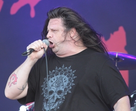 Fünf Minuten Zeit für den Seitenwechsel und schon warfen CANNIBAL CORPSE den Motor an, um die zahlreichen Death Metal Fans vor der Dark Stage einfach überzuwalzen. In den fordersten Reihen vor der Rock Stage waren diverse Die Hard Fans auszumachen und diese lechzten nur so nach Blut und Gedärmen in musikalischer Form. Und „Corpsegrinder“ & Co enttäuschten die hungrige Meute nicht. Gesprochen wurde wenig, stattdessen ging es mit Hochgeschwindigkeit durchs Set und Frontgrunzer „Corpsegrinder“ stellte den Haarventilator an und brüllte aus tiefster Brust ins Mikro.