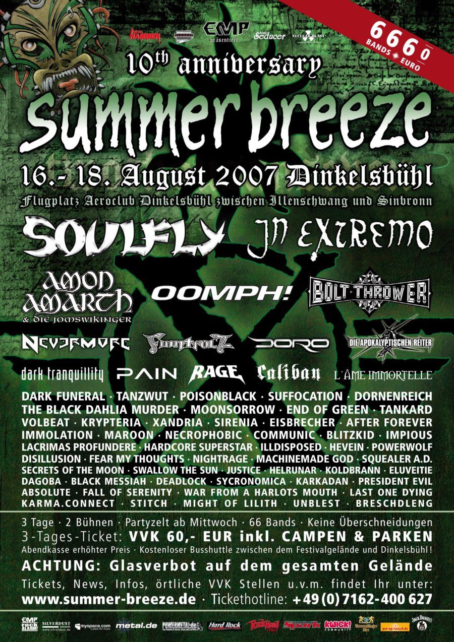 BRESCHDLENG, UNBLEST, MIGHT OF LILITH, STITCH, KARMA.CONNECT, LAST ONE DYING, JUSTICE, POWERWOLF, IMPIOUS, STITCH, SWALLOW THE SUN, FEAR MY THOUGHTS, IMMOLATION, LACRIMAS PROFUNDERE, AFTER FOREVER, KRYPTERIA, RAGE, THE BLACK DAHLIA MURDER, DORO, SUFFOCATION, NEVERMORE, TANZWUT, AMON AMARTH, DORNENREICH, DEADLOCK, NIGHTRAGE, FALL OF SERENITY, WAR FROM A HARLOTS MOUTH, KARKADAN, DAGOBA, ELUVEITIE, KOLDBRANN, ILLDISPOSED, DISILLUSION, EISBRECHER, HEVEIN, SIRENIA, NECROPHOBIC, L'ÂME IMMORTELLE, END OF GREEN, FINNTROLL, VOLBEAT, BOLT THROWER, POISONBLACK, IN EXTREMO, DARK FUNERAL, BLACK MESSIAH, SQUEALER, ABSOLUTE, PRESIDENT EVIL, SYCRONOMICA, HELRUNAR, JUSTICE, MACHINEMADE GOD, SECRETS OF THE MOON, MAROON, COMMUNIC, BLITZKID, HARDCORE SUPERSTAR, XANDRIA, DIE APOKALYPTISCHEN REITER, TANKARD, DARK TRANQUILLITY, MOONSORROW, OOMPH!, CALIBAN, SOULFLY, PAIN