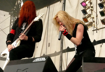 Auch war Frontscreamerin Angela nach eigenen Angaben "froh, mal wieder zu Hause zu sein" – schaltete nach wenigen deutschen Ansagen aber schnell wieder auf Englisch um, wahrscheinlich den Bandkollegen zuliebe. Egal, große Reden, seien sie deutsch oder englisch, benötigte die Band ohnehin nicht: Mit Titeln von "In This Shallow Grave" und "My Apocalypse" bis "Ravenous" gab’s nicht nur einen ausgewogenen Rundumschlag durch die eigene Diskografie, sondern auch ordentlich eins auf die Zwölf! Im Nu wurde der Platz vor der Main Stage zu einem kochenden Körperkessel, in dem man sich vor Crowdsurfern kaum retten konnte, so dass die Security vorn vorm Fotografen wortwörtlich alle Hände voll zu tun hatte. Den in den Pausen immer wieder aufflammenden "Ausziehen!"-Rufen wich Teufelsröhre Angela Gossow in ihrem knappen, schwarzen Outfit zunächst aus (wenn auch zugegebenermaßen recht lahm: "Meintet ihr unseren Bassisten?"). Wer es bis zum Schluss aushalten konnte, durfte ihr aber wenigstens zusehen, wie sie das Shirt ein wenig lüftete. Wen weder diese Nabelschau, noch die Musik mitreißen konnte, dem war dann auch nicht mehr zu helfen. Arch Enemy sind wieder komplett. Das war nach diesem fulminanten Auftritt schlicht nicht zu leugnen.